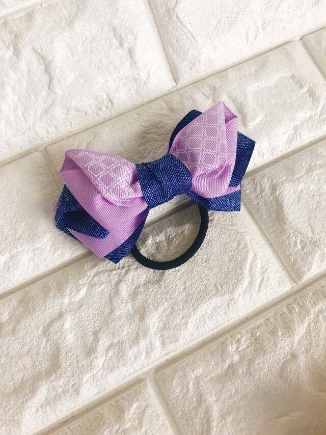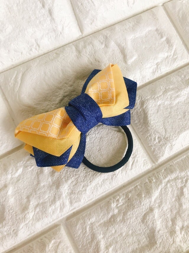 明るいモロッカン柄3色×デニムのバタフライ型リボンのヘアゴム