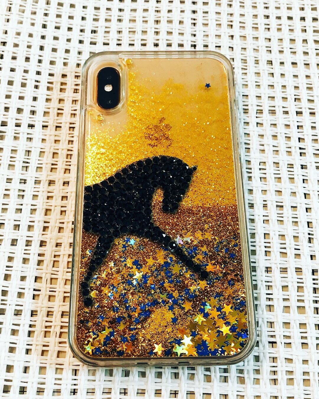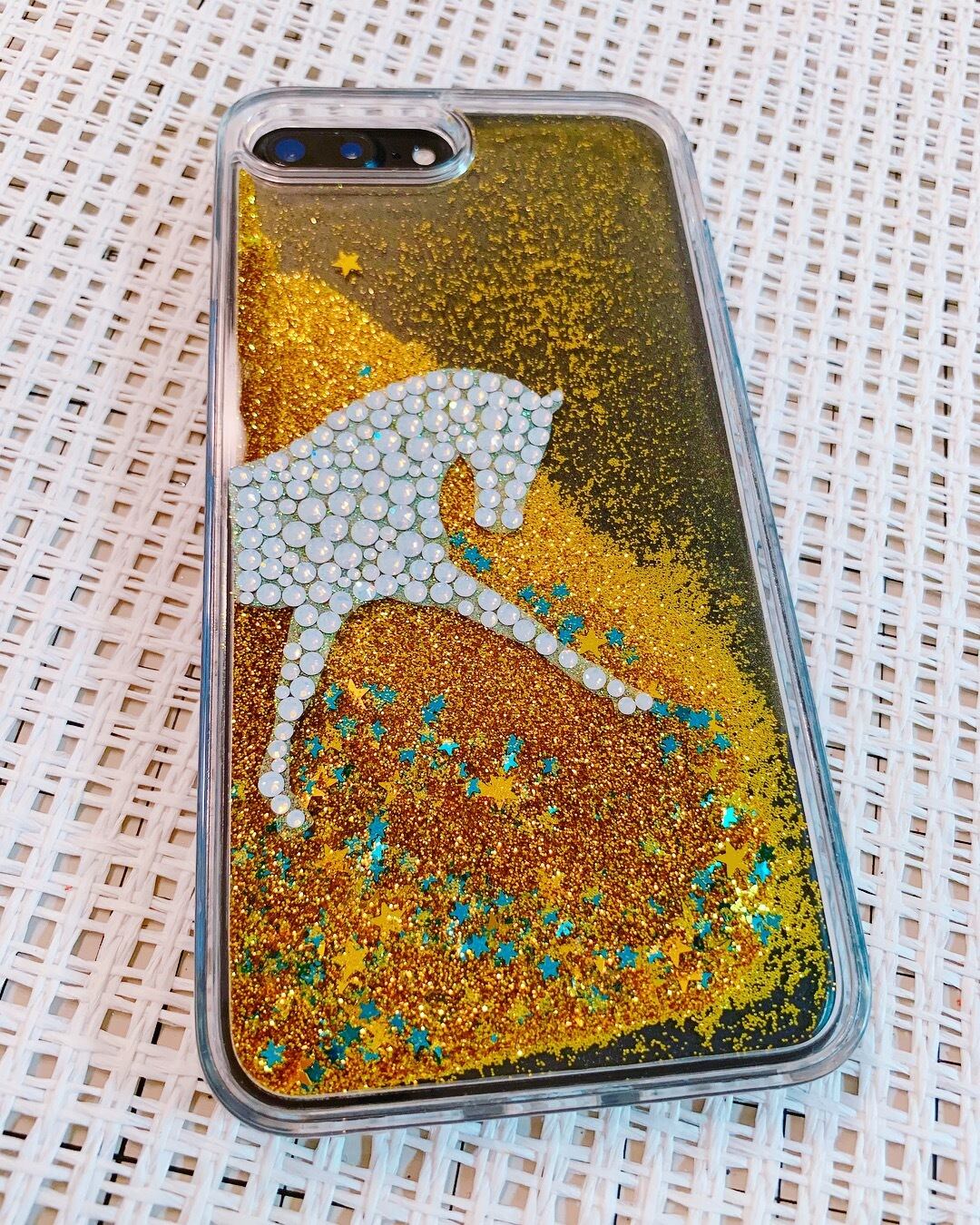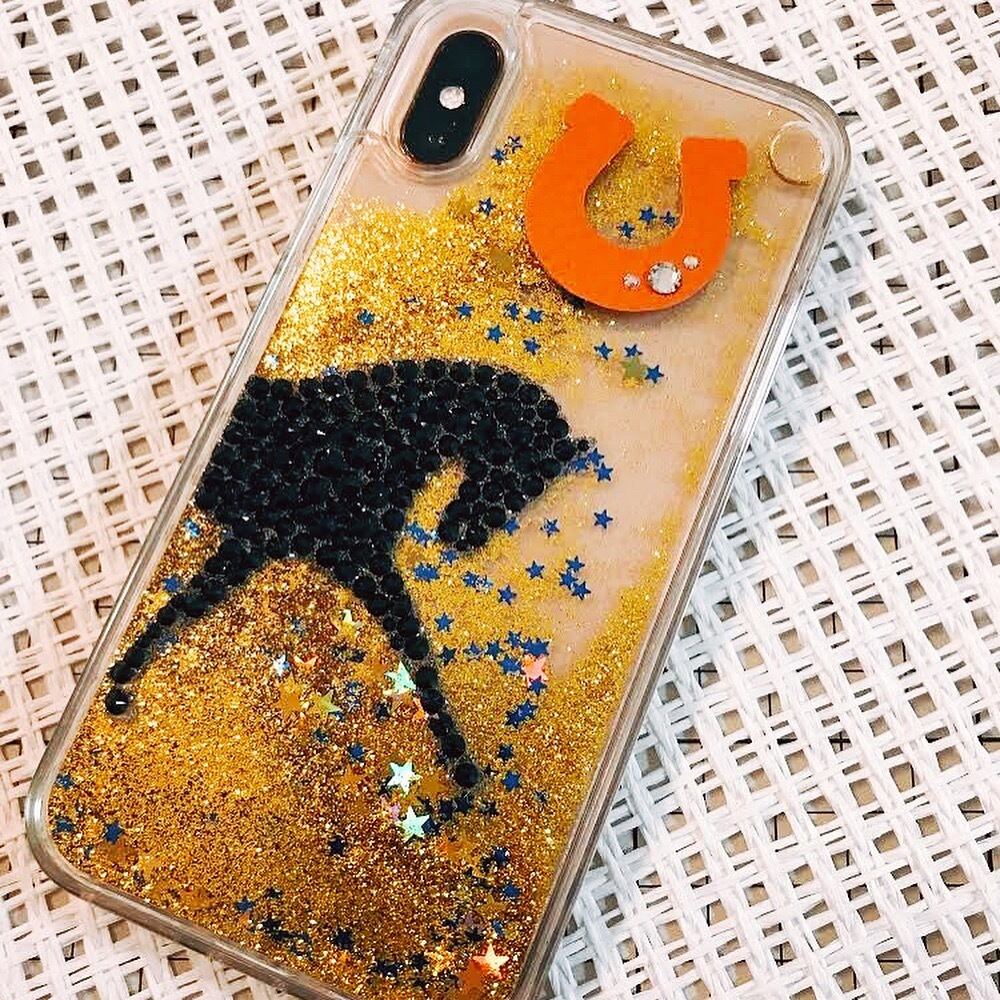 流れるキラキラフレークグリッターのiPhoneケースと、スワロフスキーの輝くドレッサージュホースのコラボ商品です!