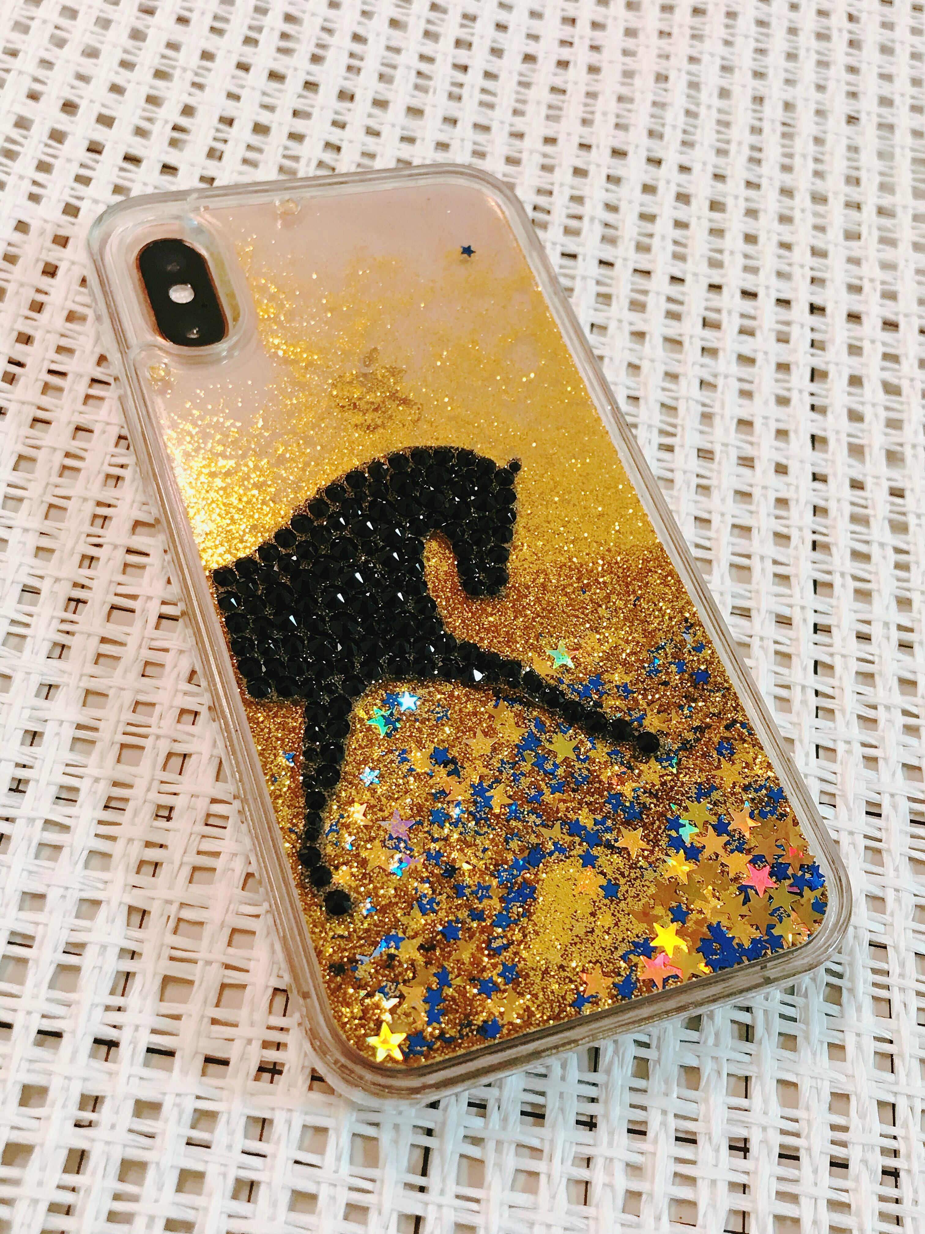 iPhone本体のカラーがブラックの方は、ホワイトのお馬さんがおススメですが、イエローゴールドのラメが敷き詰められた状態では、ピアノブラックのお馬さんも美しく浮かび上がります。