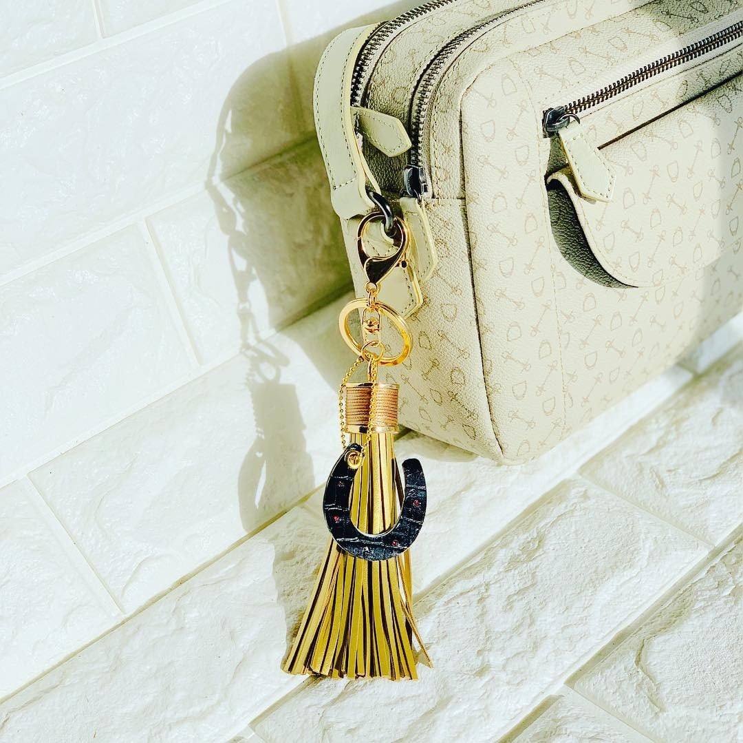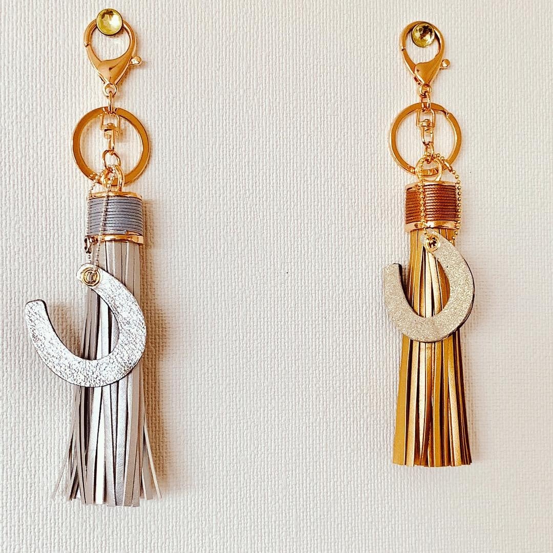 全長12cmのメタリックレザーを使用したビッグタッセルのバッグチャームです。