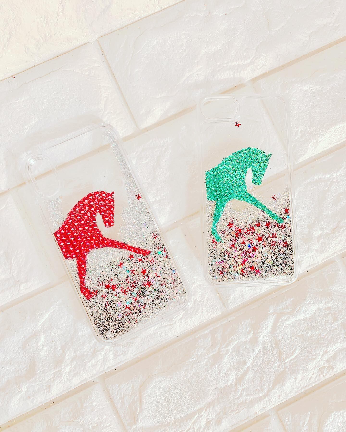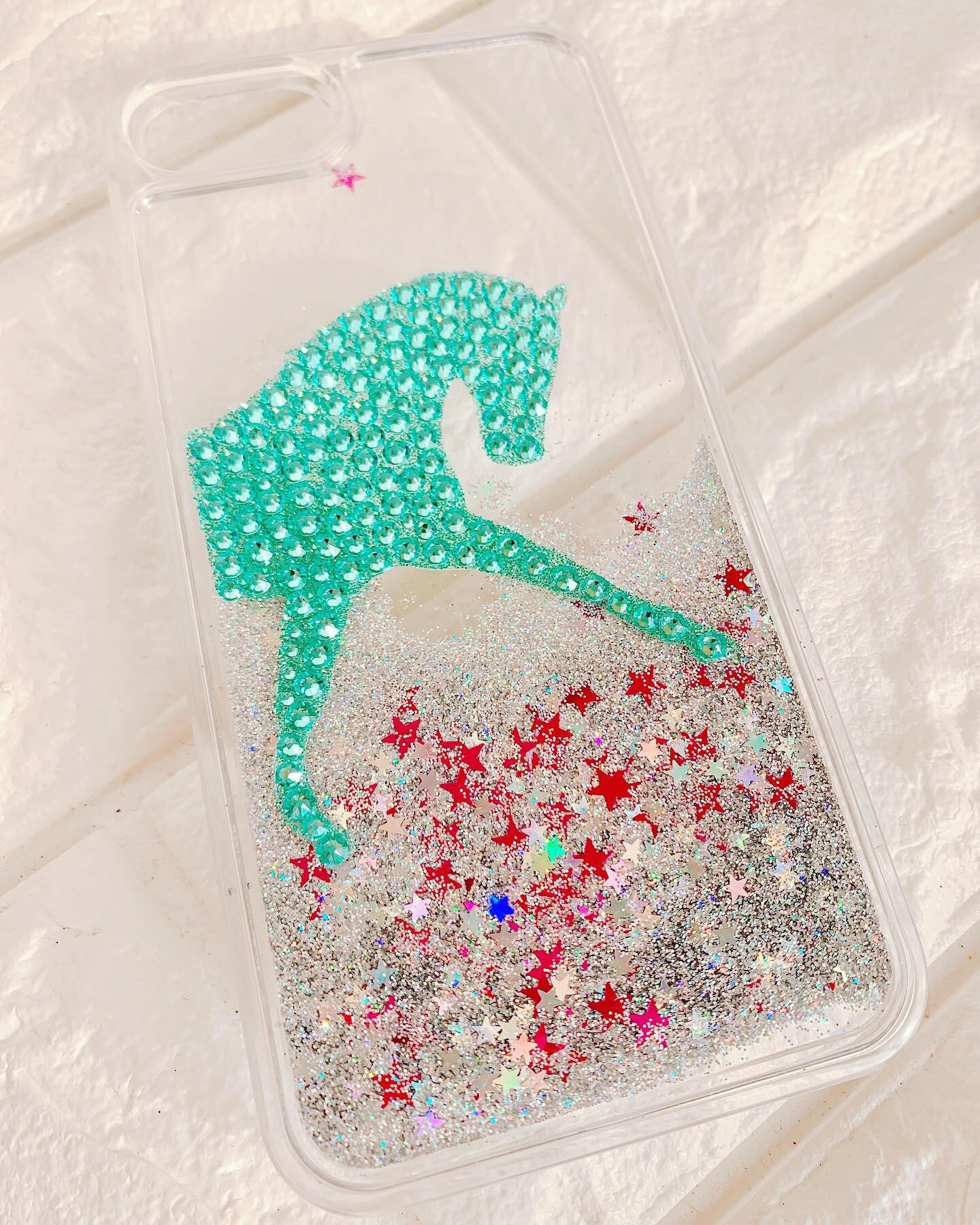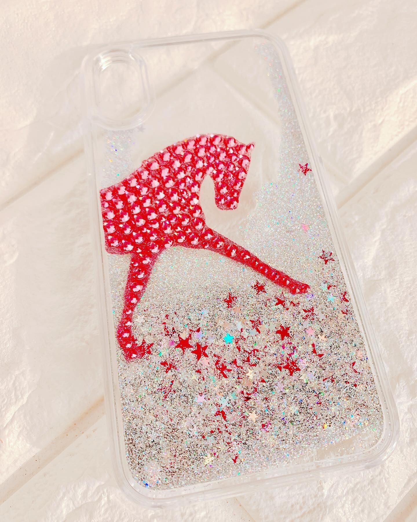 流れるキラキラフレークグリッターのiPhoneケースと、スワロフスキーの輝くドレッサージュホースのコラボ商品です!