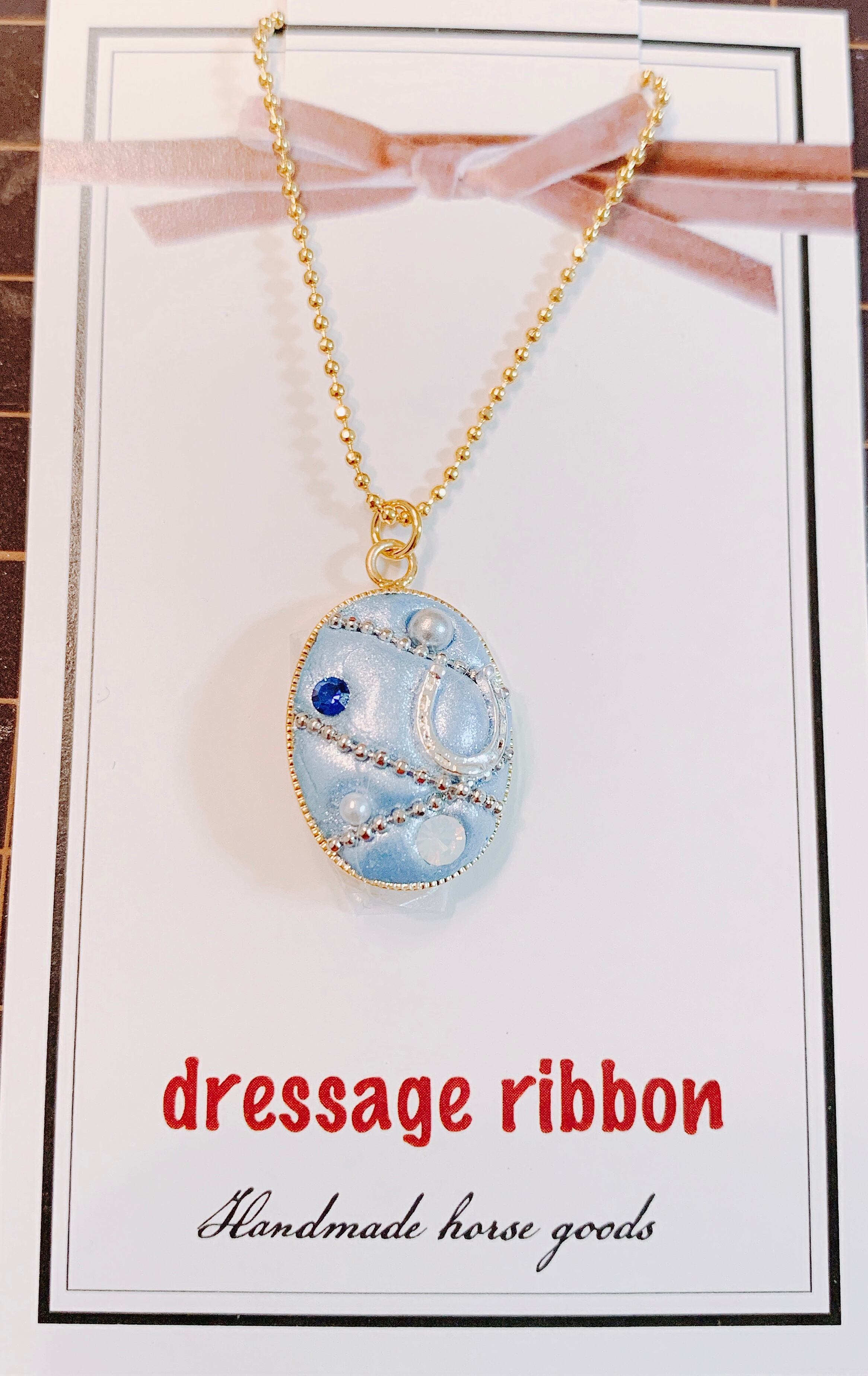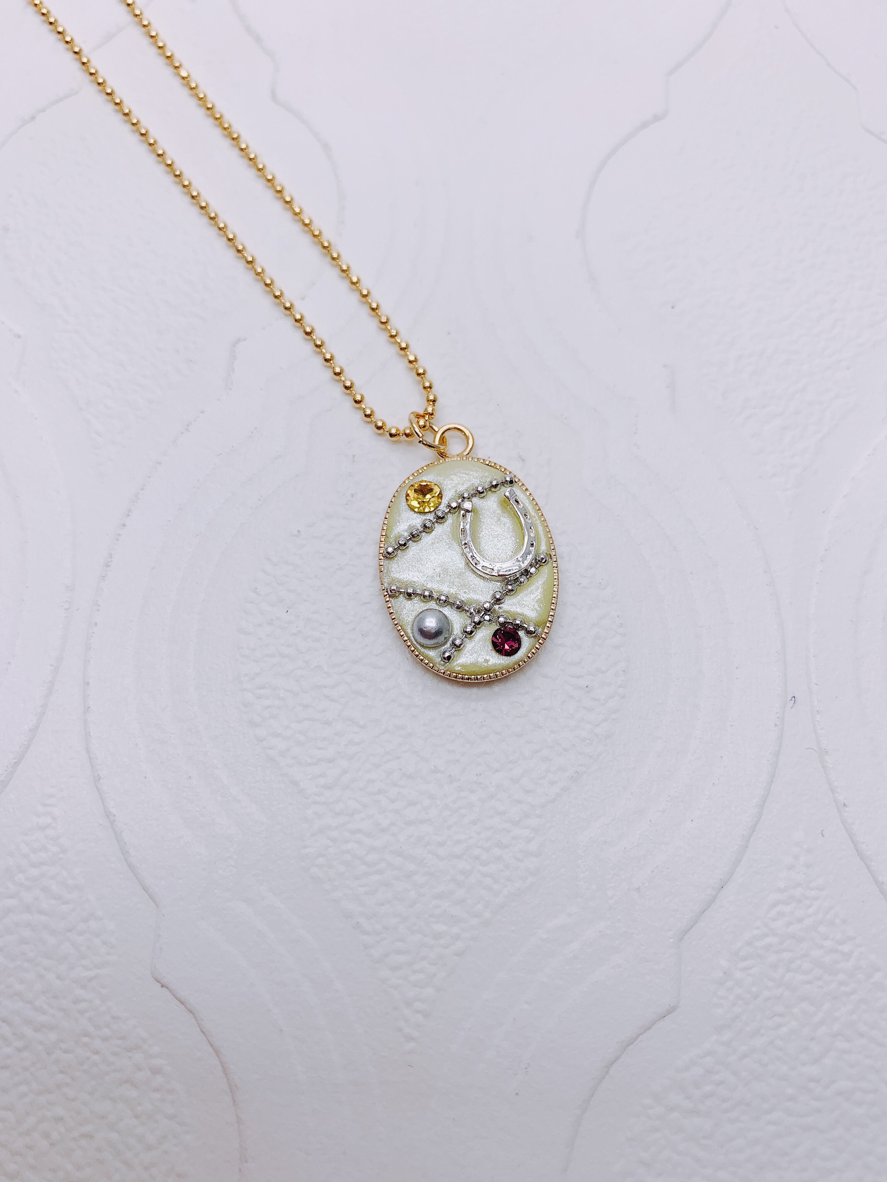 サテンパールの質感に馬蹄、スワロフスキー、パールを配置した涼しげなデザインのペンダントトップです。