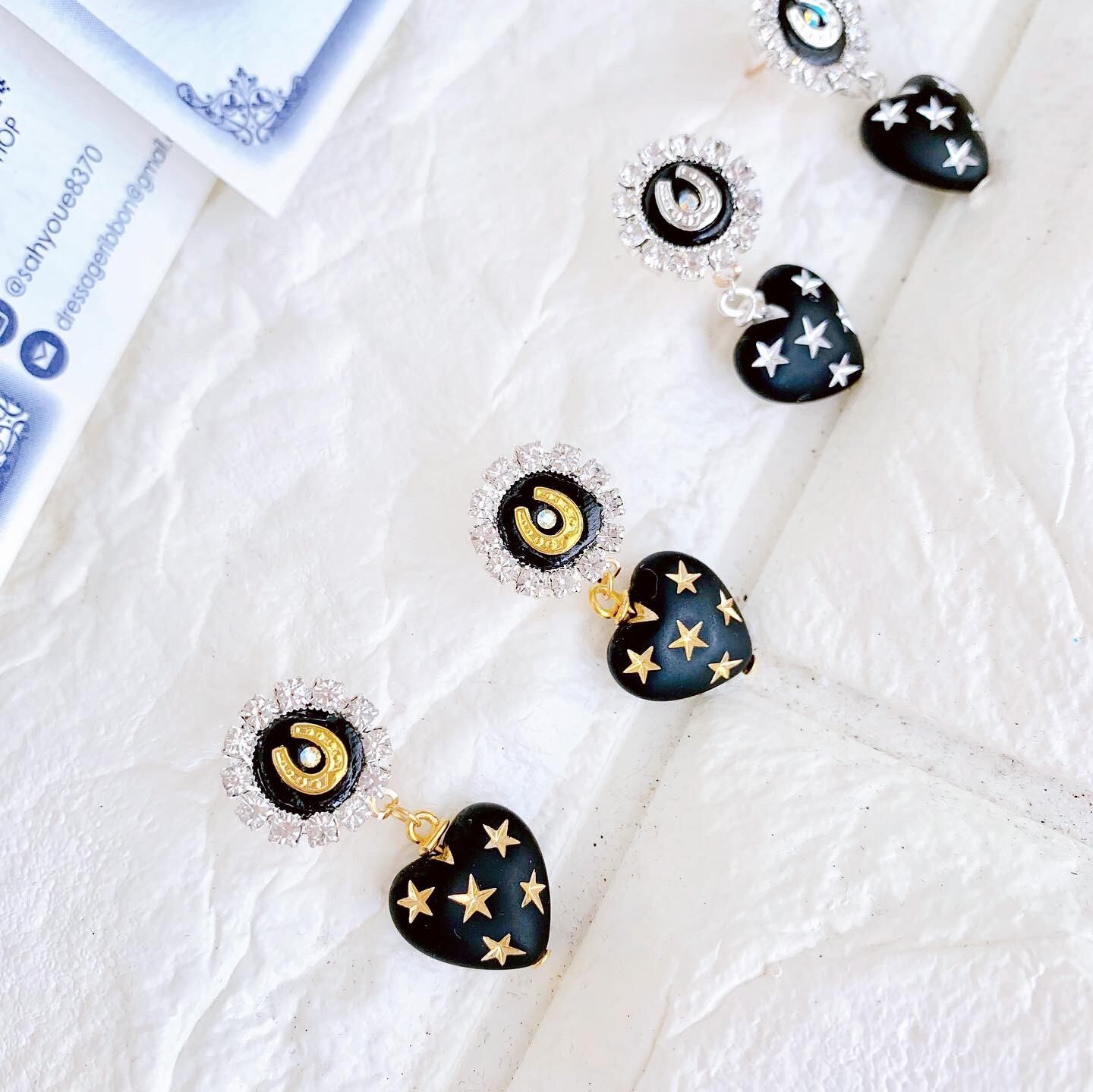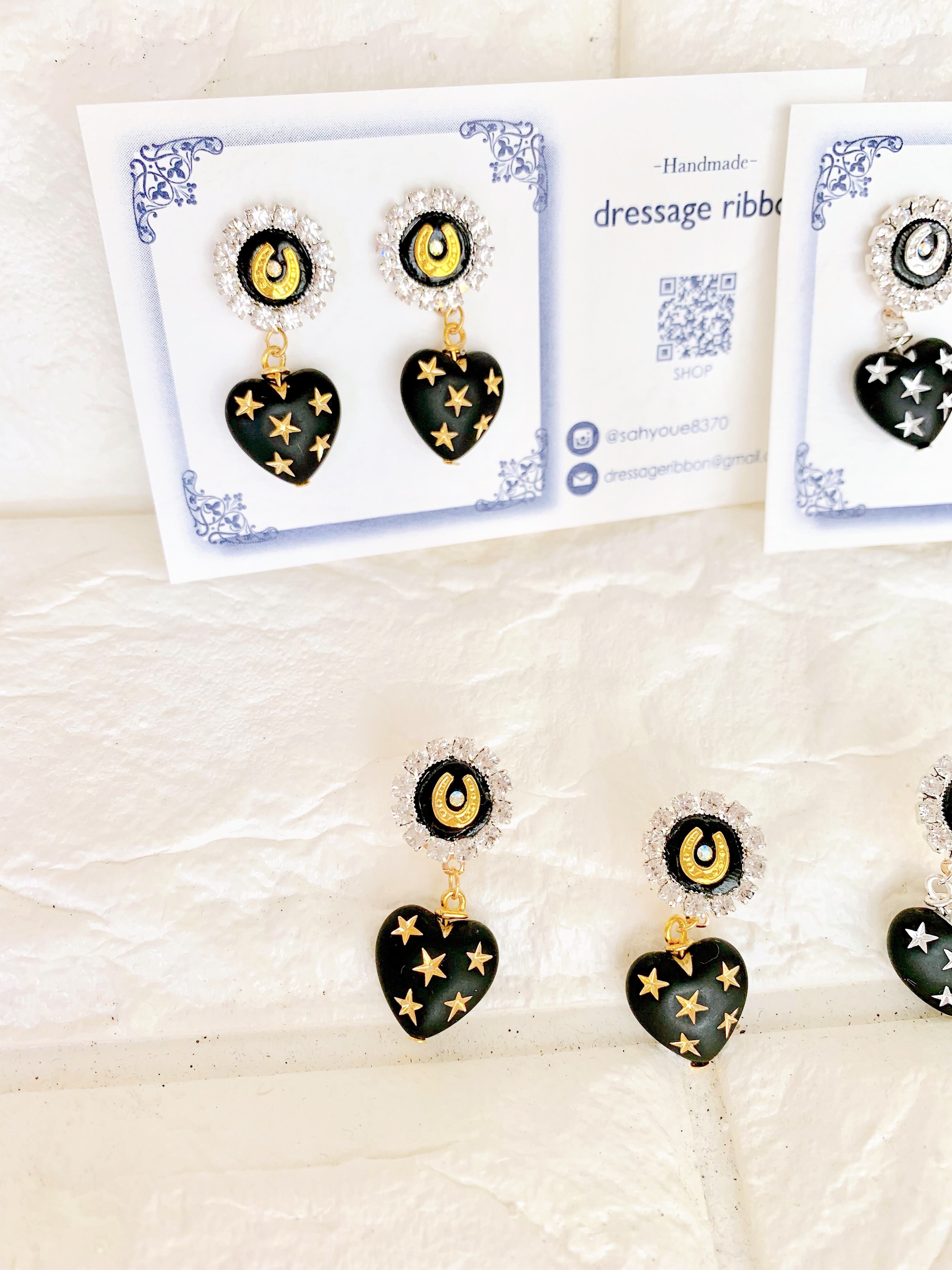 星を散りばめた珍しいハート型チャームに、幸運の蹄鉄マークとスワロフスキーを合わせたデザインのピアスです。