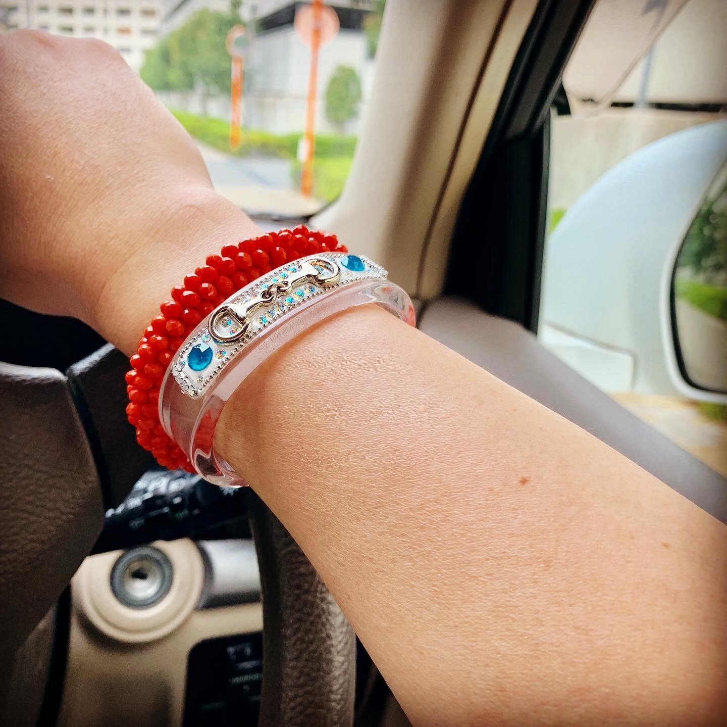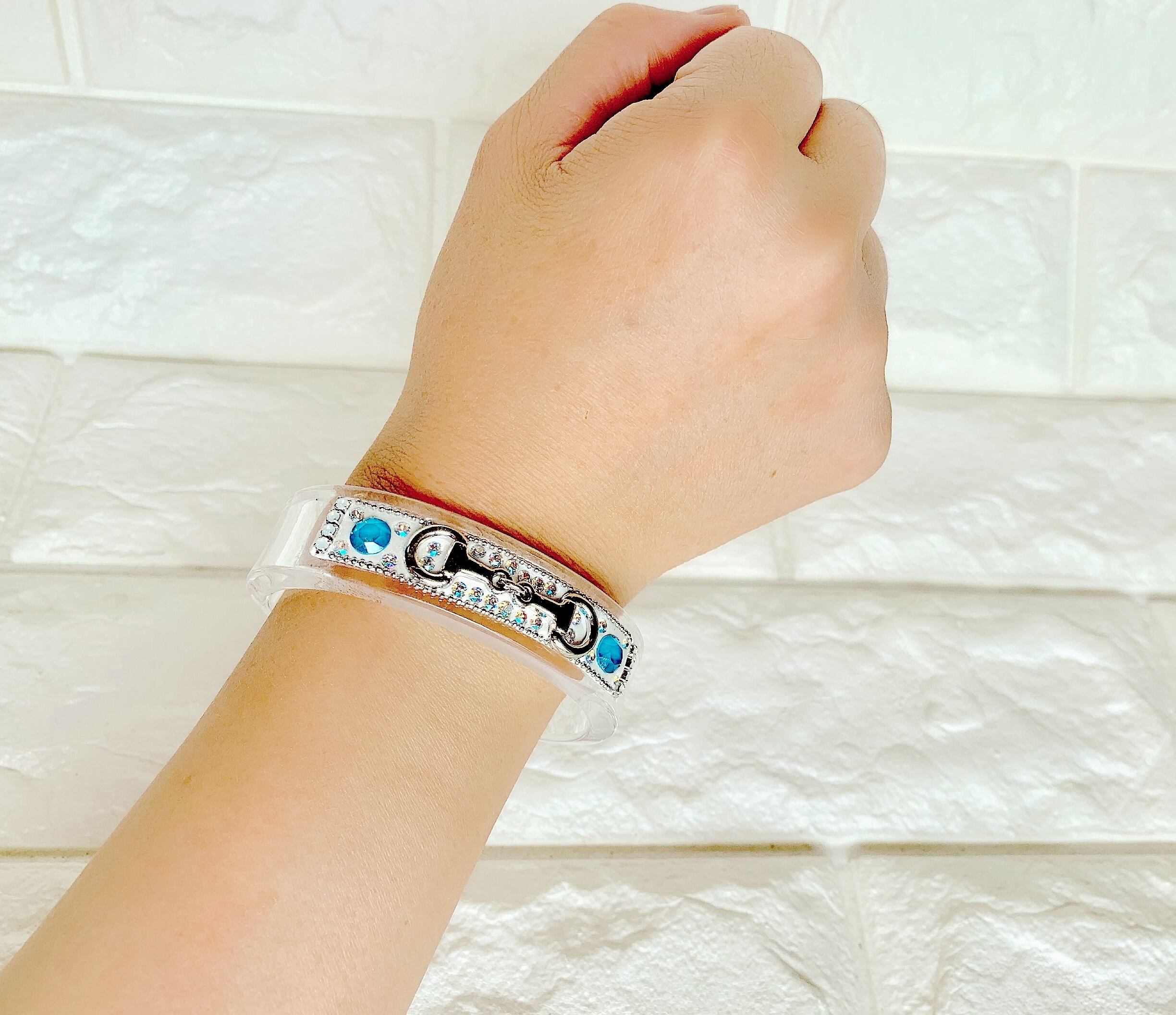 透明度の高いクリア樹脂バングルは、汗にも水にも強く、軽いのでアウトドアでも使えるアクセサリーですが、パーティシーンでも使用できるキラキラで美しいデザインになっています。