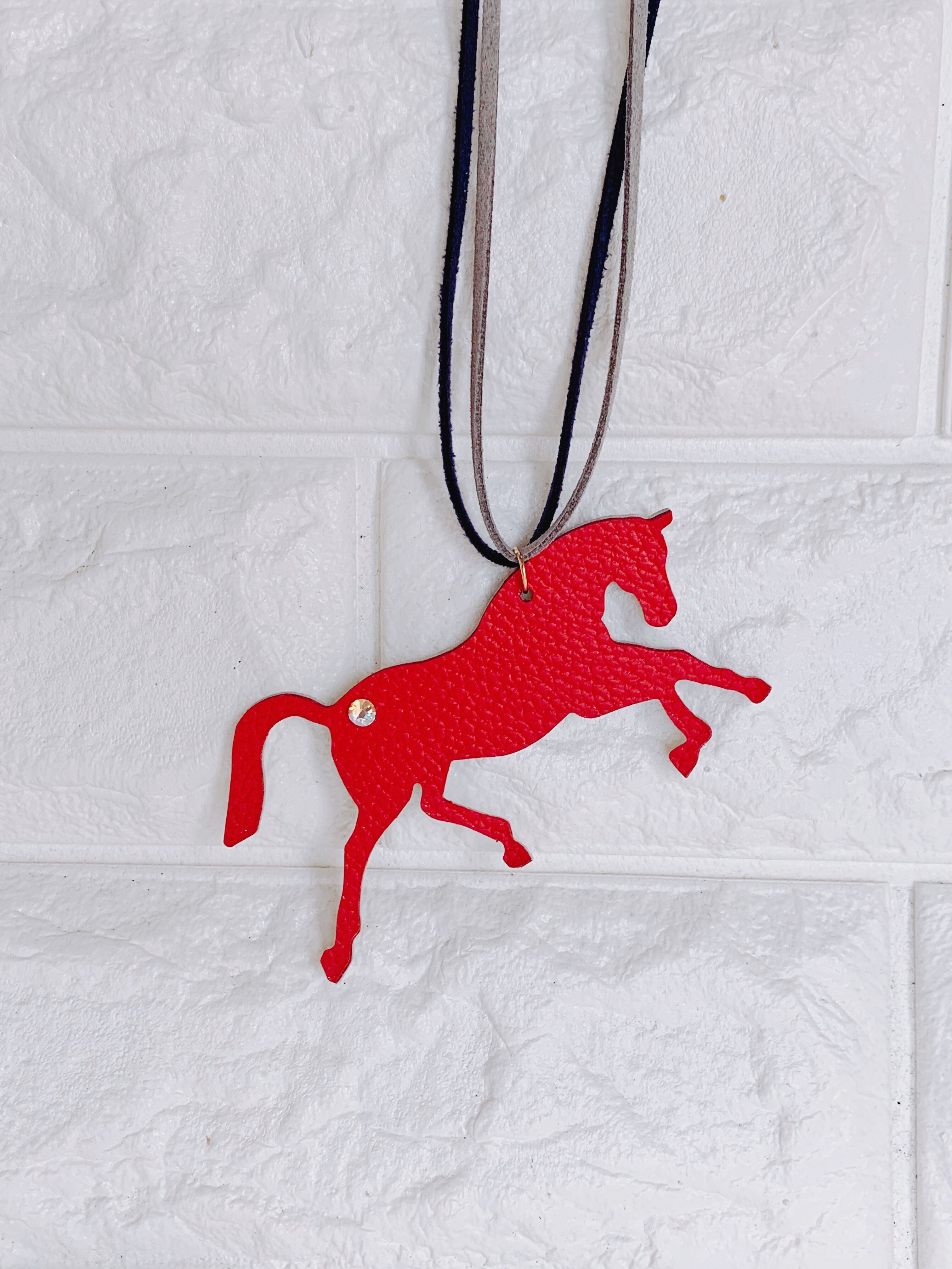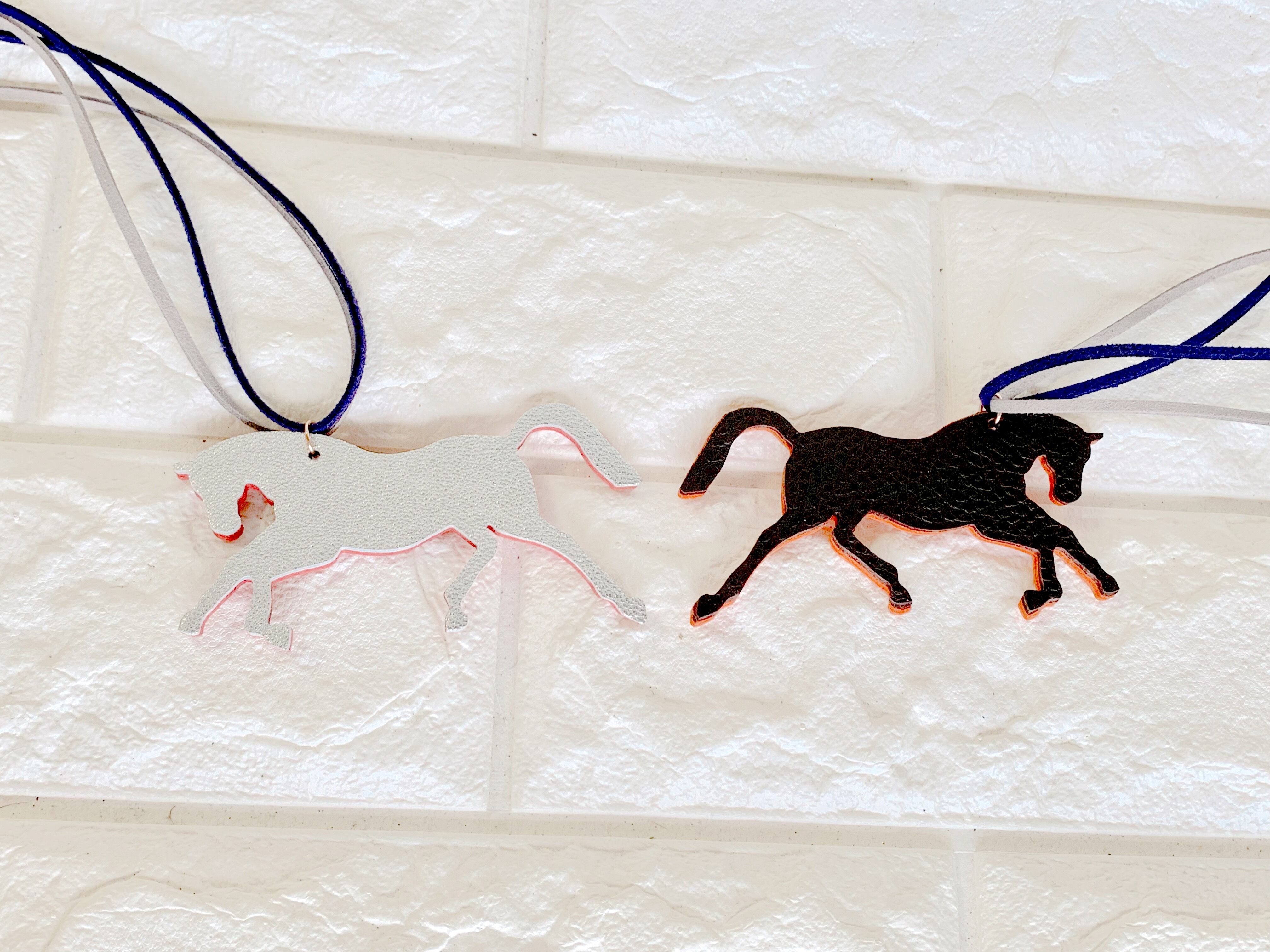 装飾はあえてキラキラさせず、ワンポイントのひと粒スワロフスキーと、ネックレスチェーンには2色のスウェードコードで、馬のレザー感を強調させた作品です。