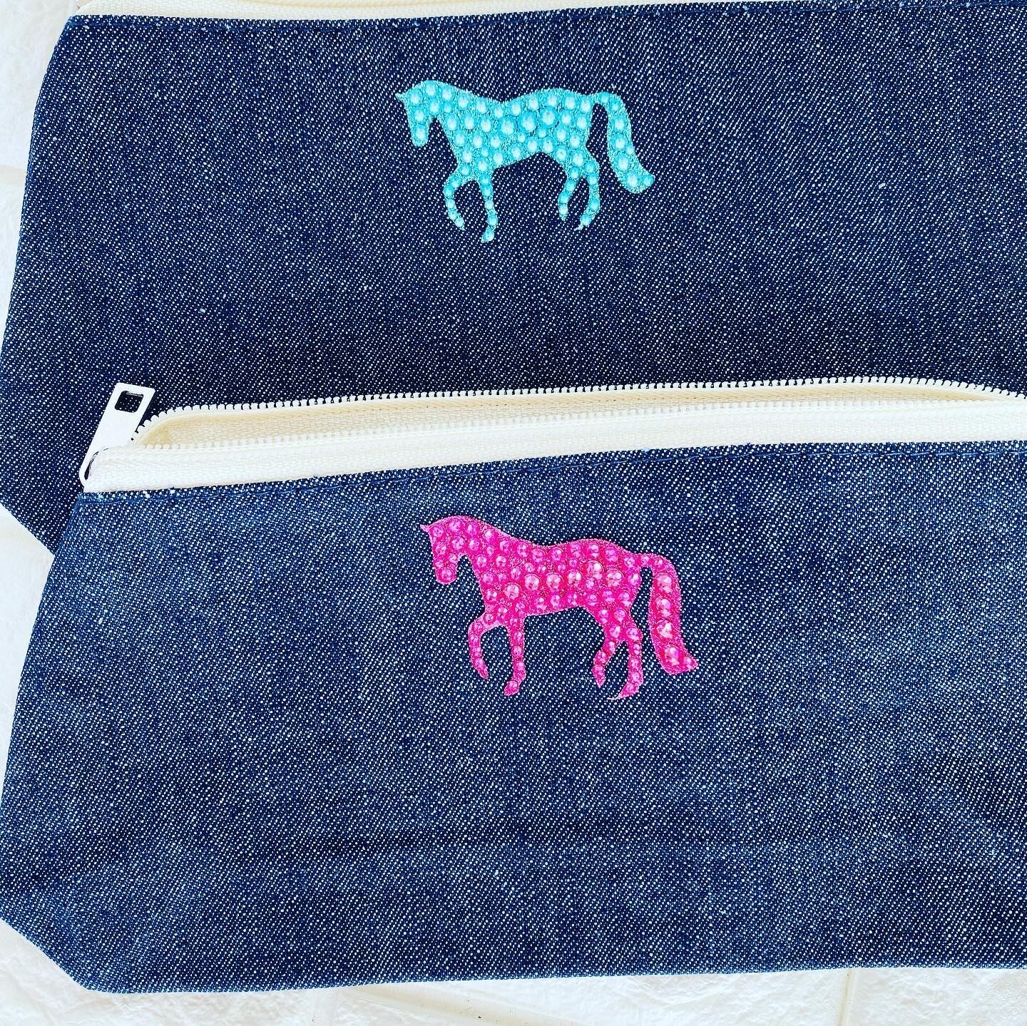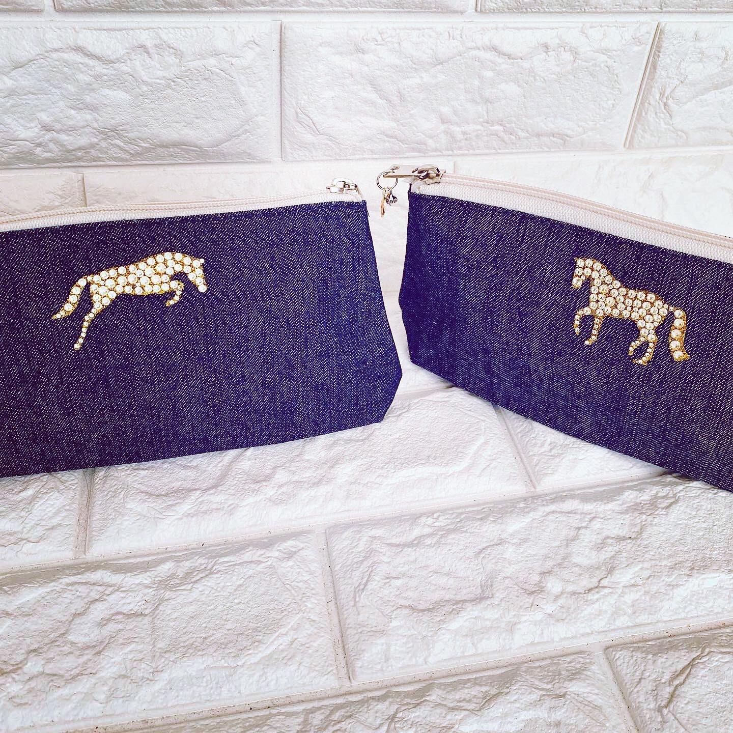 ポーチのファスナー部分にクリスタルのドロップスワロフスキー1粒と、お馬さんが大好きな人参またはリンゴのチャーム付き。