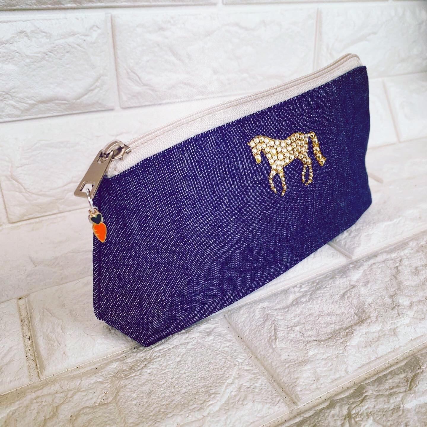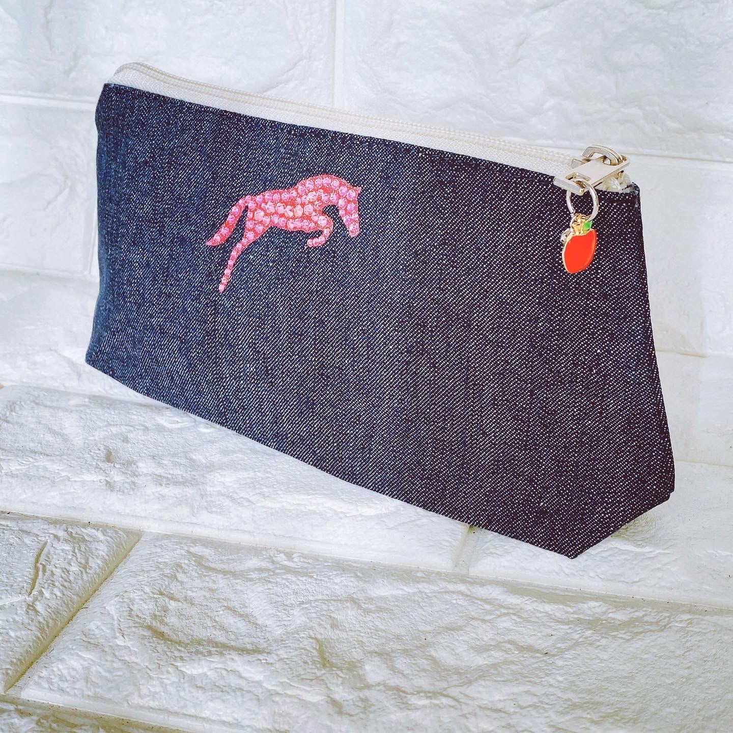 純正スワロフスキーを布デコに使用したマチ付きのデニム生地ポーチです。