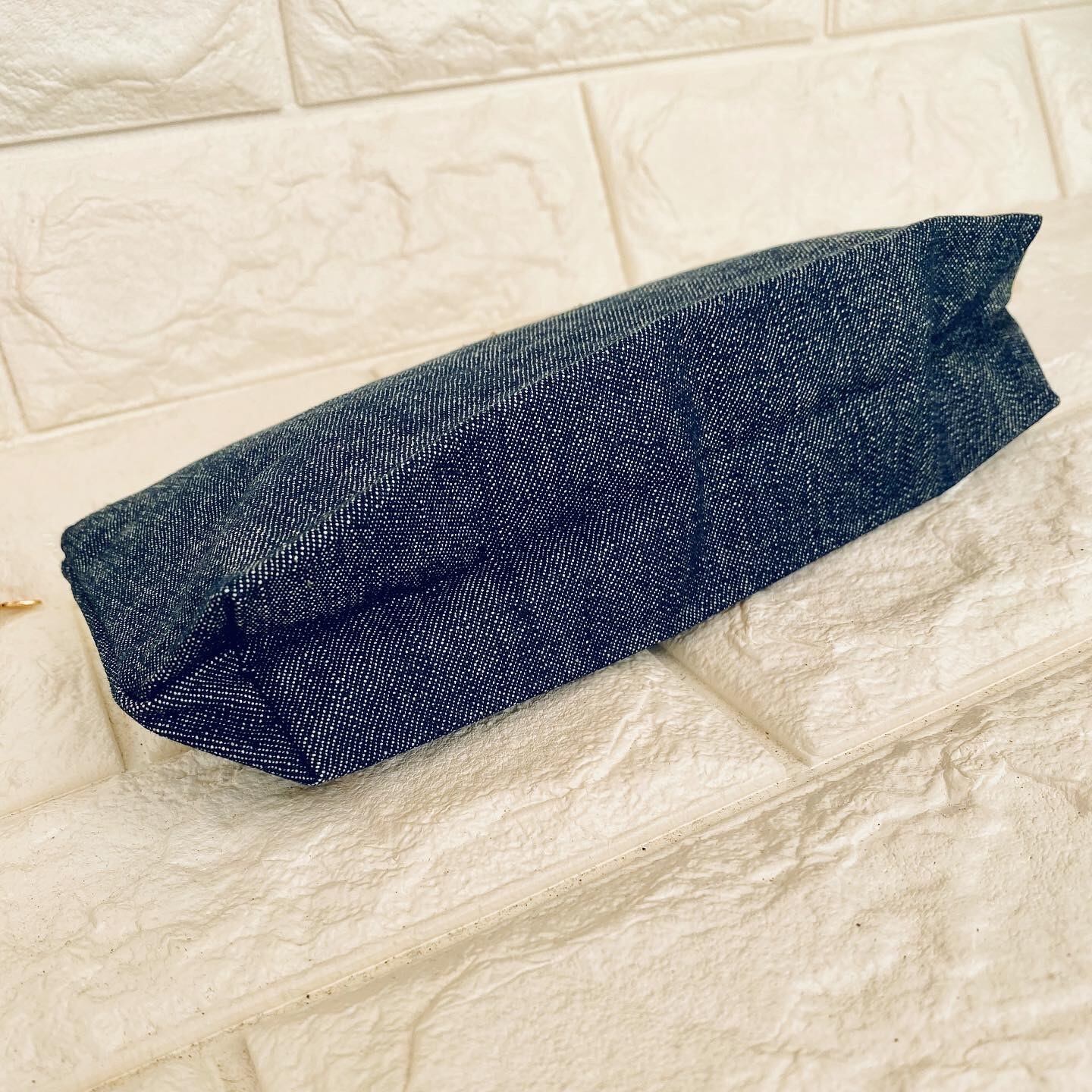 マチがある横長ポーチは非常に使い勝手がよく、ブルーデニム生地は中厚で、机の上に立てることができるしっかりしたポーチです。