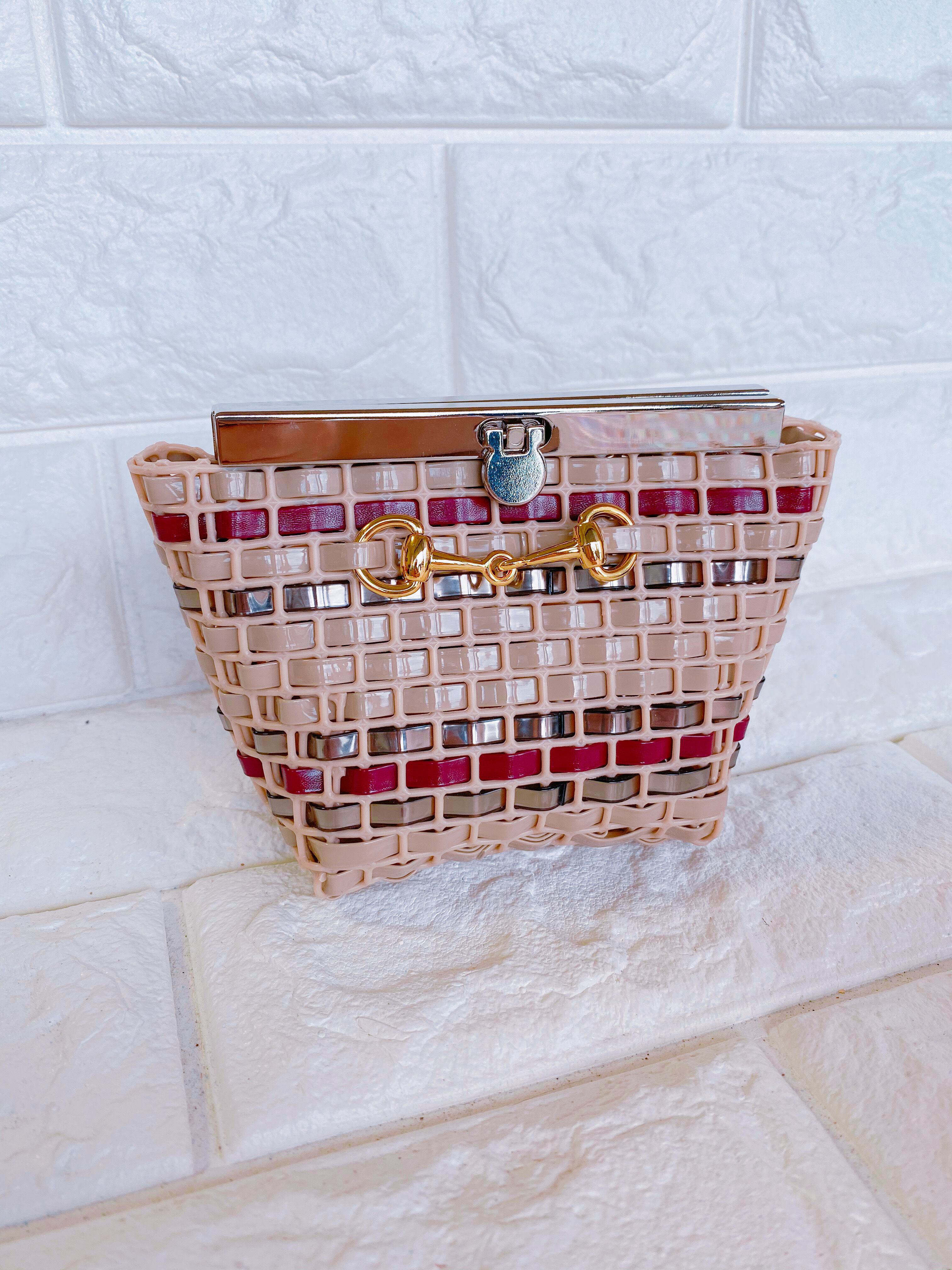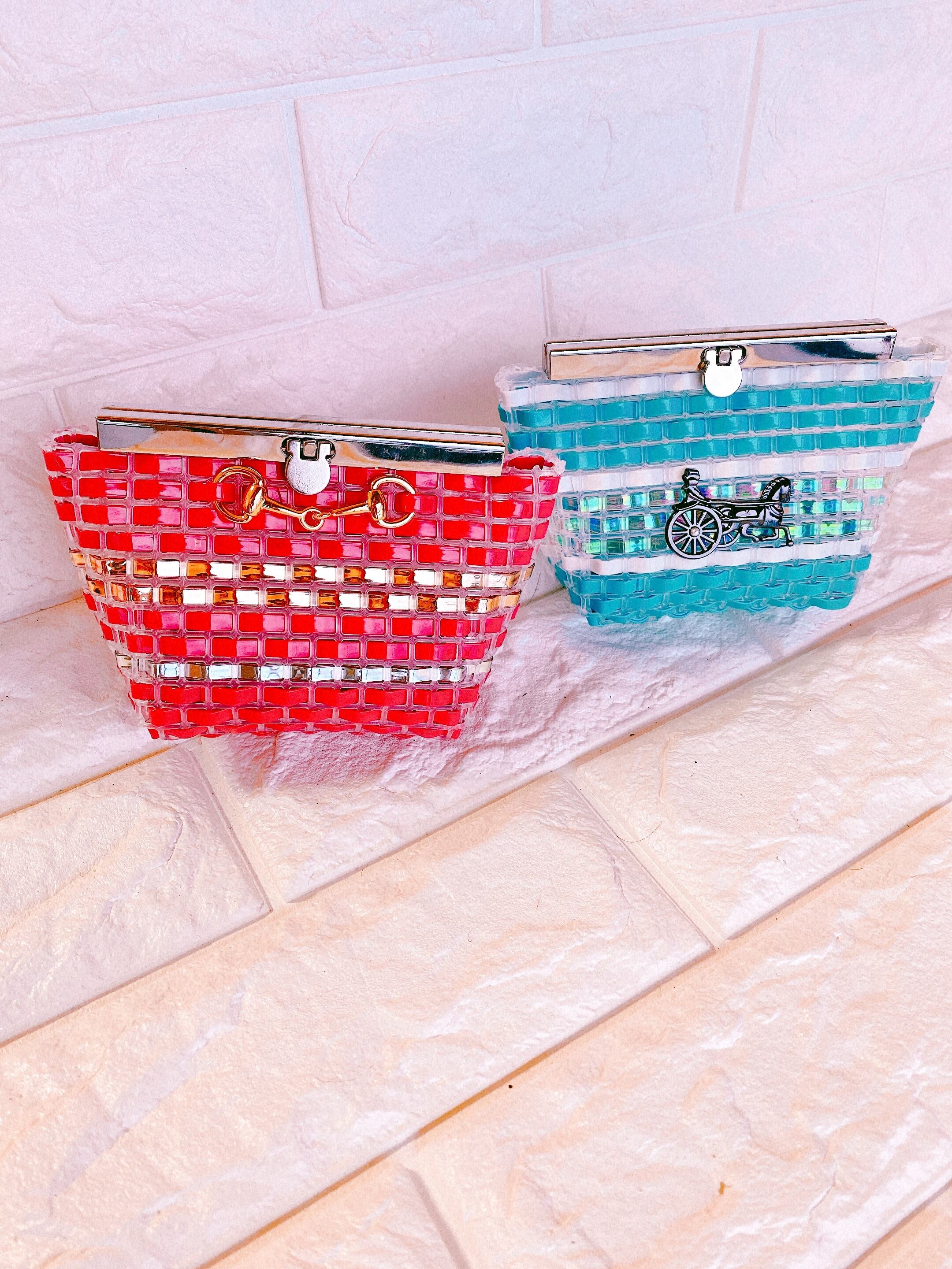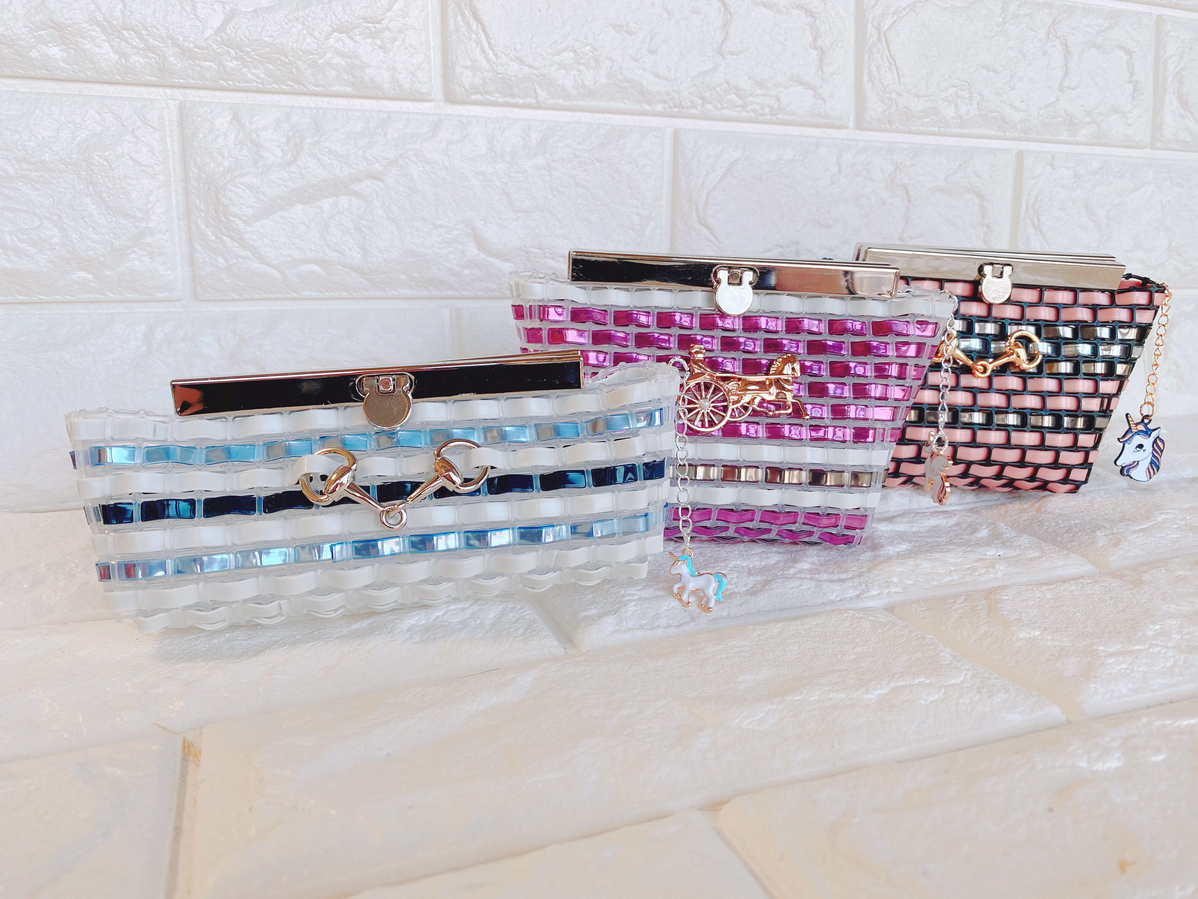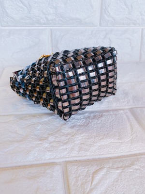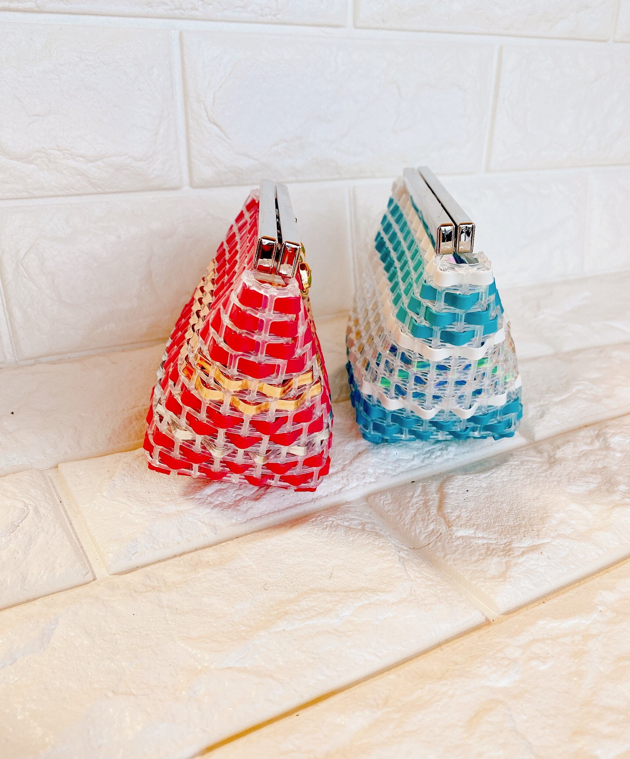 ジュエリーヤーンというテープで編んだ軽量ポーチは、鞄の中にあってもキラキラと特別な存在感です(^^)