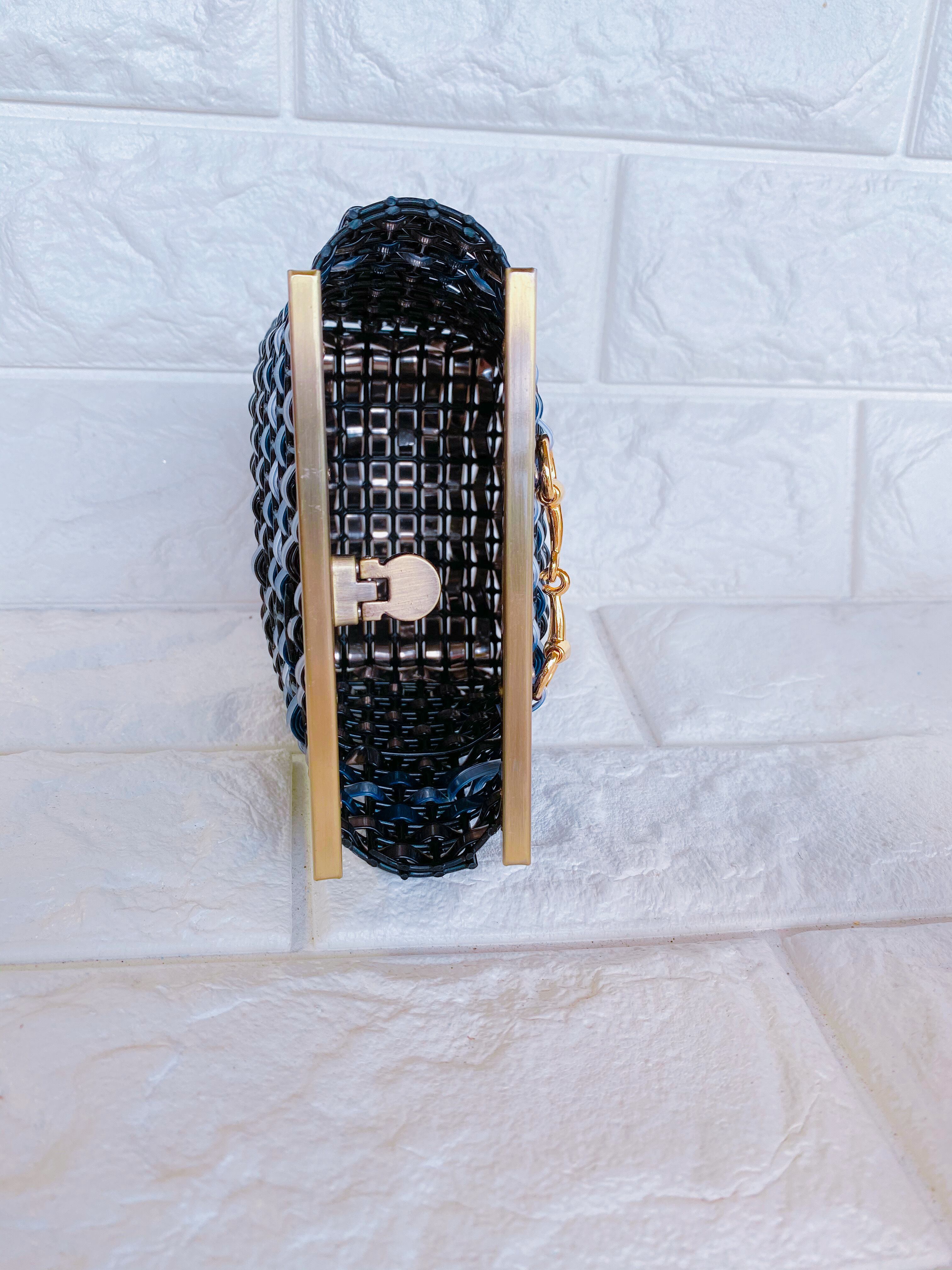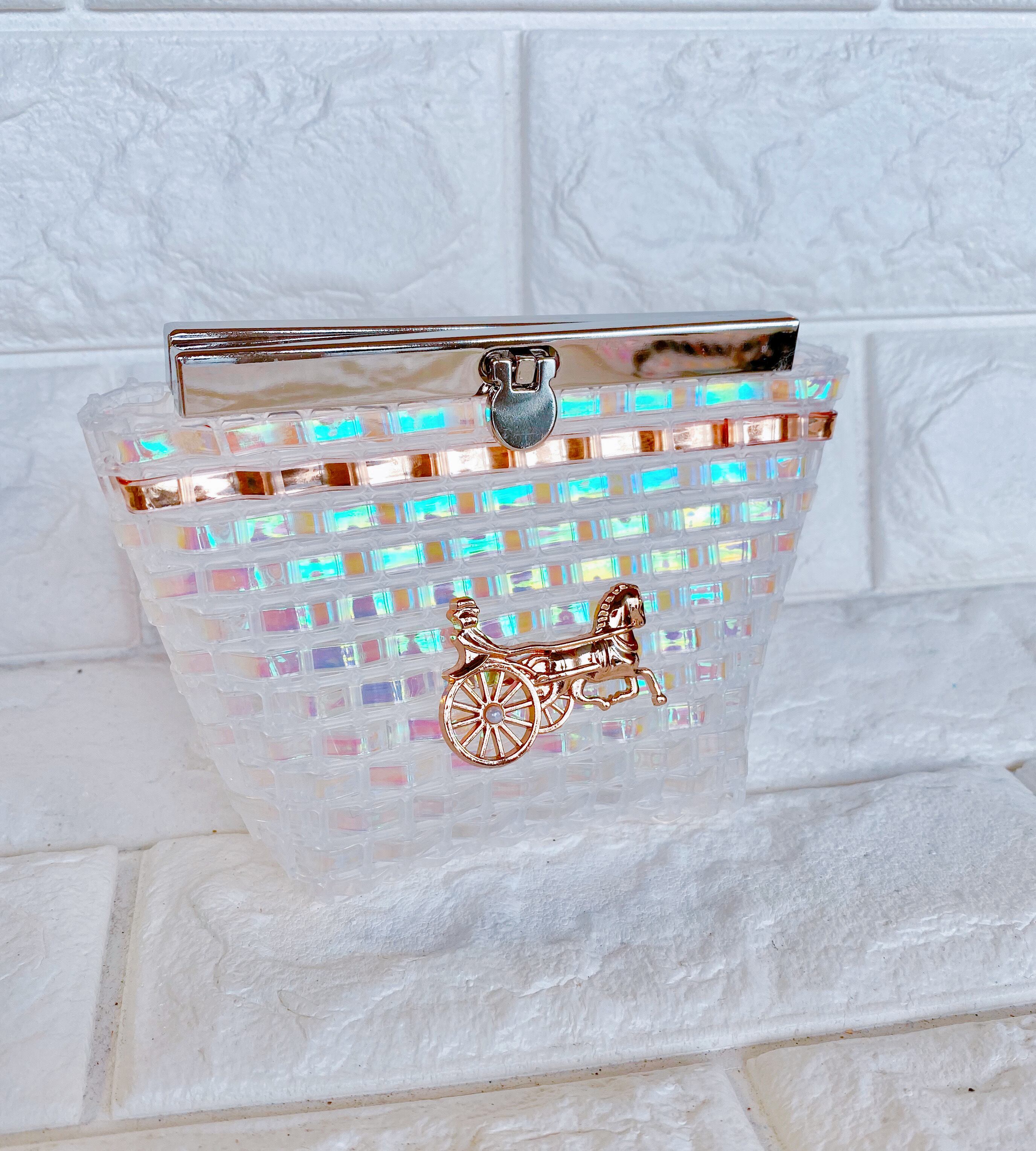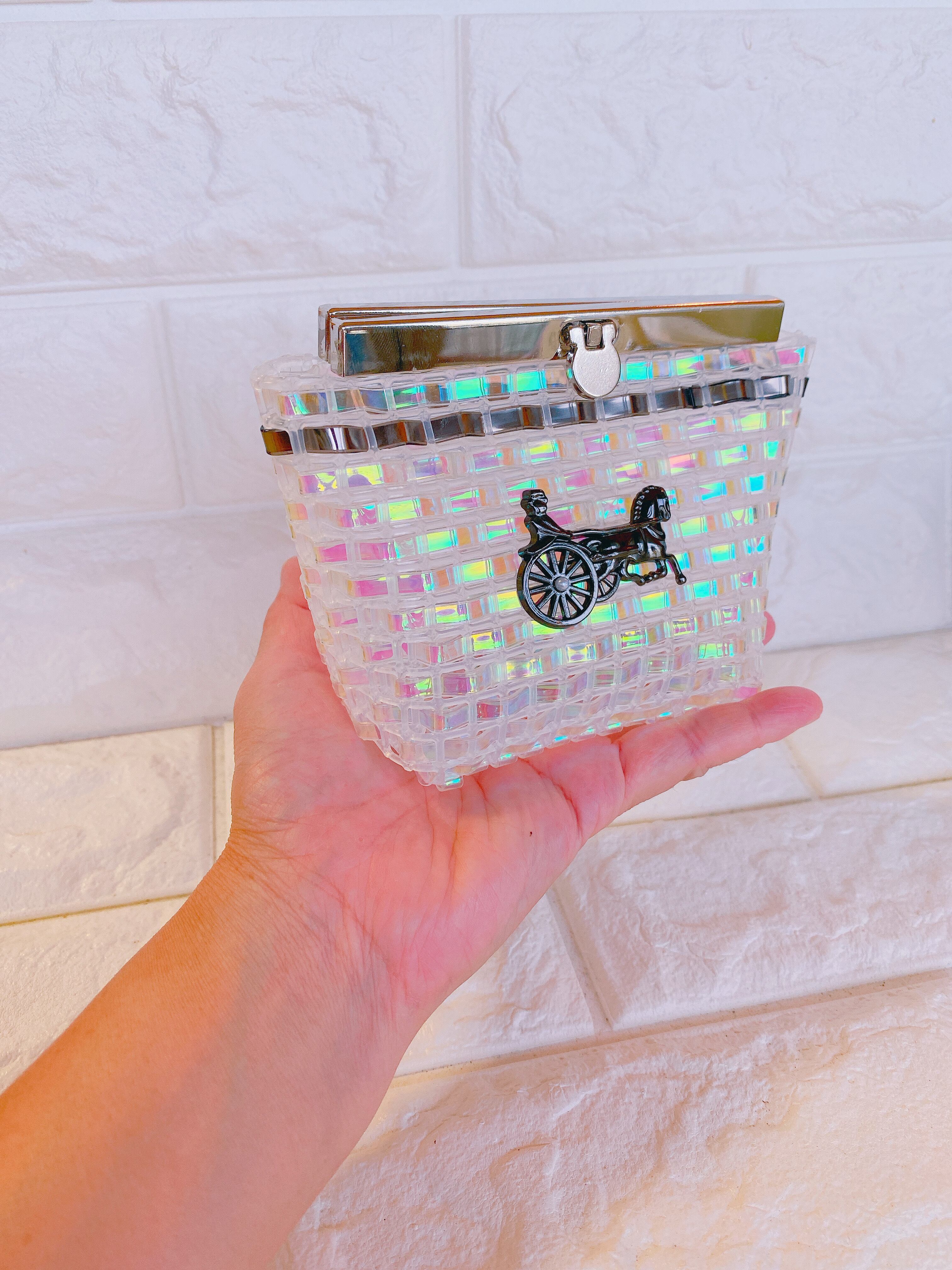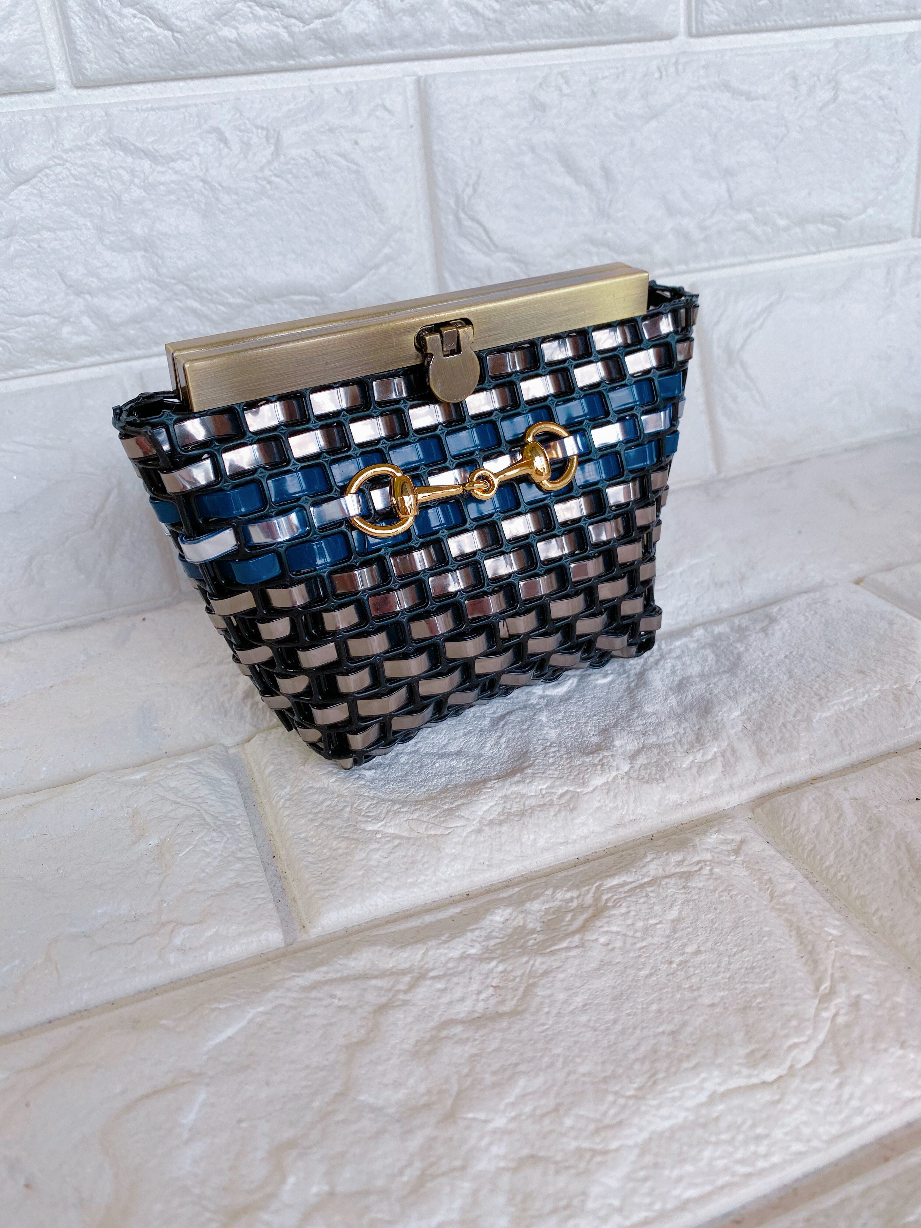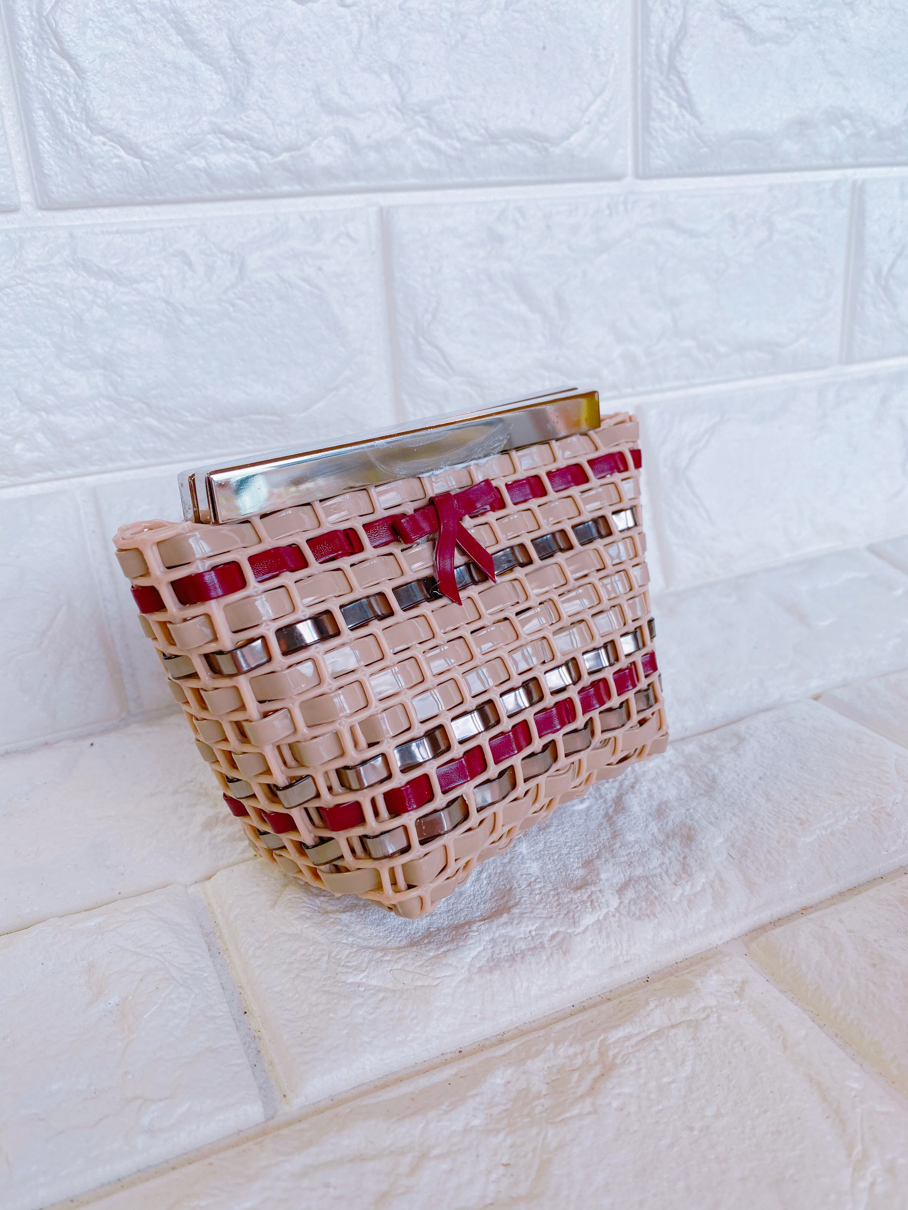 ジュエリーヤーンというテープで編んだ軽量ポーチは、鞄の中にあってもキラキラと特別な存在感です(^^)