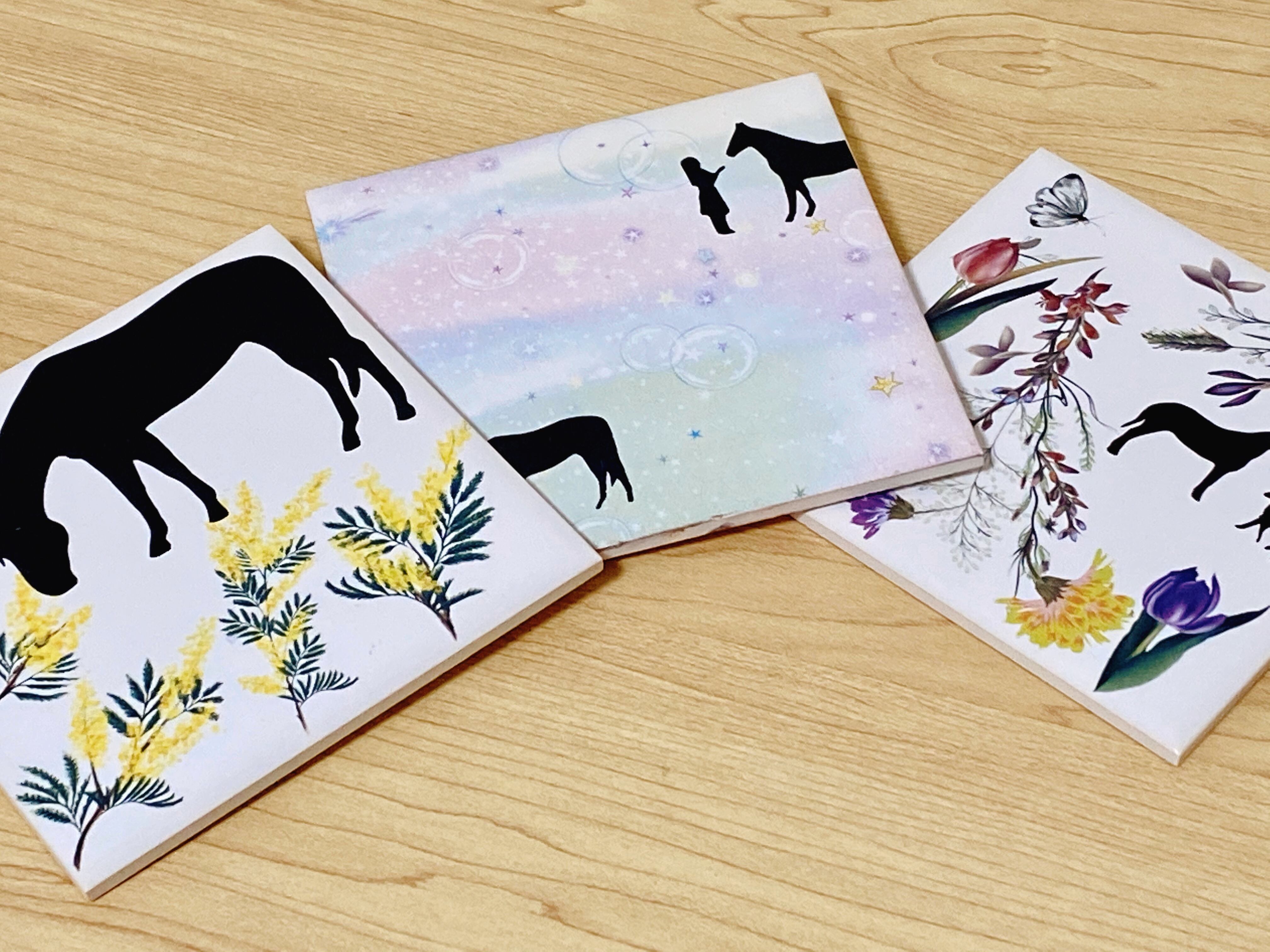 描いた絵と違うのは、タイル表面に光沢があり額装する際も表面にガラスパネルを貼らずにタイルそのままで展示すると、ガラスのように光の反射なくどんな照明下でも絵柄が美しく発色して見えます。