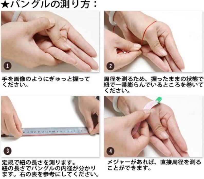 バングルはサイズ調整できませんので、写真のように手のひらをすぼめて一番広い部分を測っていただき、そのサイズで製作いたします。