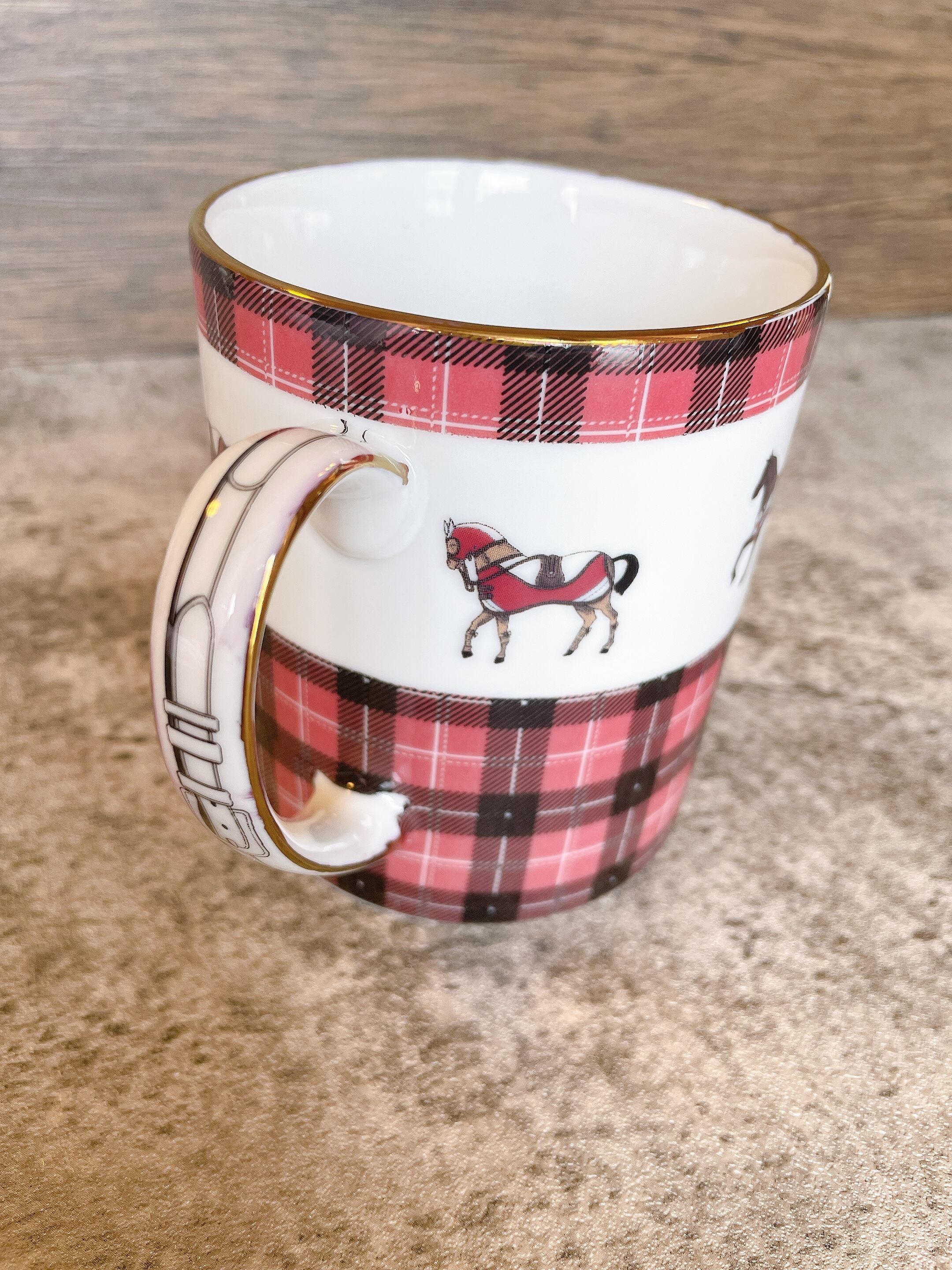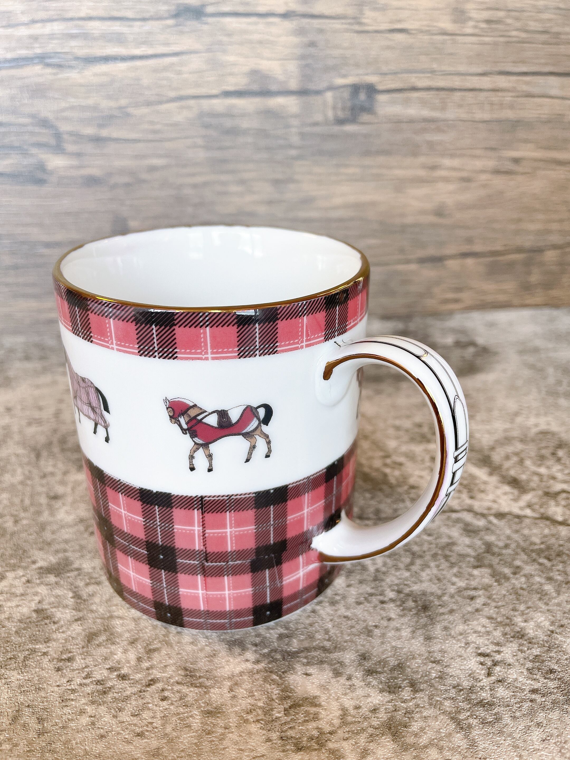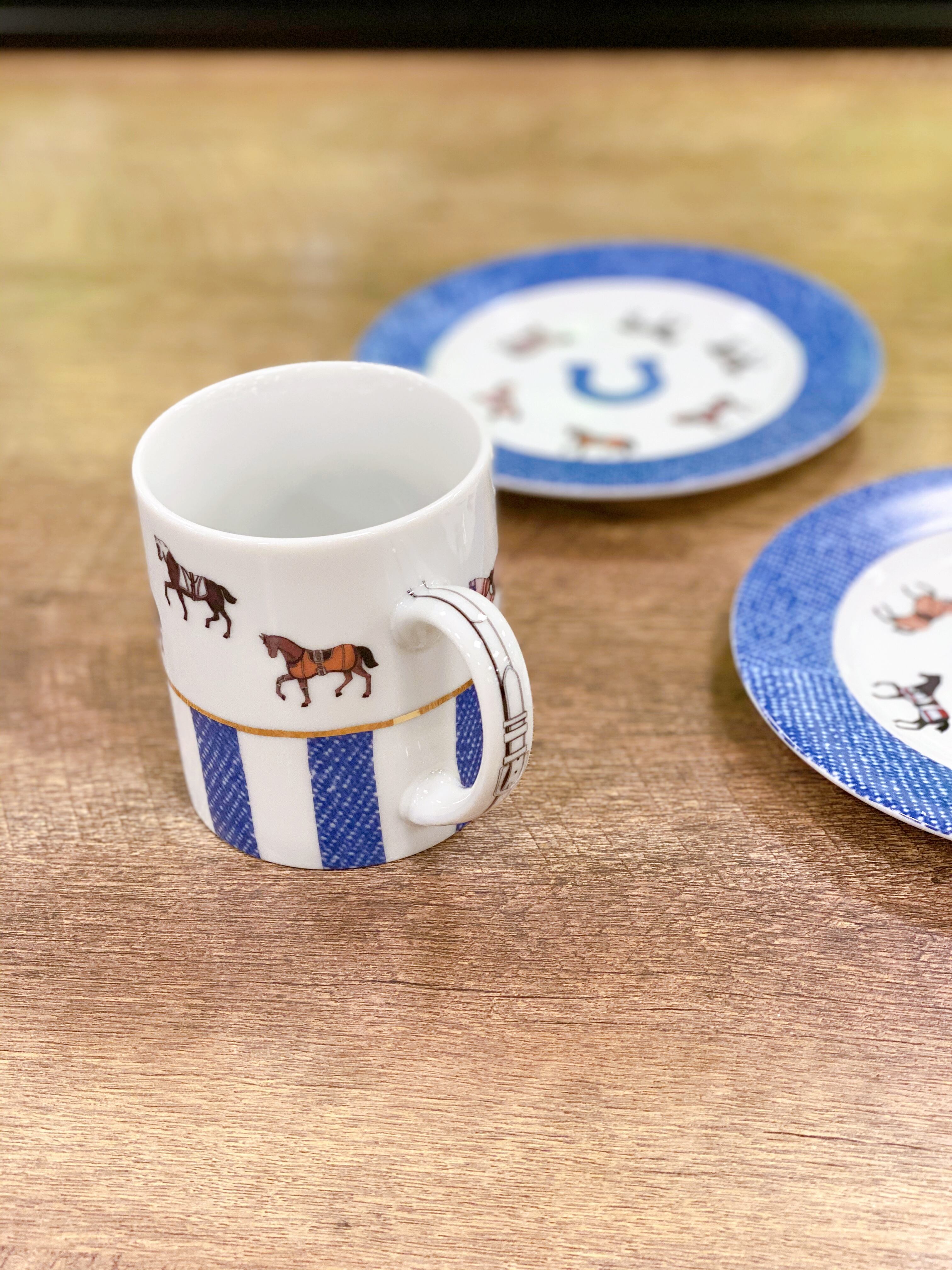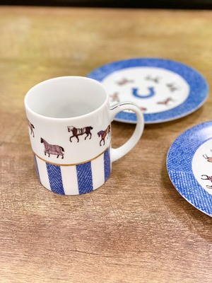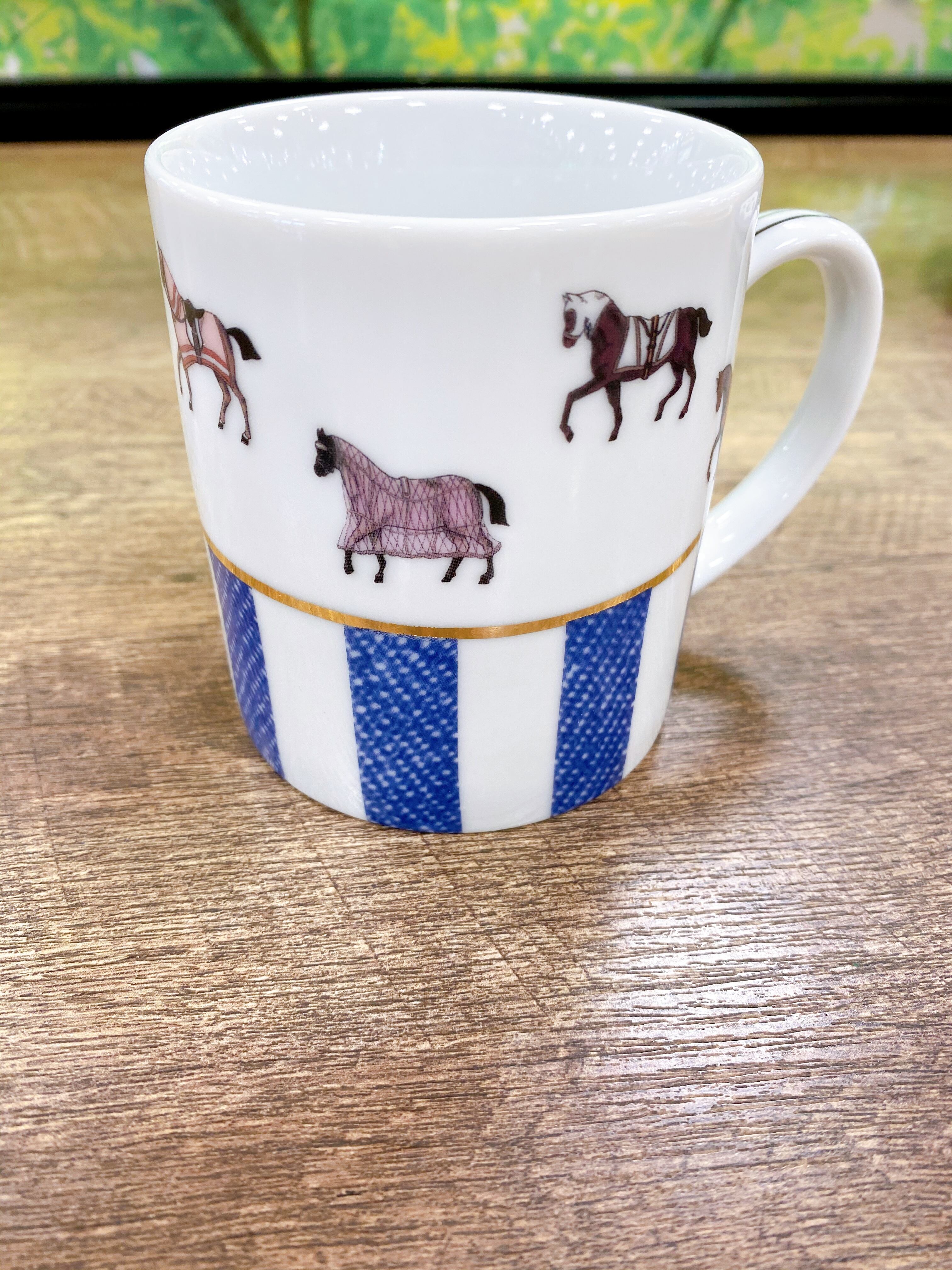 ボトムにブルーデニムのストライプ柄をあしらったお馬さんいっぱいの大きめマグカップです。