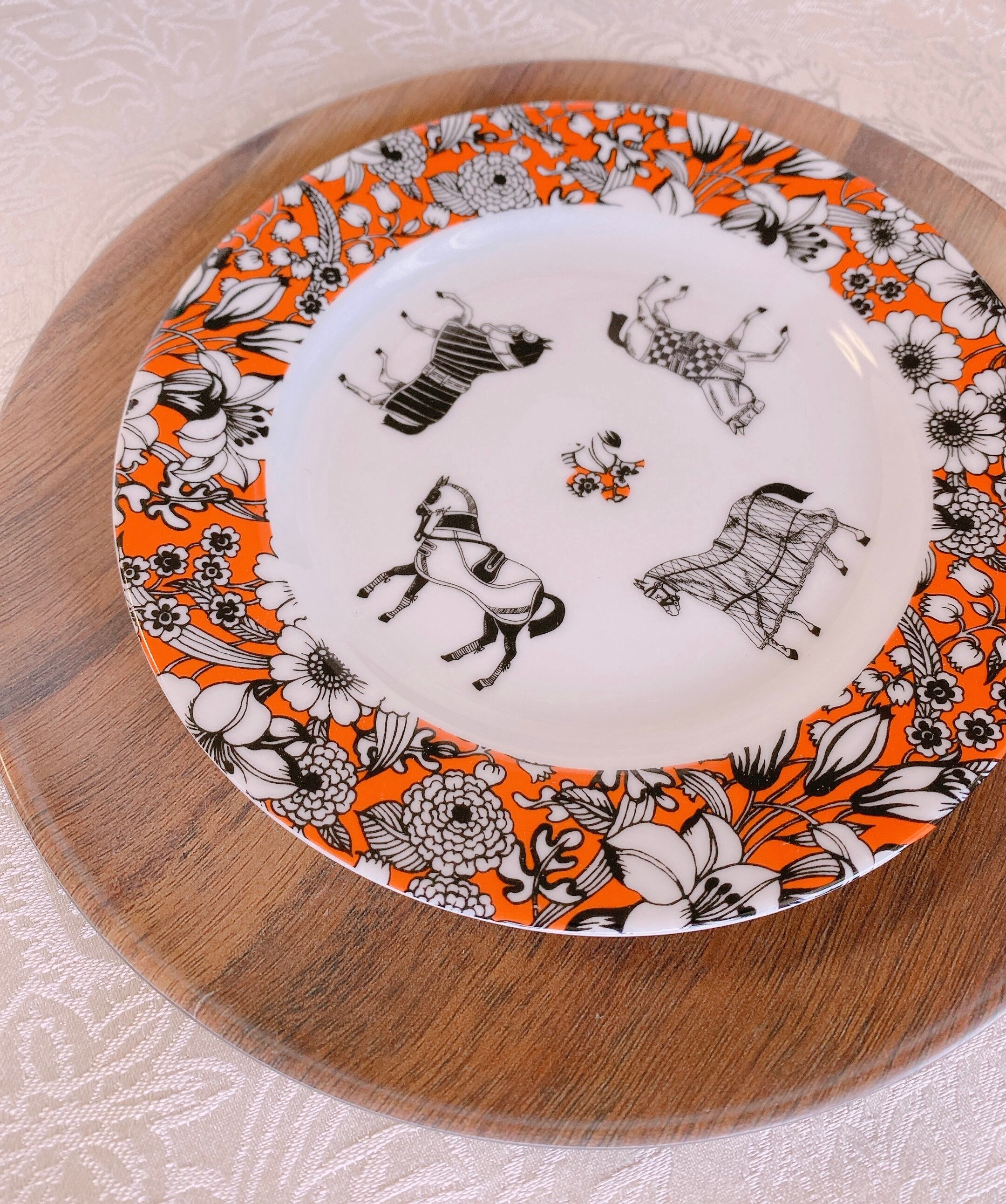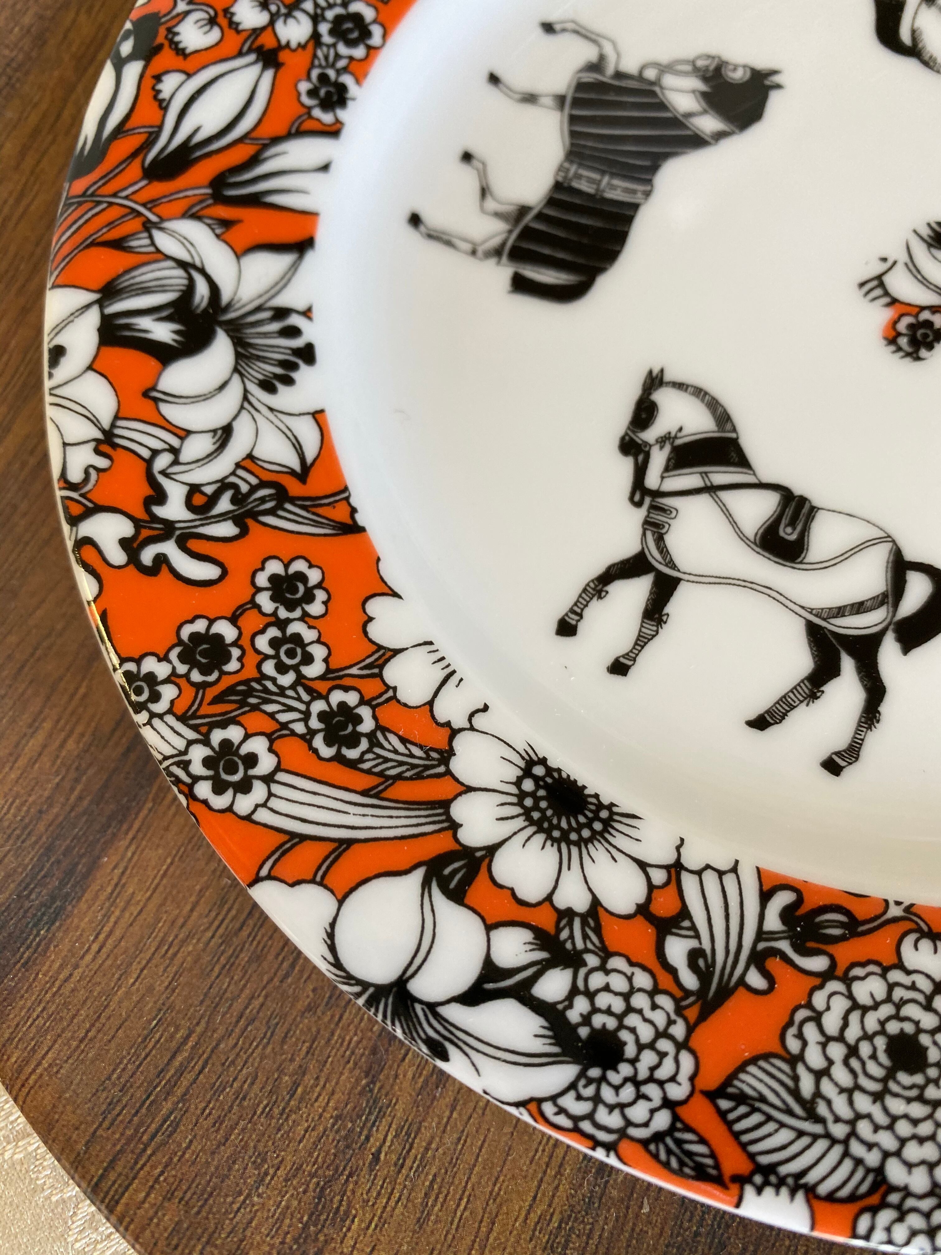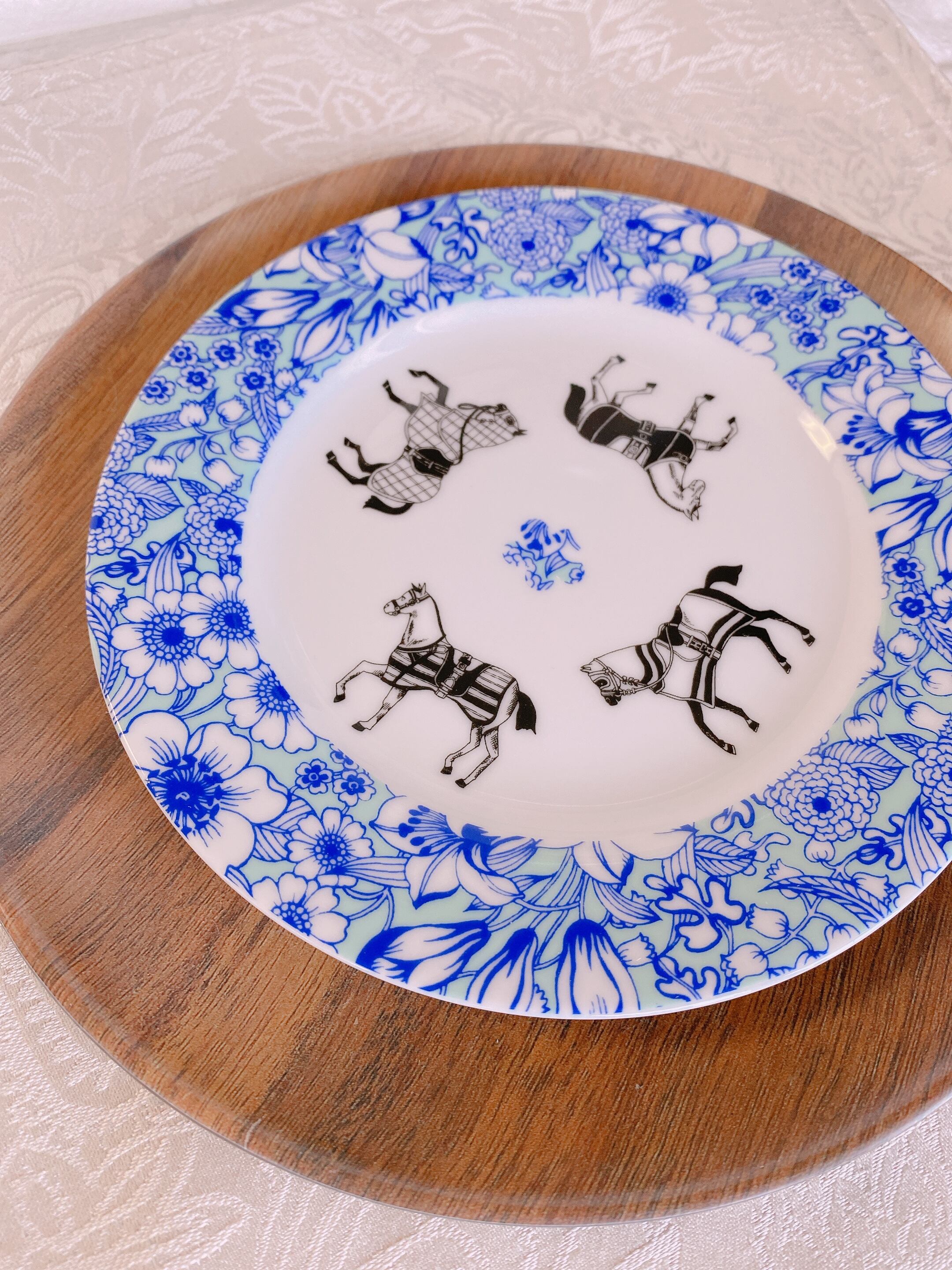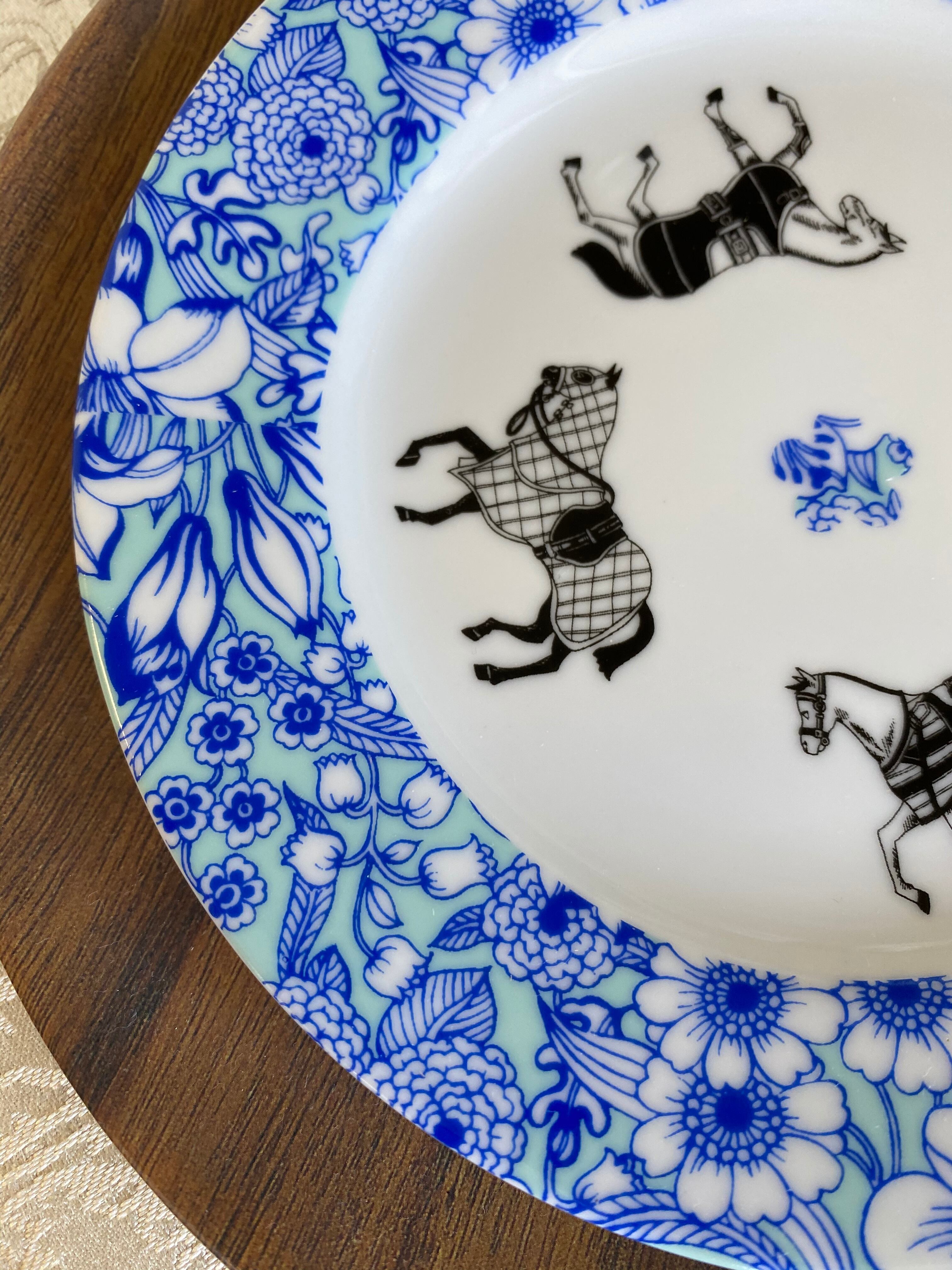 オリエンタルフラワーのリムにお馬さんがいっぱい、どの向きからも楽しいプレートです。