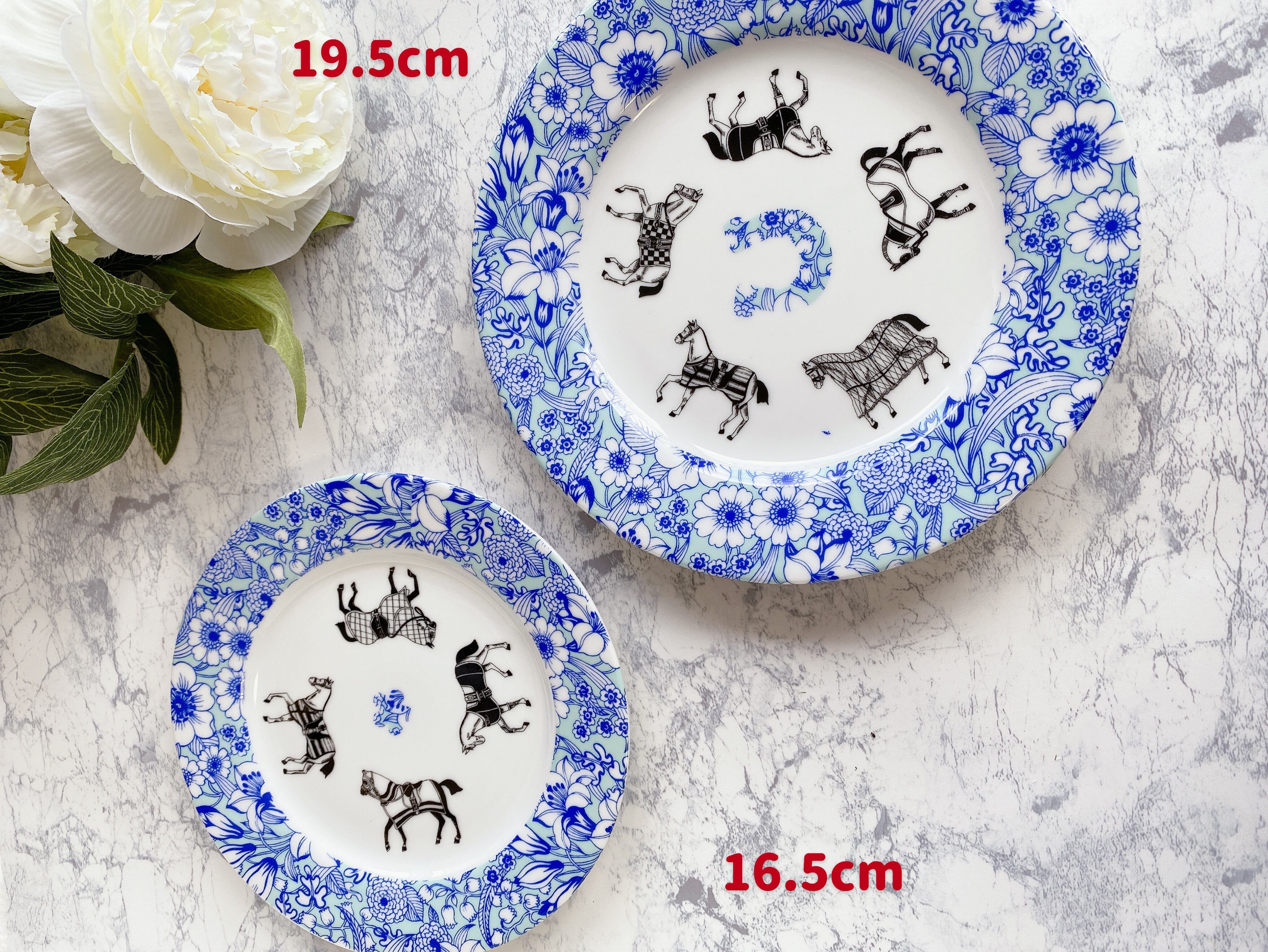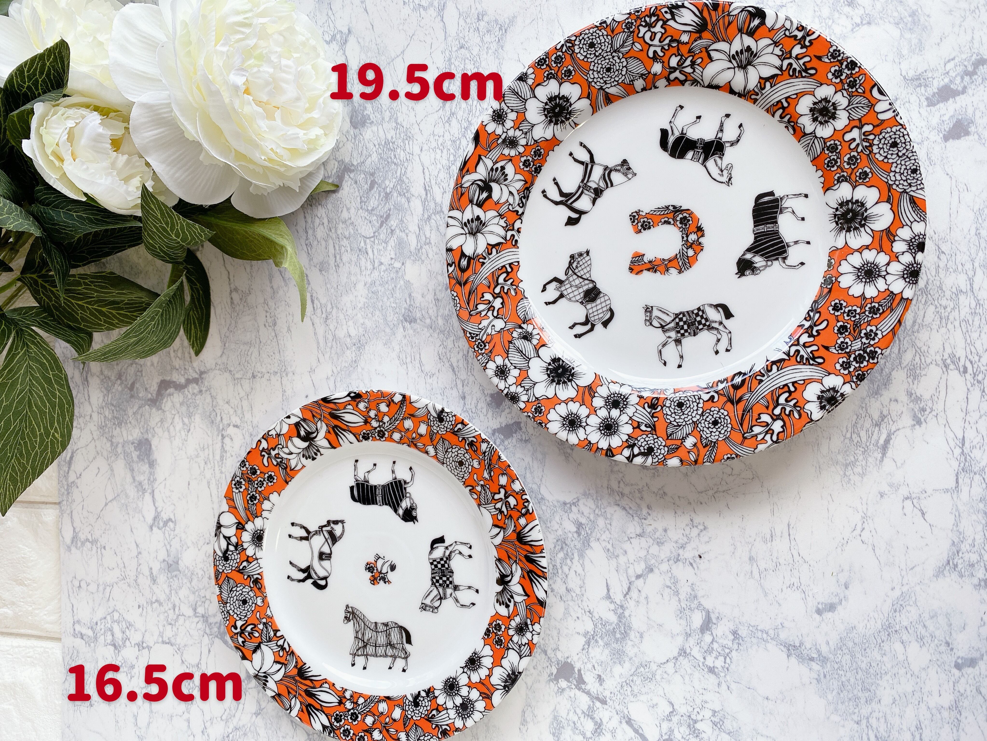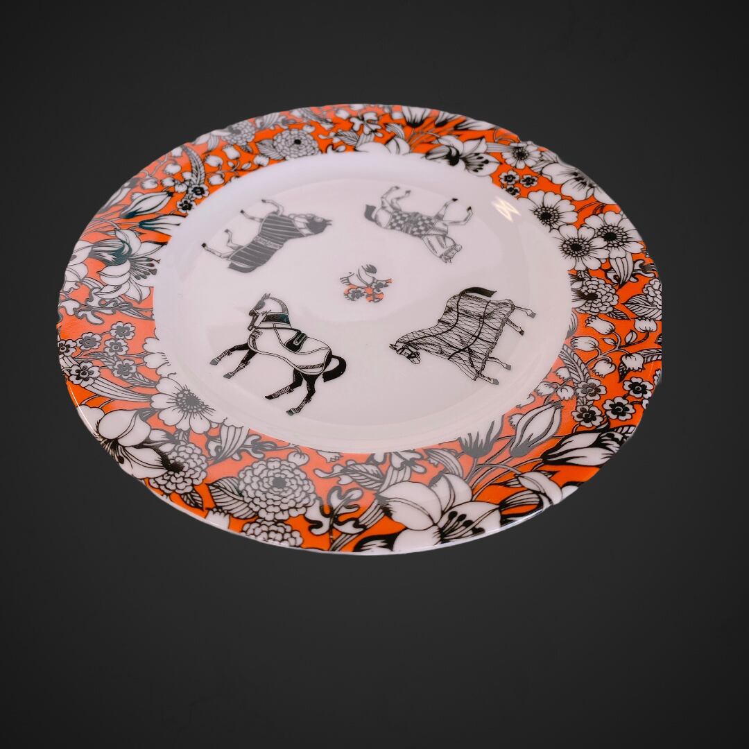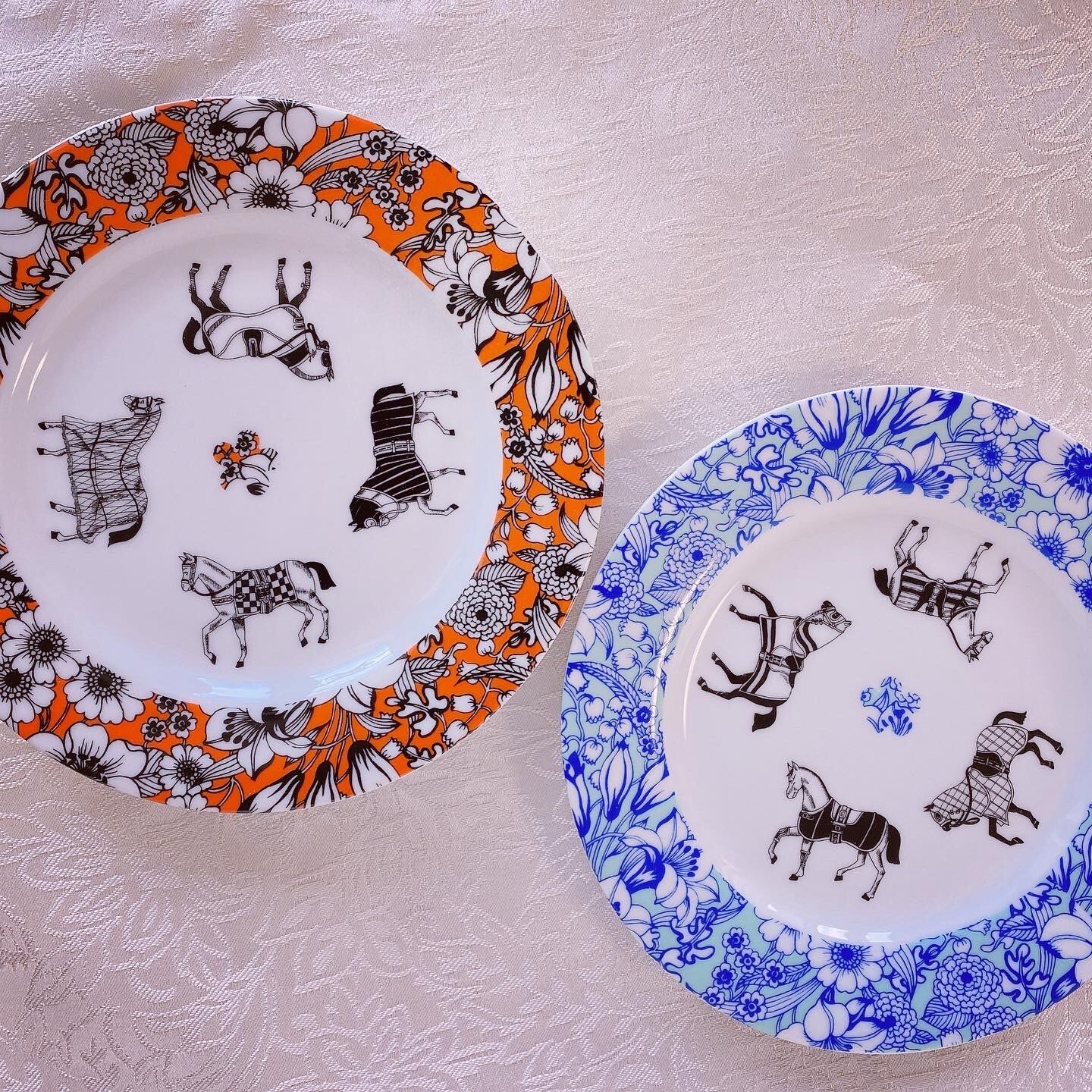 オリエンタルフラワーのリムにお馬さんがいっぱい、どの向きからも楽しいプレートです。