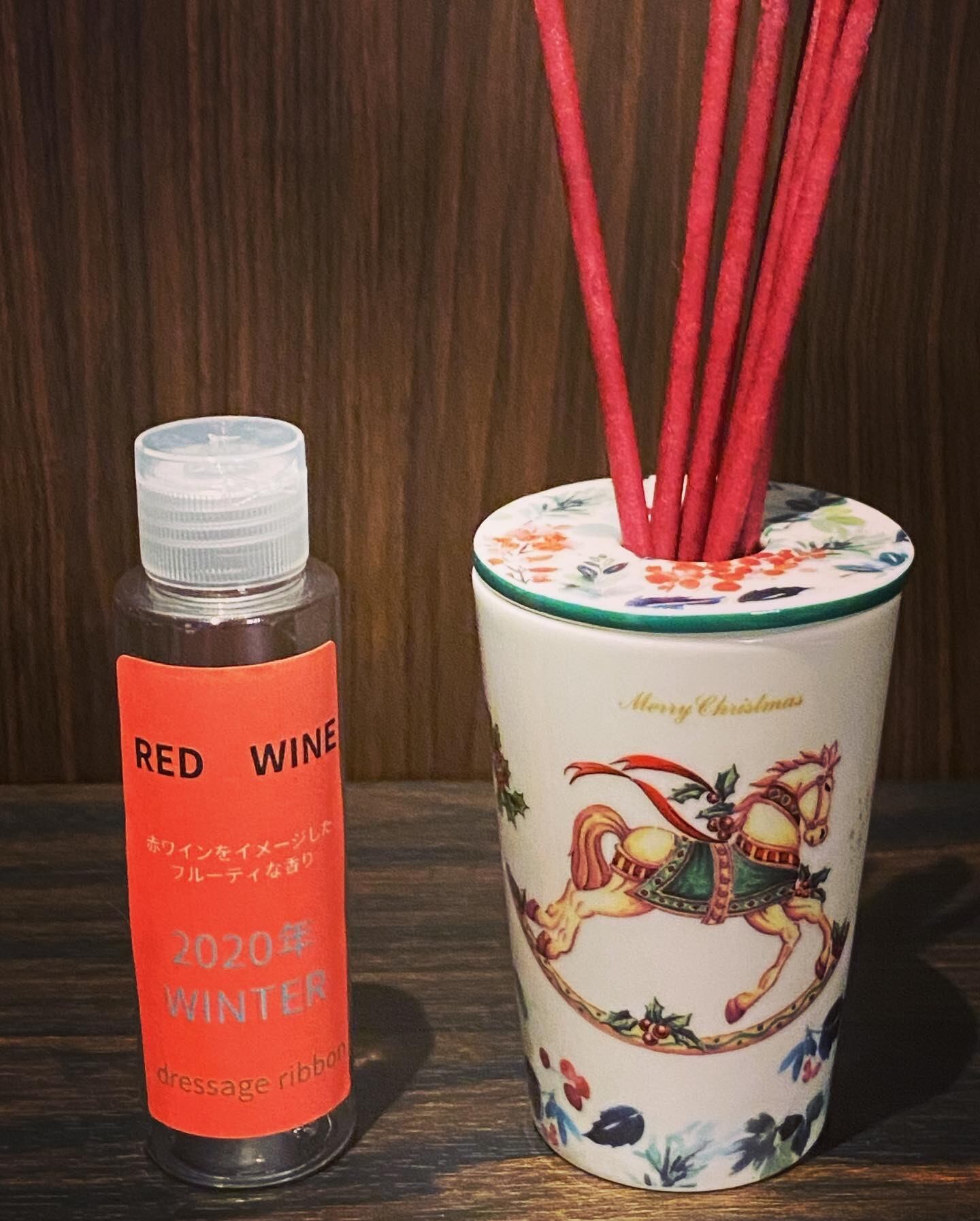 クリスマスカラーに赤く染色したスティックに、あらかじめアロマオイル『RED WINE』を染み込ませていますので、最初の2週間はアロマオイルなしでスティックだけでも香ります。