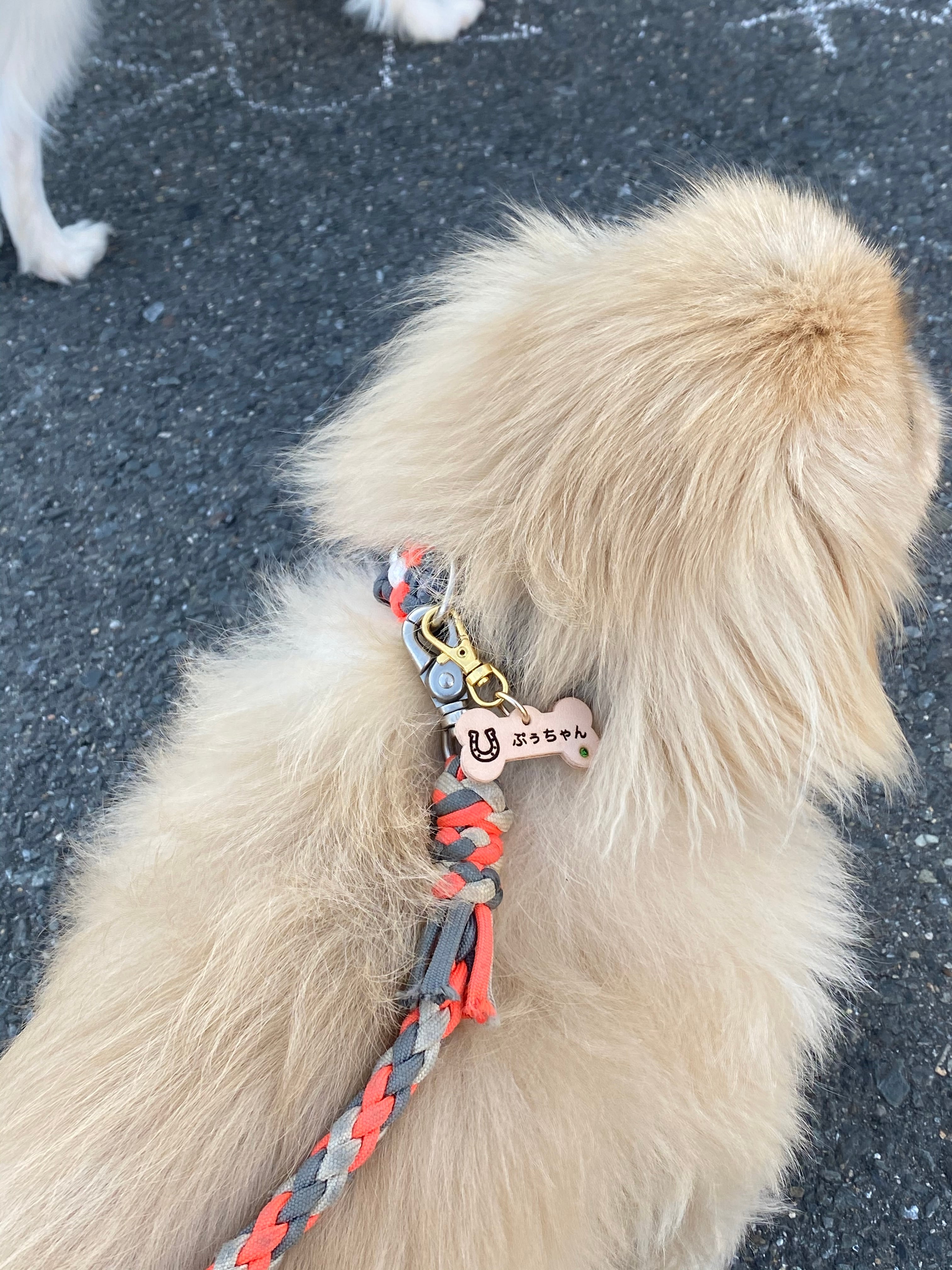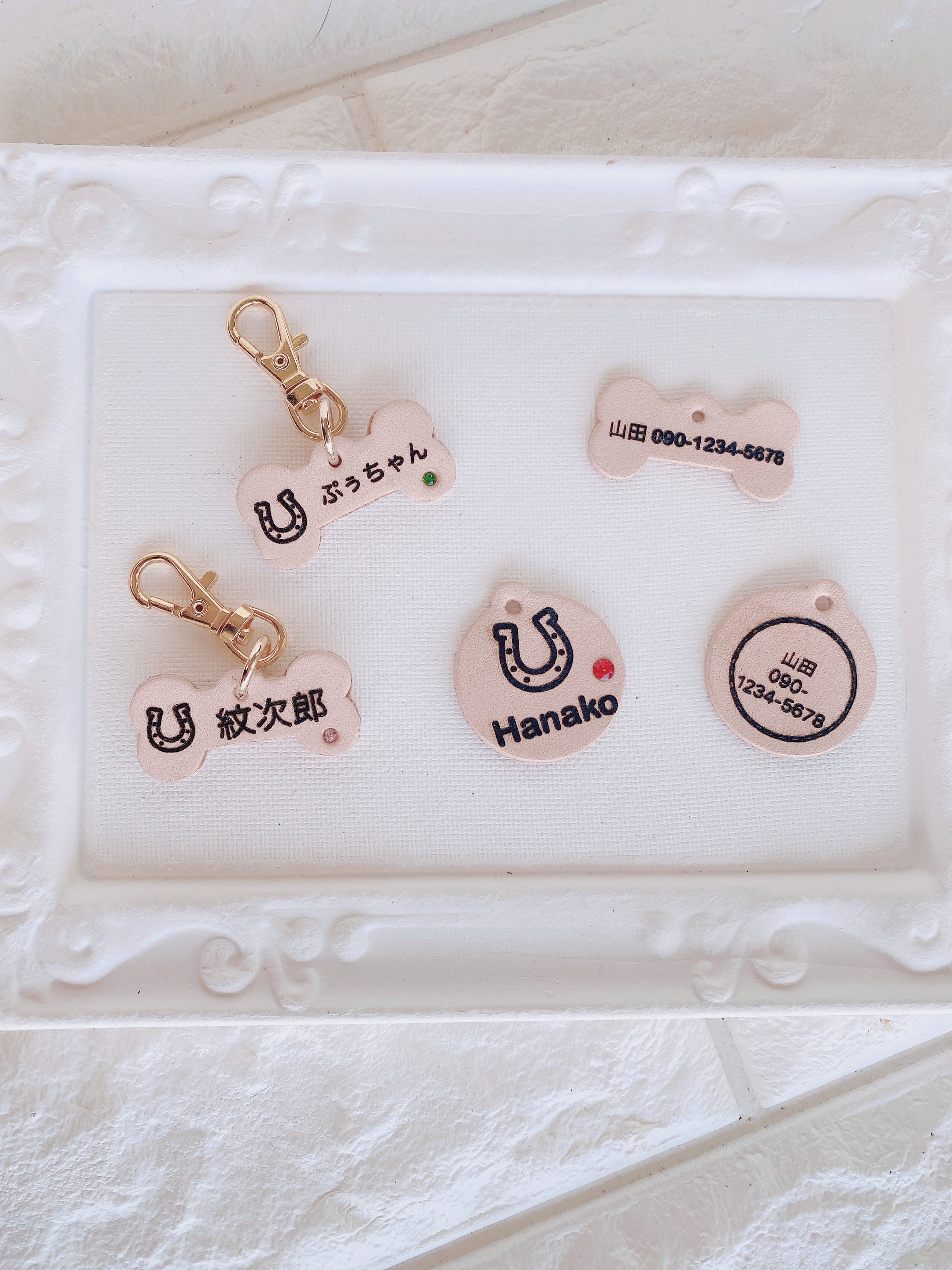 栃木レザーのナチュラル色にレーザー刻印で、表に馬蹄+ワンちゃんのお名前、裏に飼い主様の苗字と電話番号をお入れします。