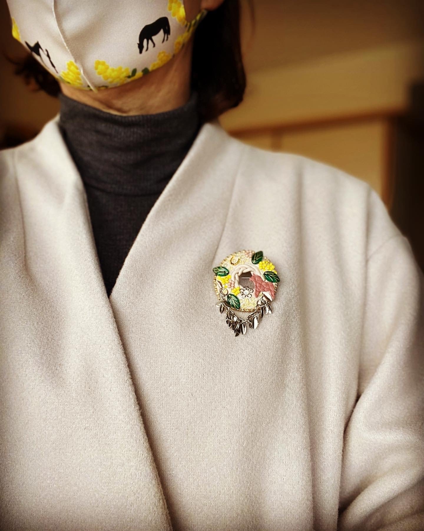 『春を愛でる』シリーズと同じイメージで、桜やミモザとお馬さんをあしらったリース型ブローチを作りました。