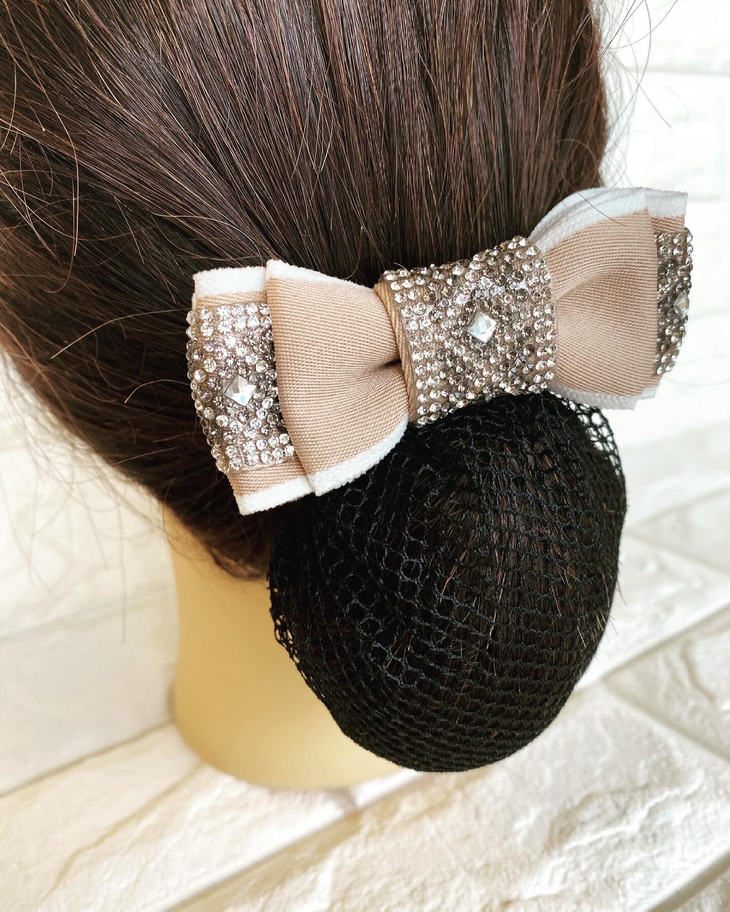 髪が短くギリギリまとめ髪ができる方でしたら、100円均一などで販売されているウィッグをヘアネットに入れていただければ、エレガントなリボンスタイルが楽しめます。
