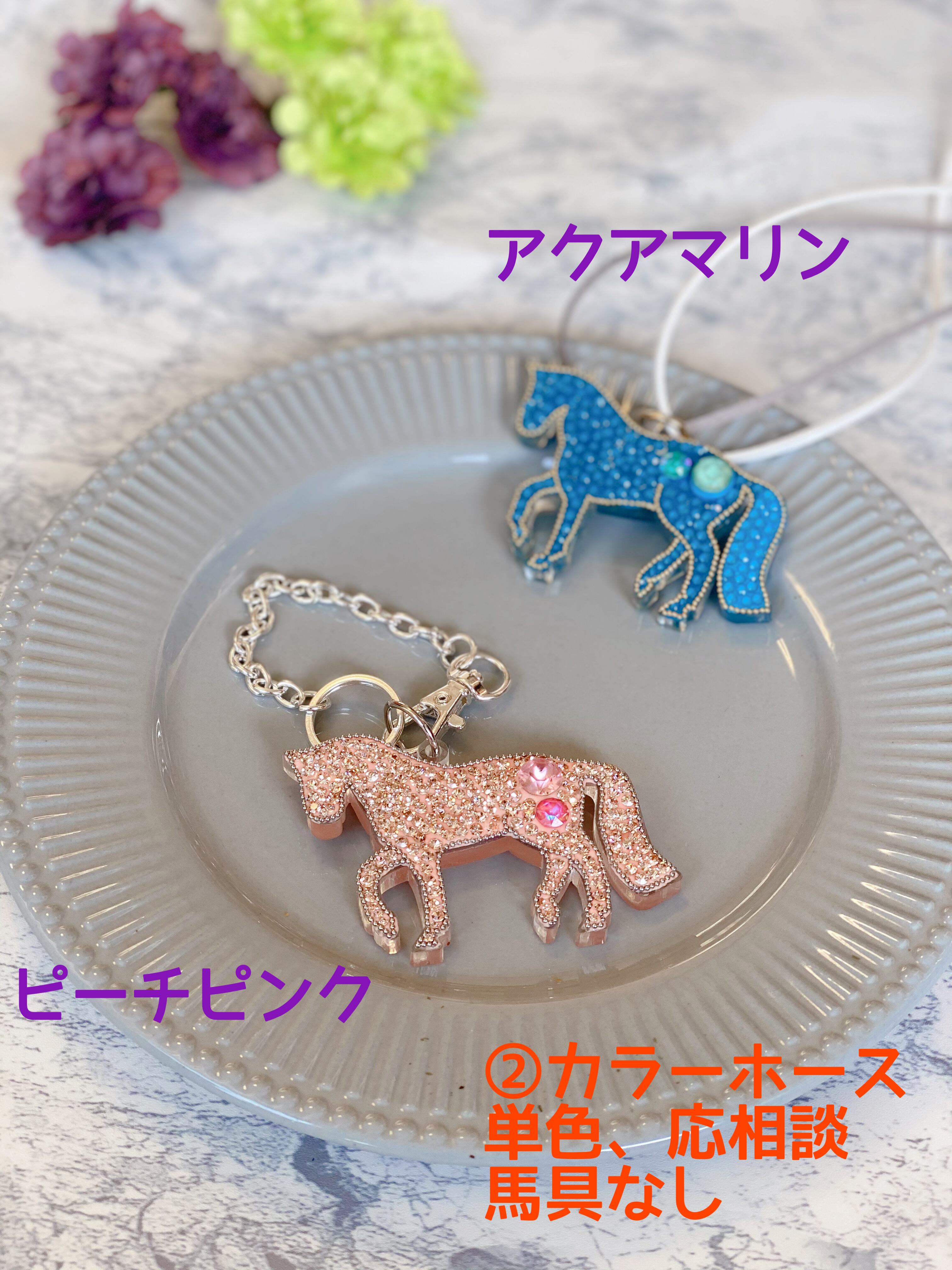 カラーホースver.でハートオプションを付けない場合は、本体カラーと同系色の中粒スワロフスキーを1、2個無料でお付けします。個数や色は選べません。