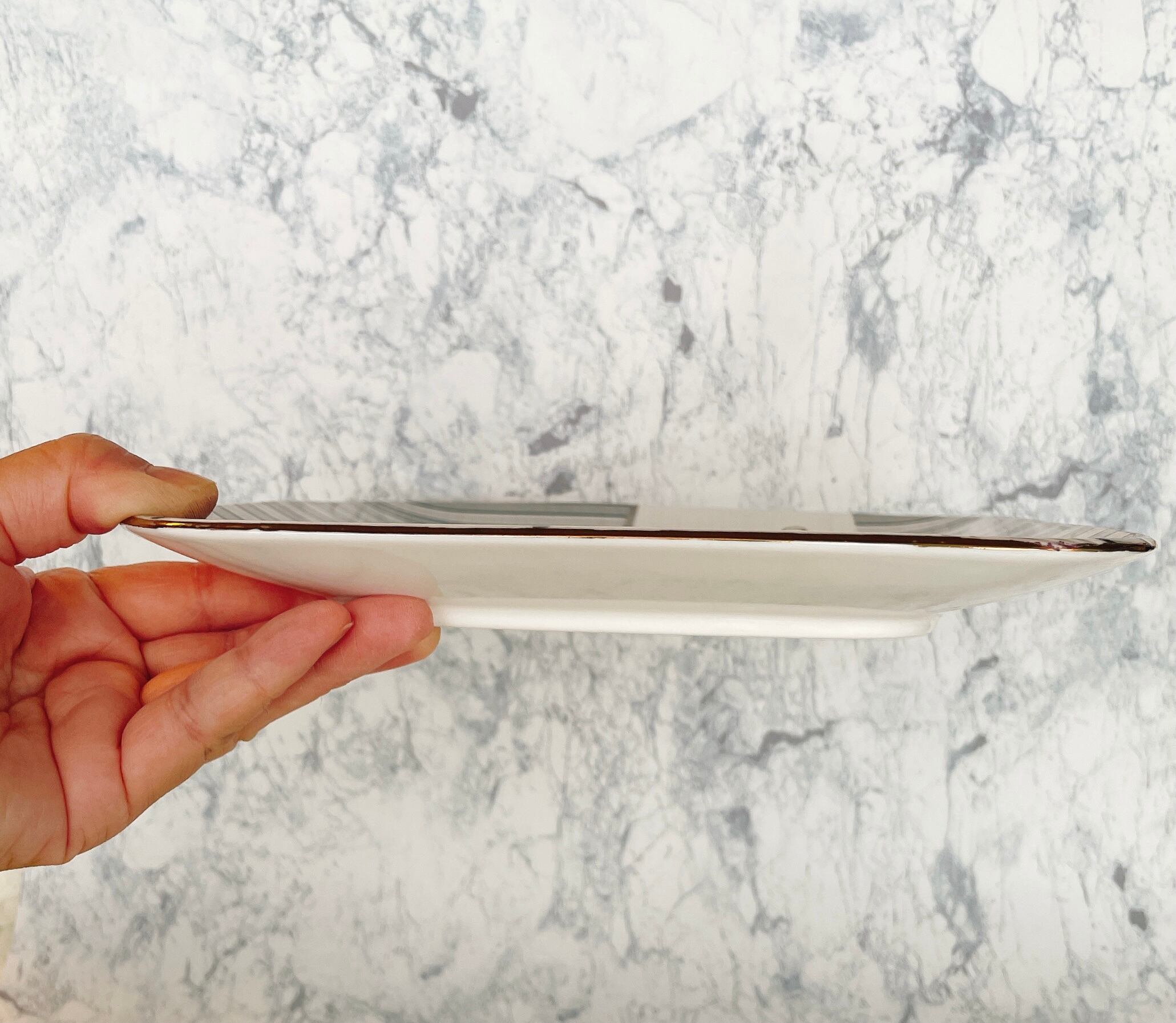 お皿の縁には金彩、デザインの中央付近はプラチナラインでミラーのように光りますが、電子レンジ対応の素材ですので安心して毎日の食卓にお使いいただけます。