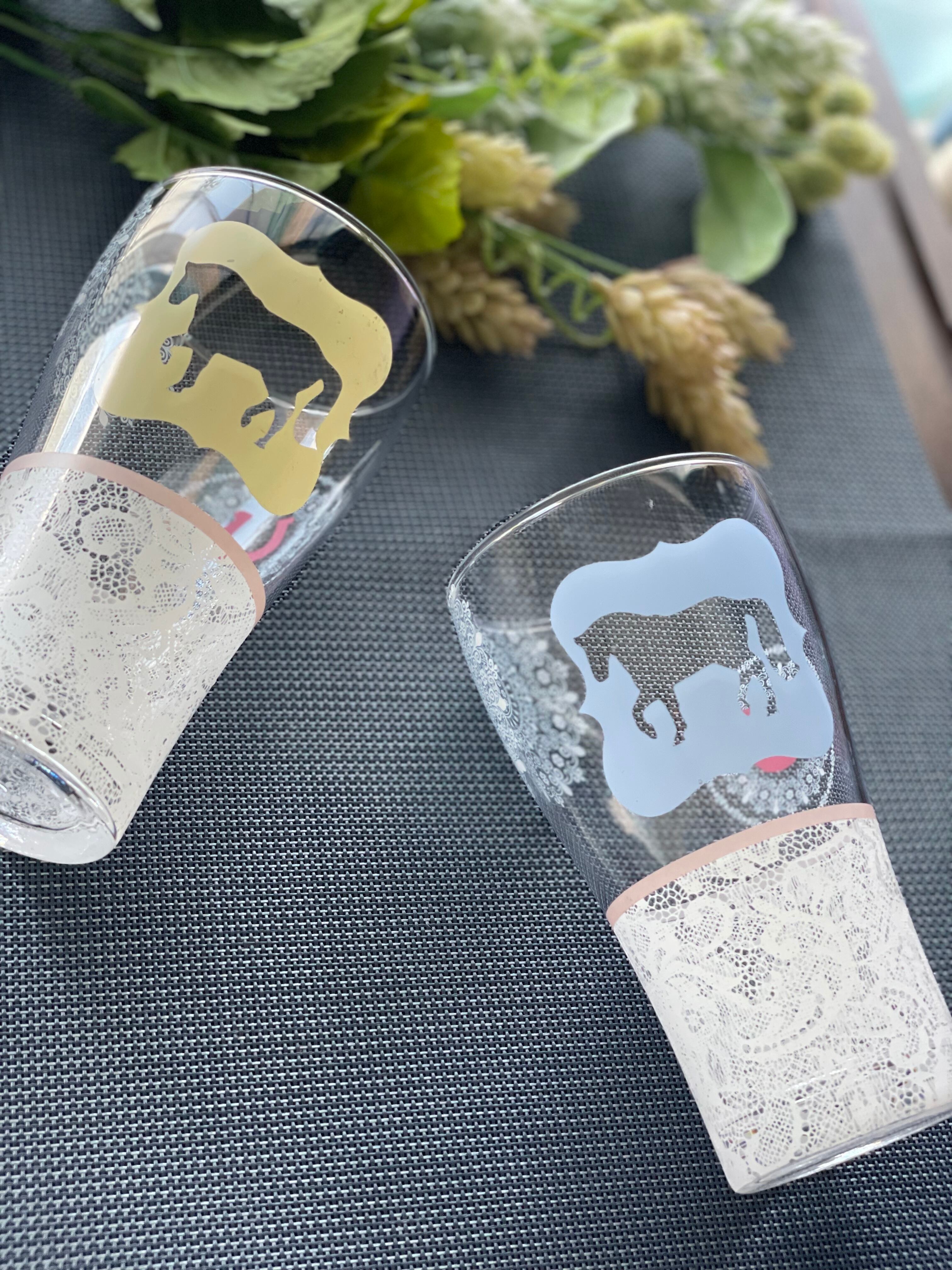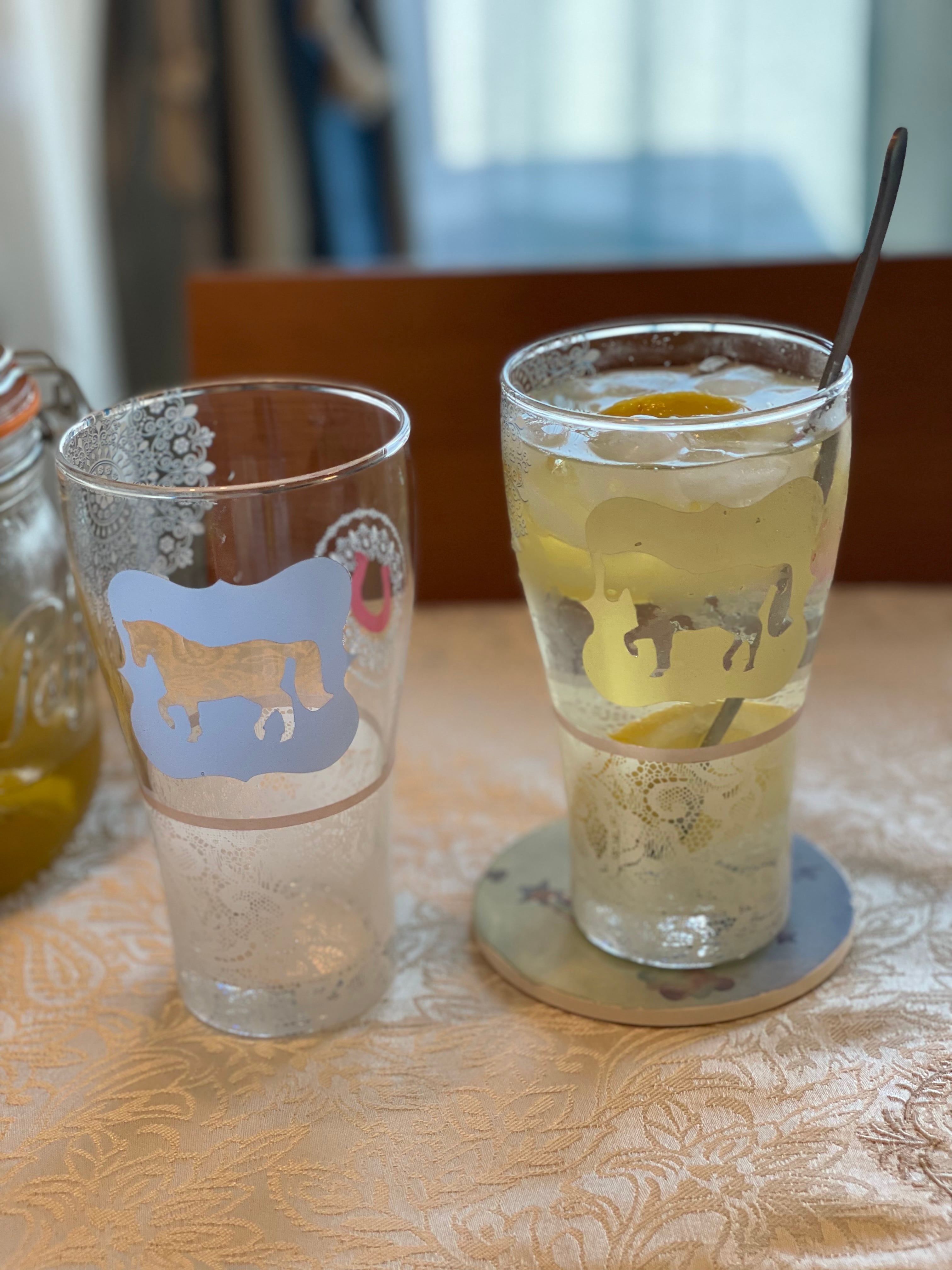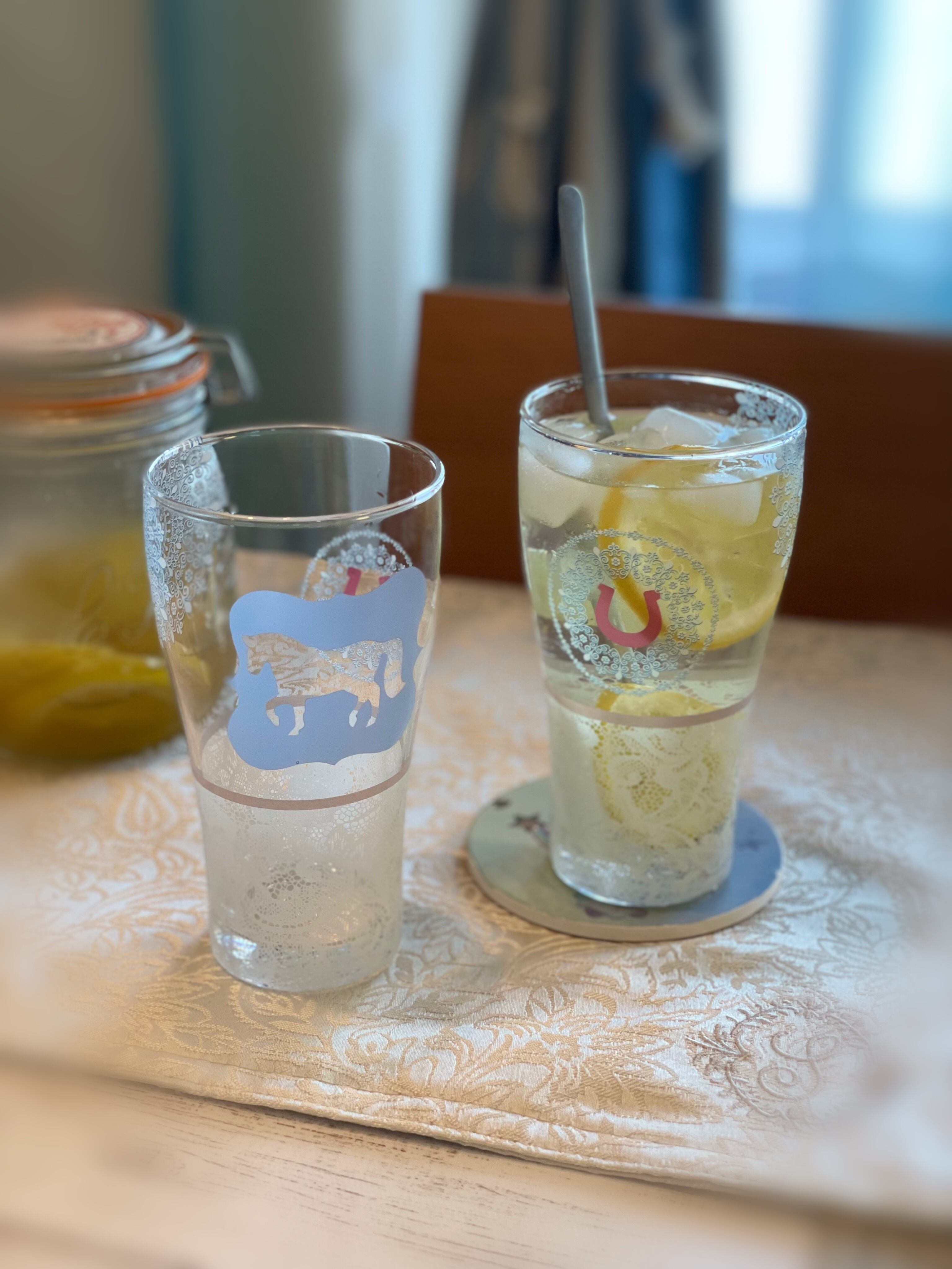 夏向きのグラスは中の飲み物の色を魅せつつ、大好きなお馬さんや蹄鉄マークが浮かぶデザインにしました。