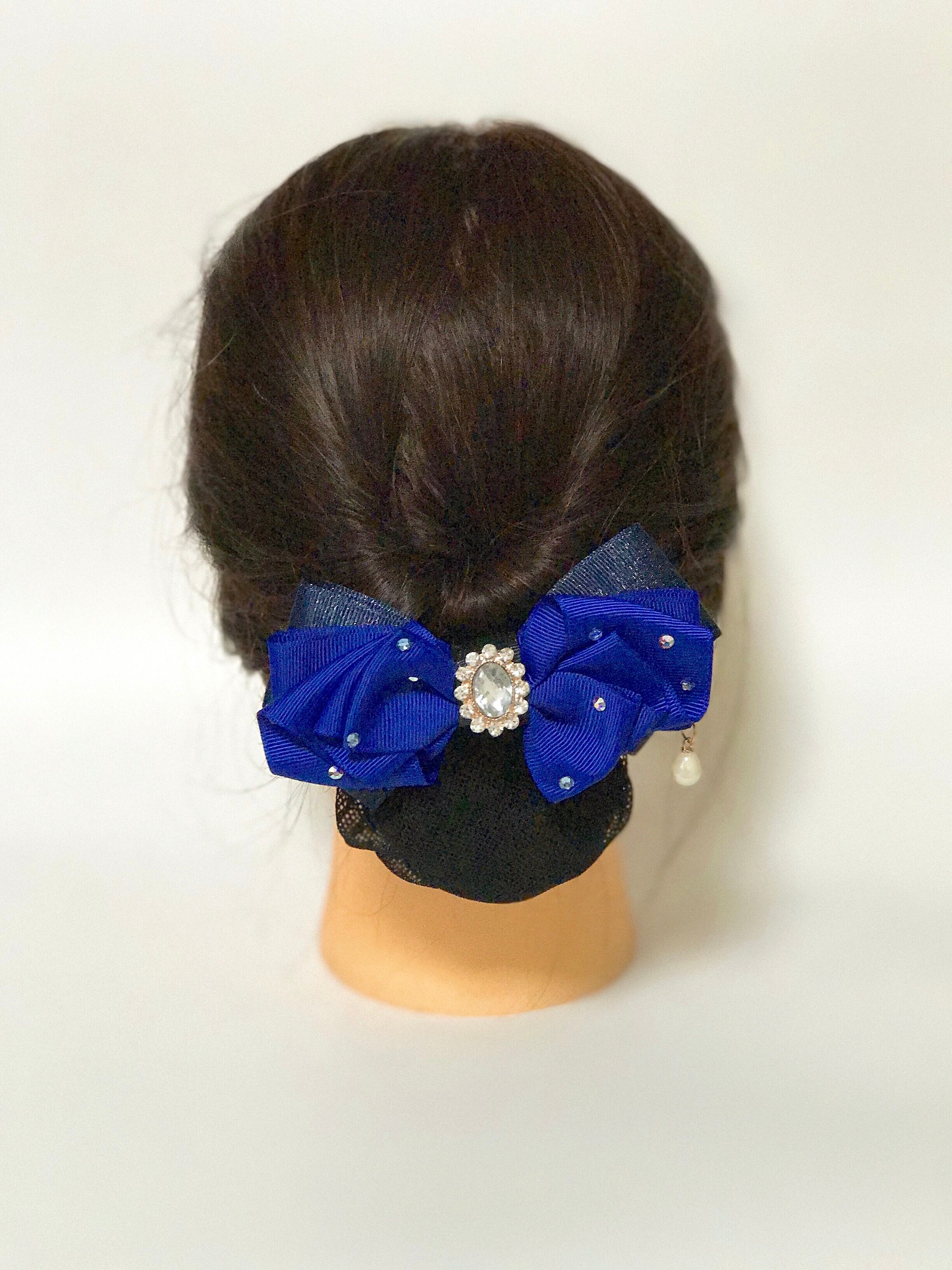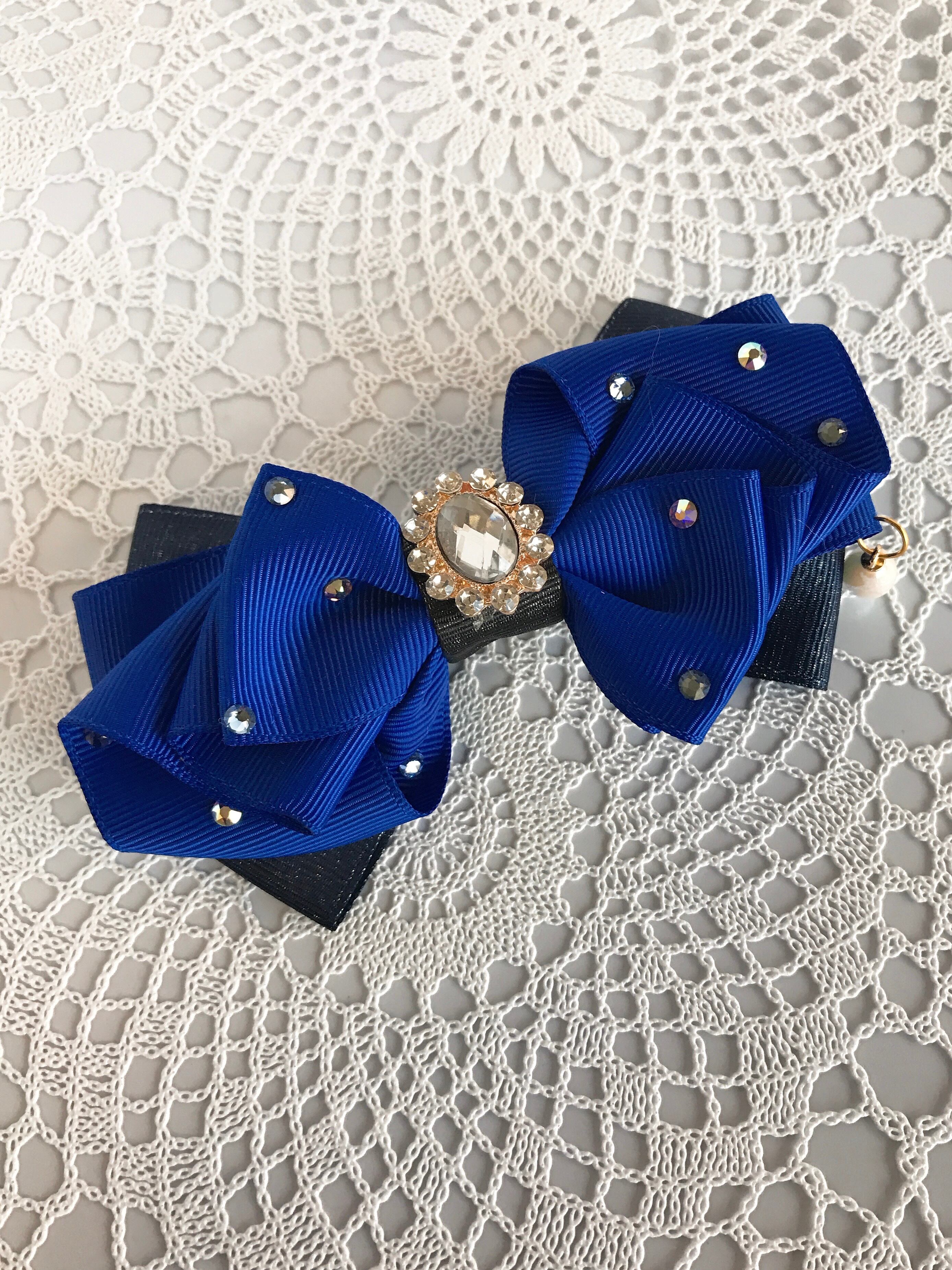 鮮やかなサファイアブルーのグログランリボンに大きめのスワロフスキーを水玉のように散りばめたシンプルかつ上品なリボンバレッタです。