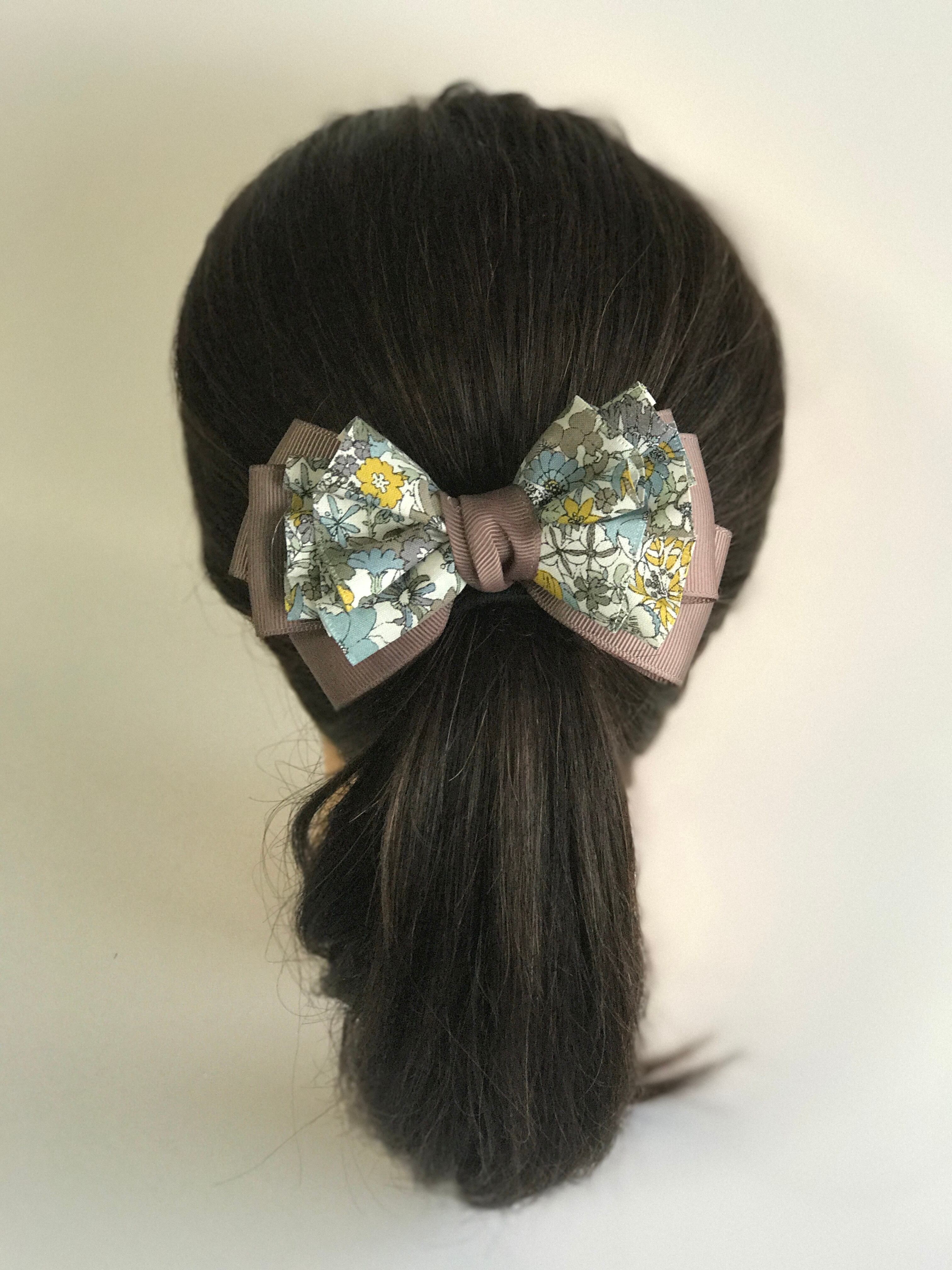サイドにフリルがたくさんついた甘いデザインの可愛い系リボンですが、こちらは珍しいボタニカルなお花柄のファブリックリボンを使いました。