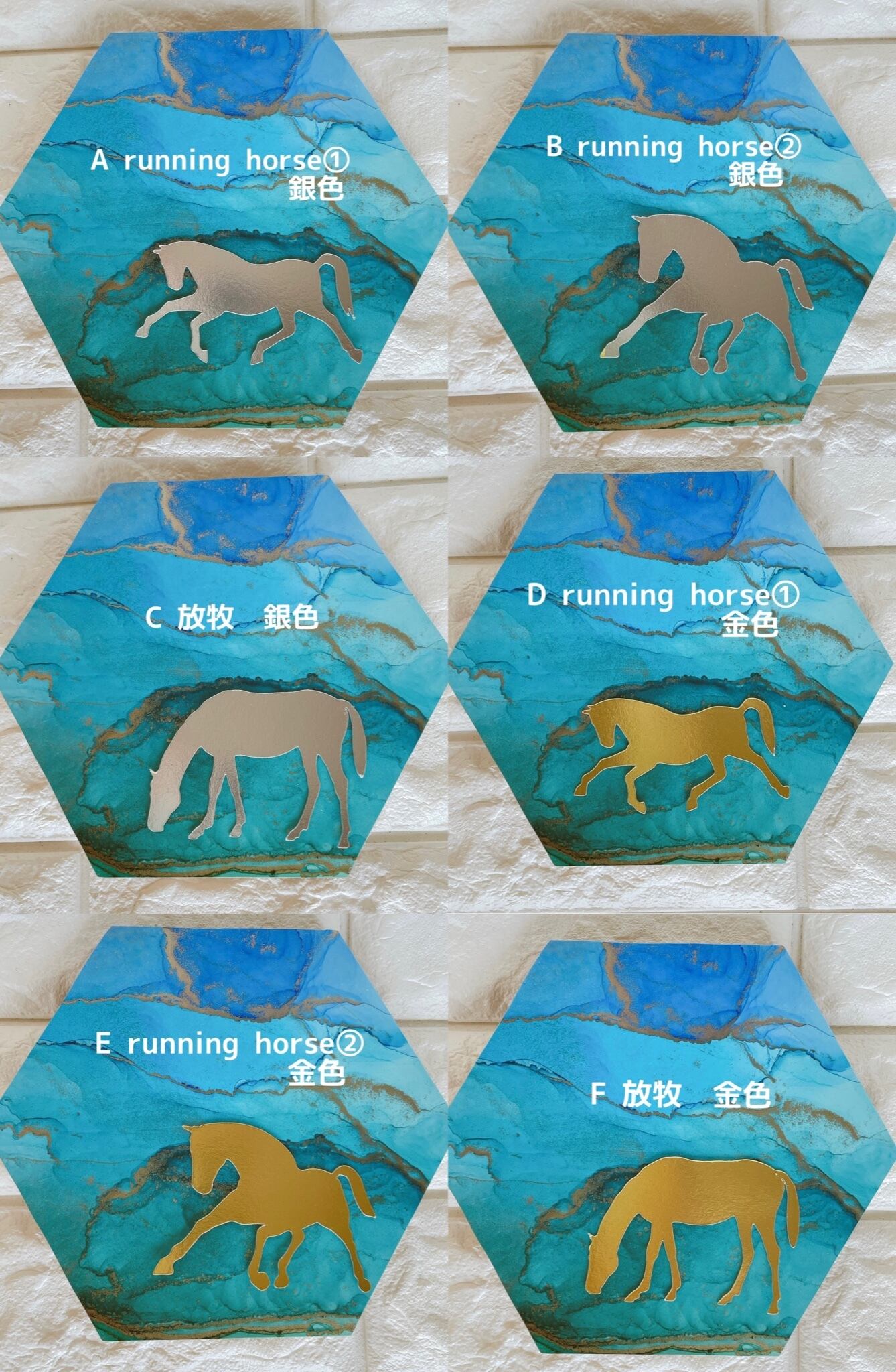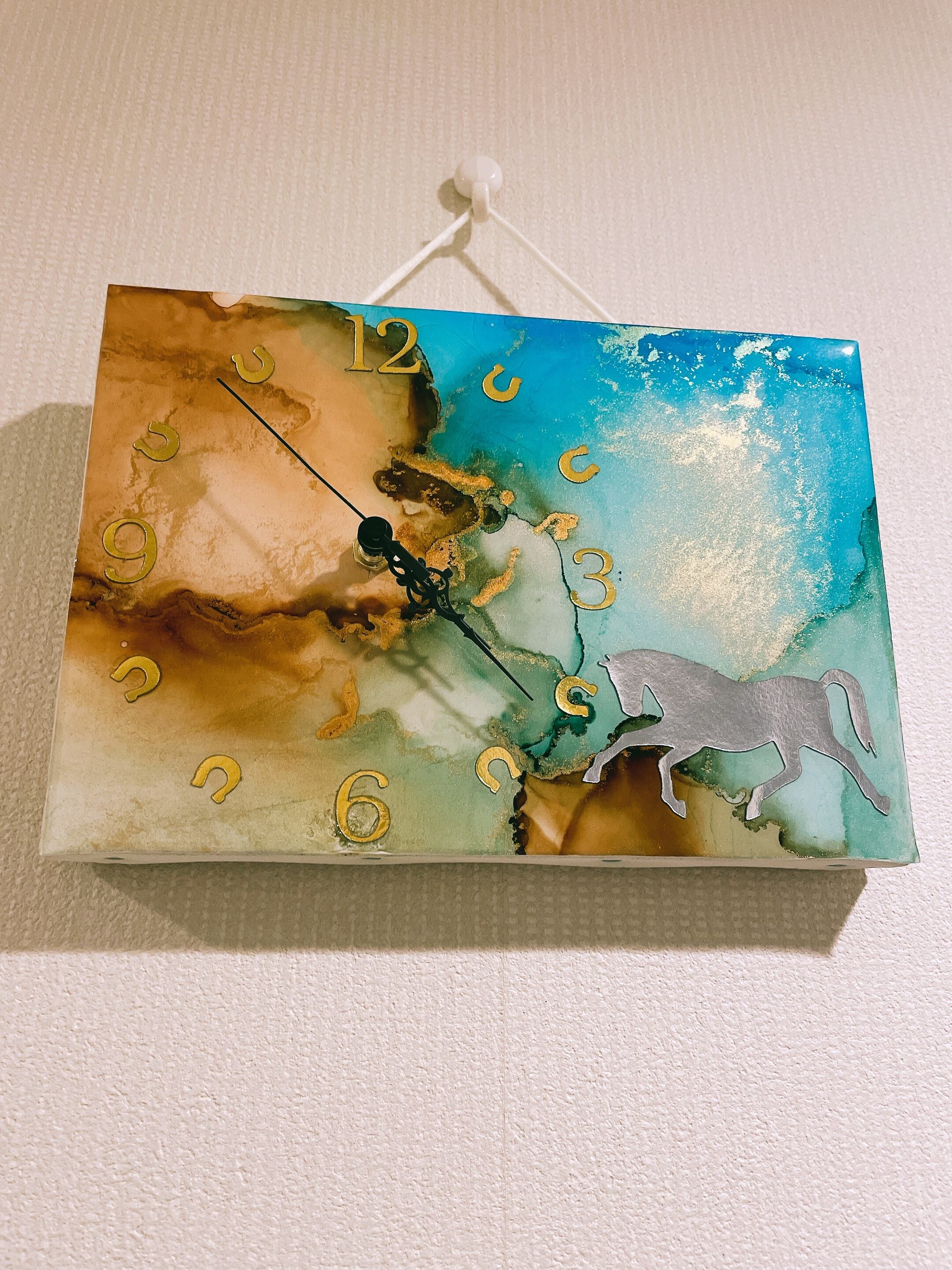 長方形の壁掛け時計はアルコールインクアートの原画の表面をツルツルに加工した美しいアートに、馬のシルエットが浮かび上がるデザインです。