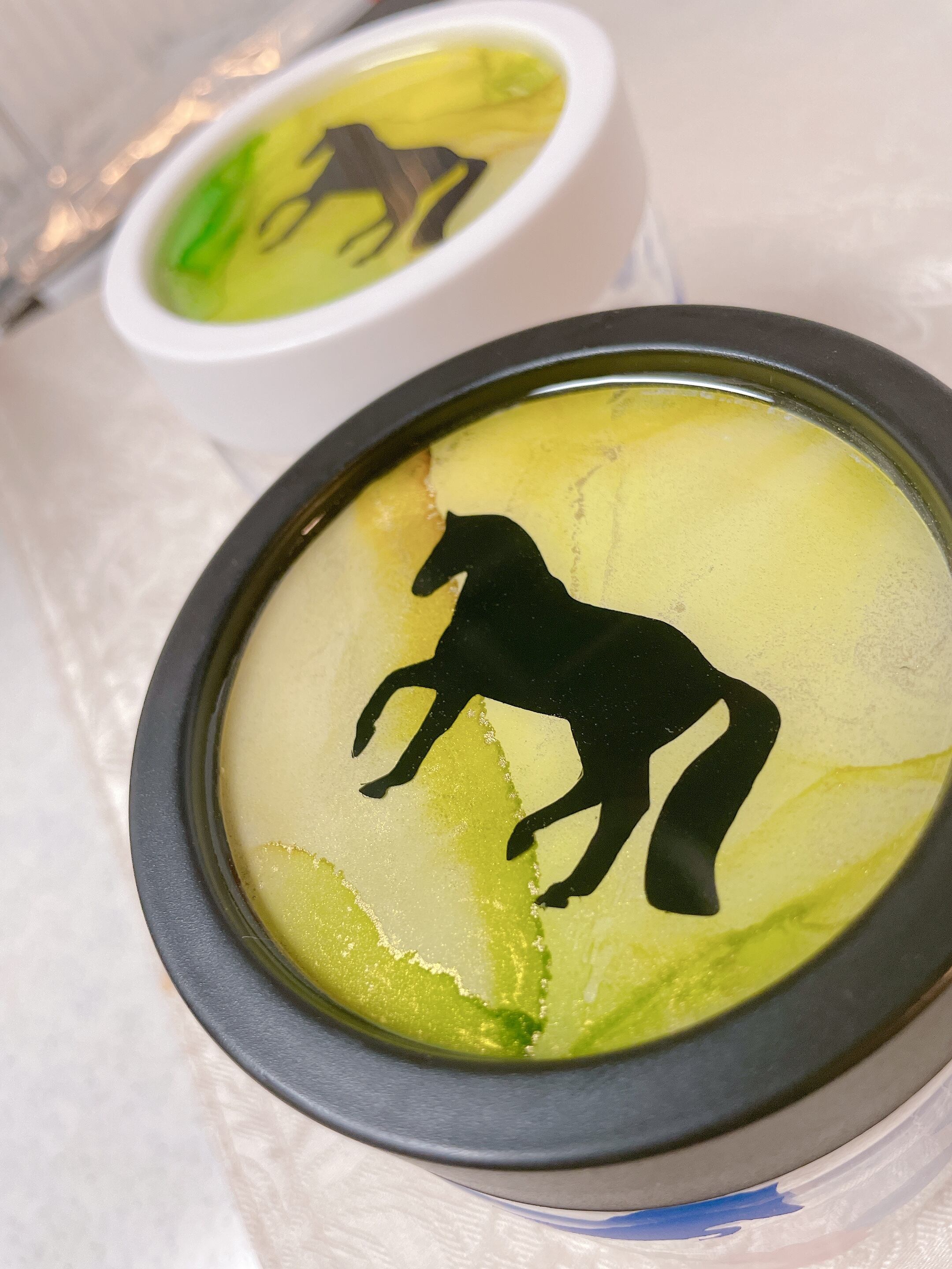 アルコールインクアートで描いた春色黄緑系のデザインにしっかりとドレッサージュホースのシルエットが浮かびます。