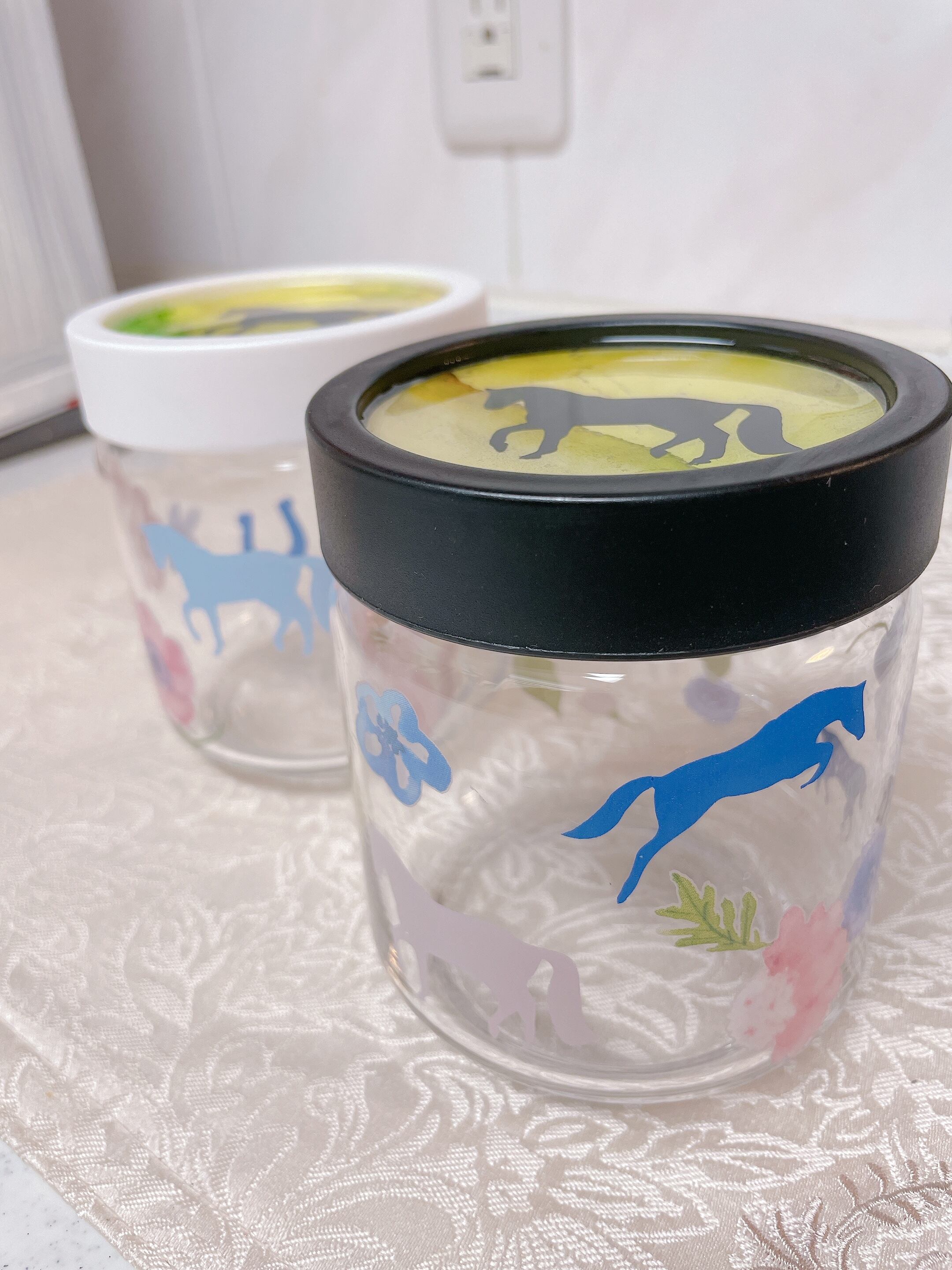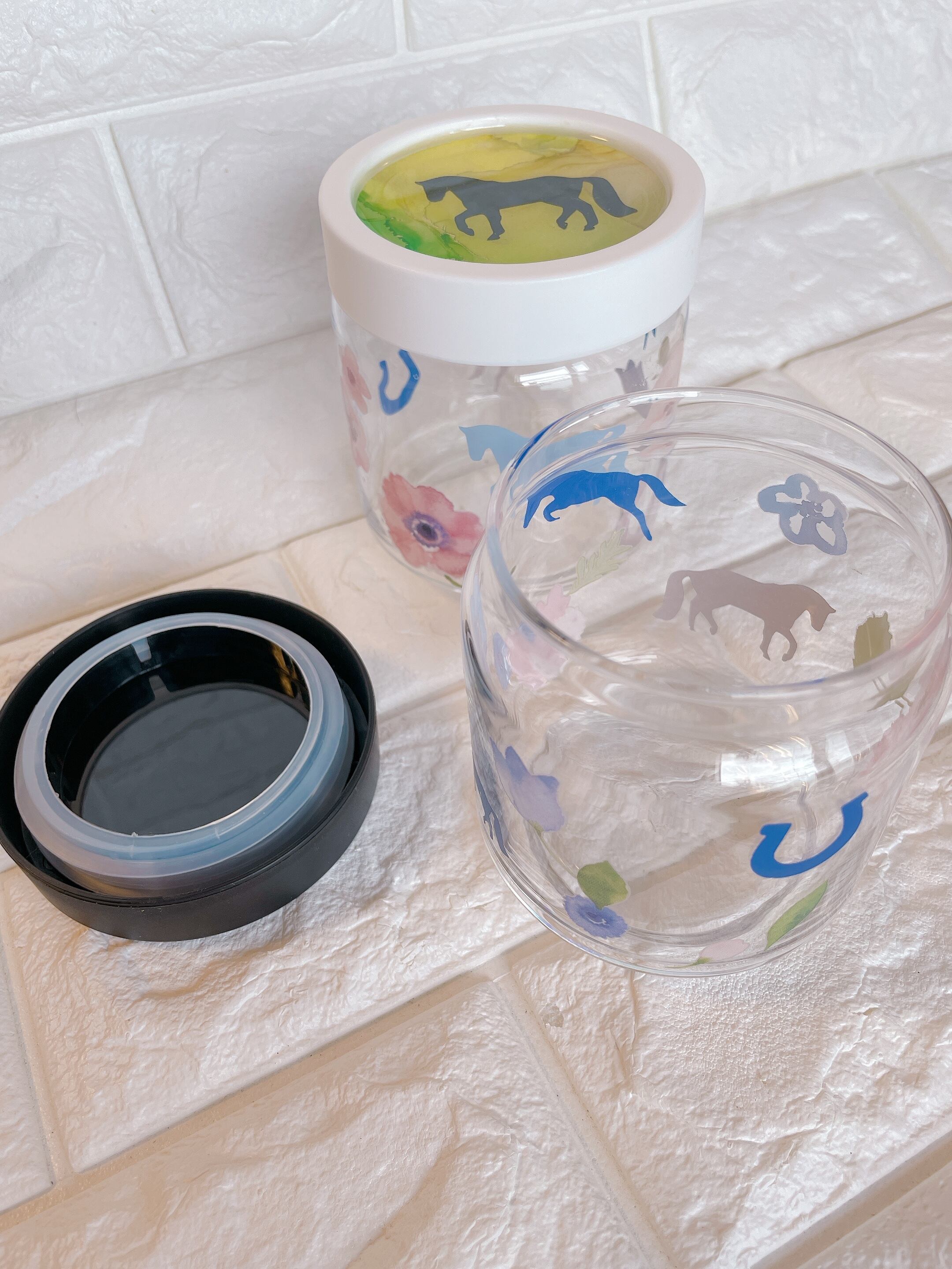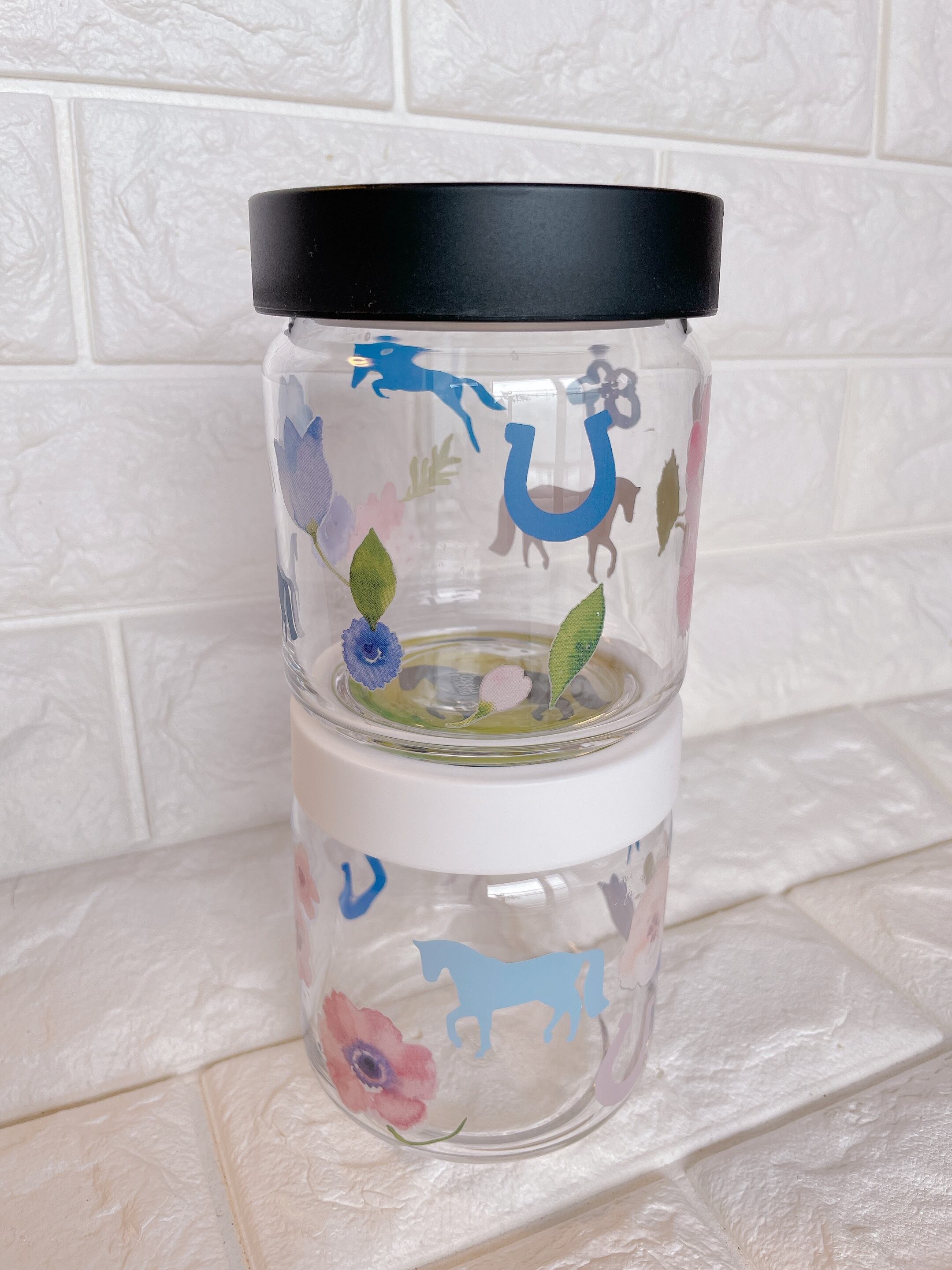 積み重ねOKのガラスの小瓶は、春のお花やドレッサージュホース、蹄鉄が散りばめられたデザインです。