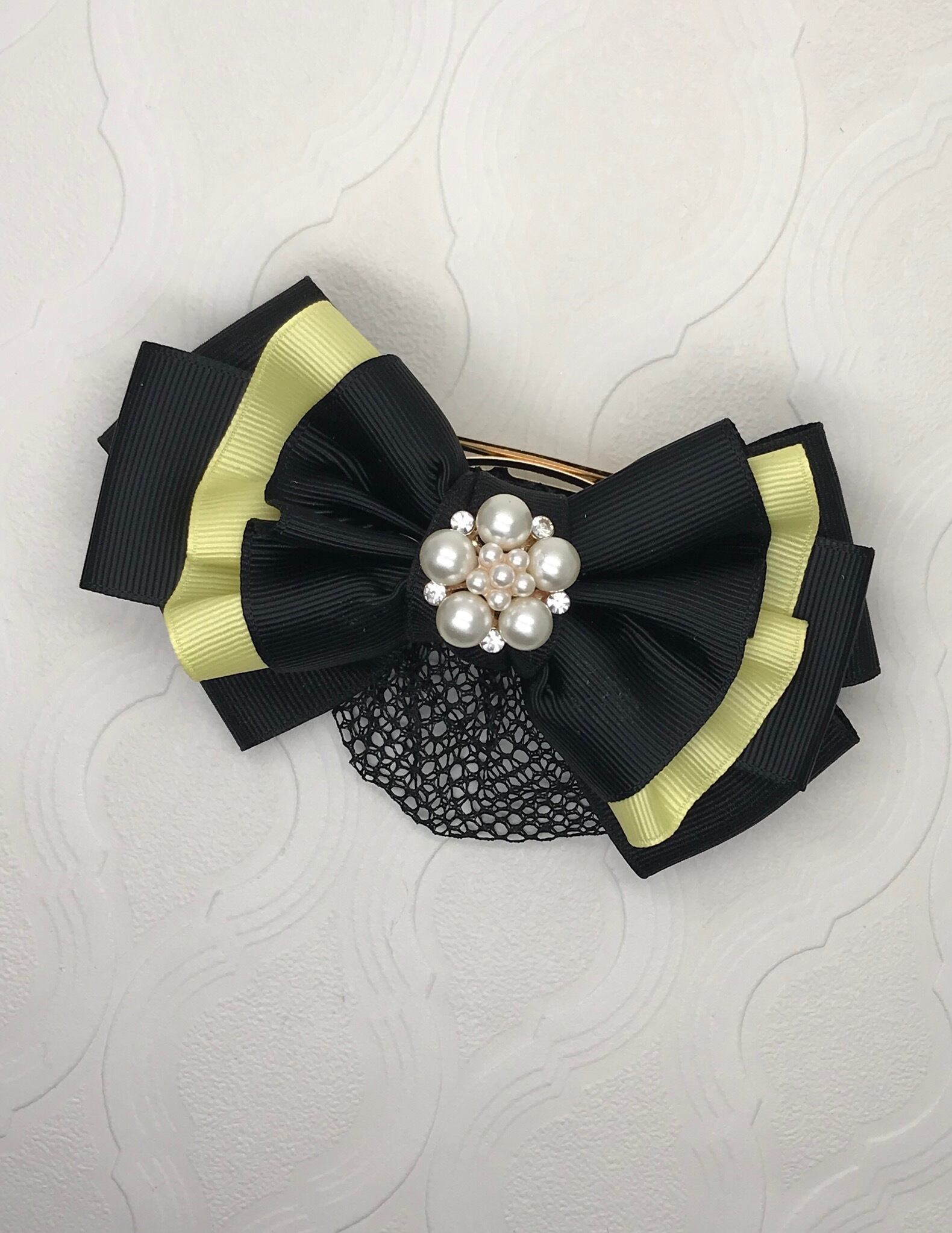 漆黒のリボンは張りがあって上品なリボンですが、柔らかなパステルイエローのリボンをフリル状に合わせてみました。