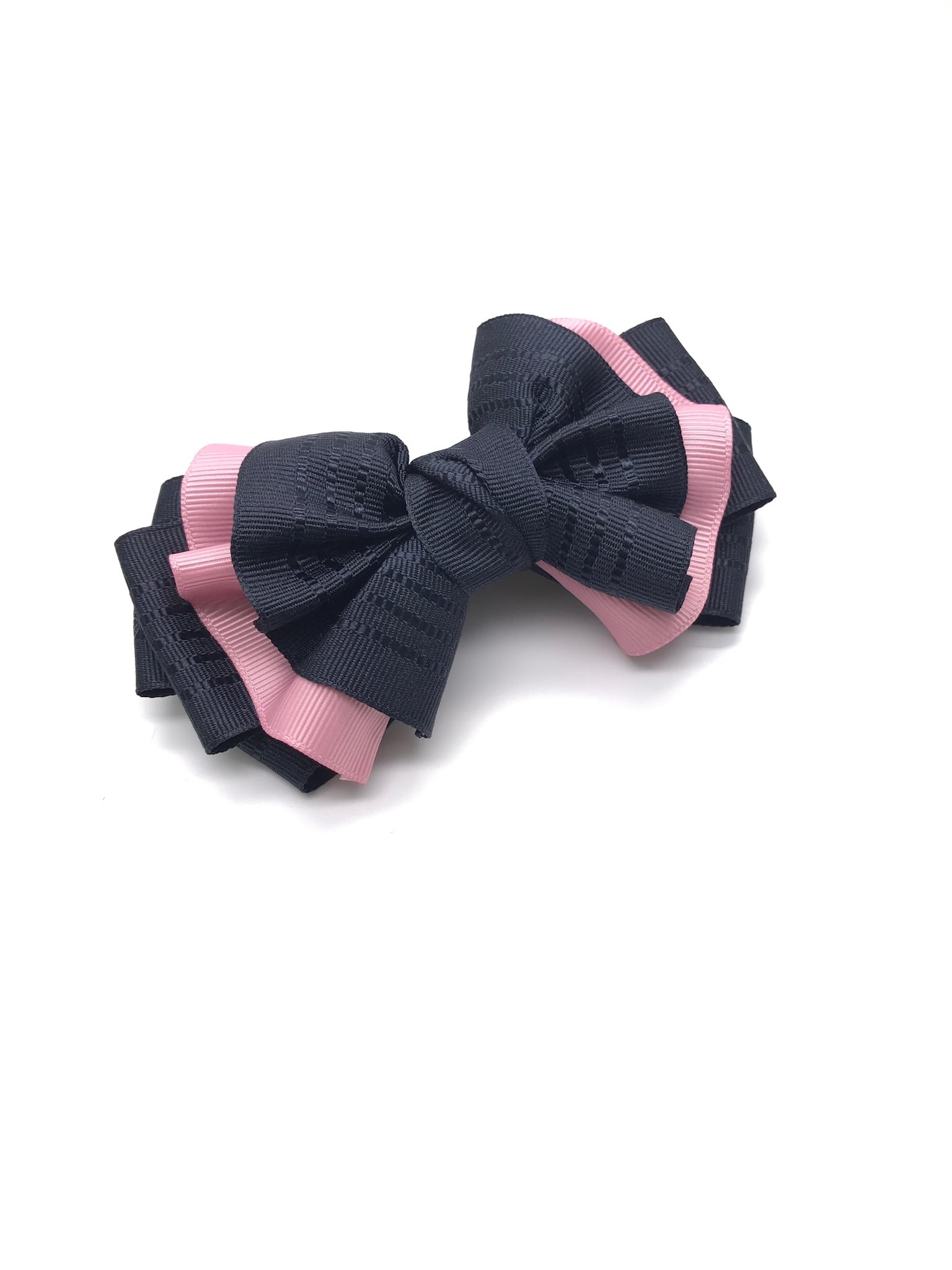 紺色のリボンはエンボス状にストライプ柄が浮き出る上品なリボンですが、柔らかなピンク色のリボンをフリル状に合わせてみました。
