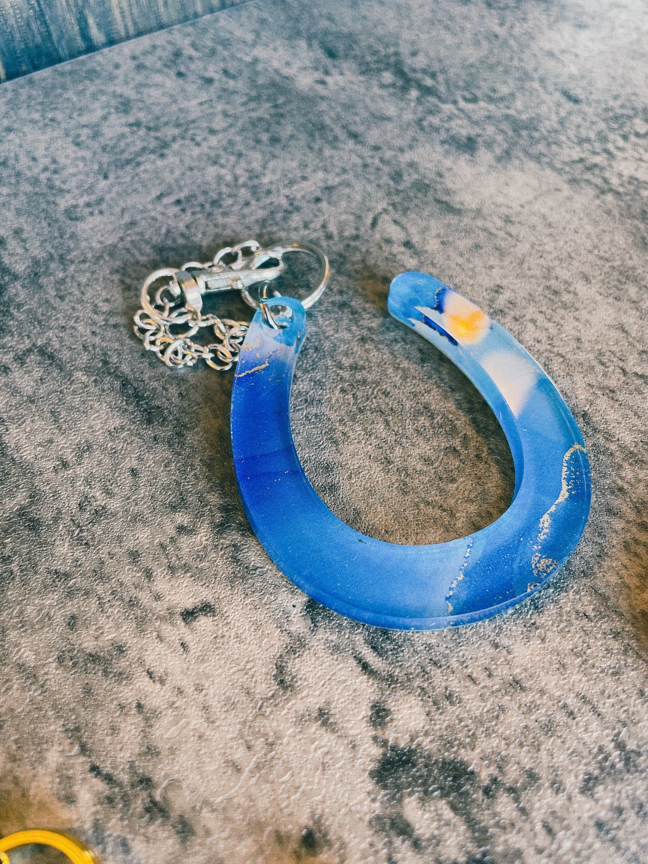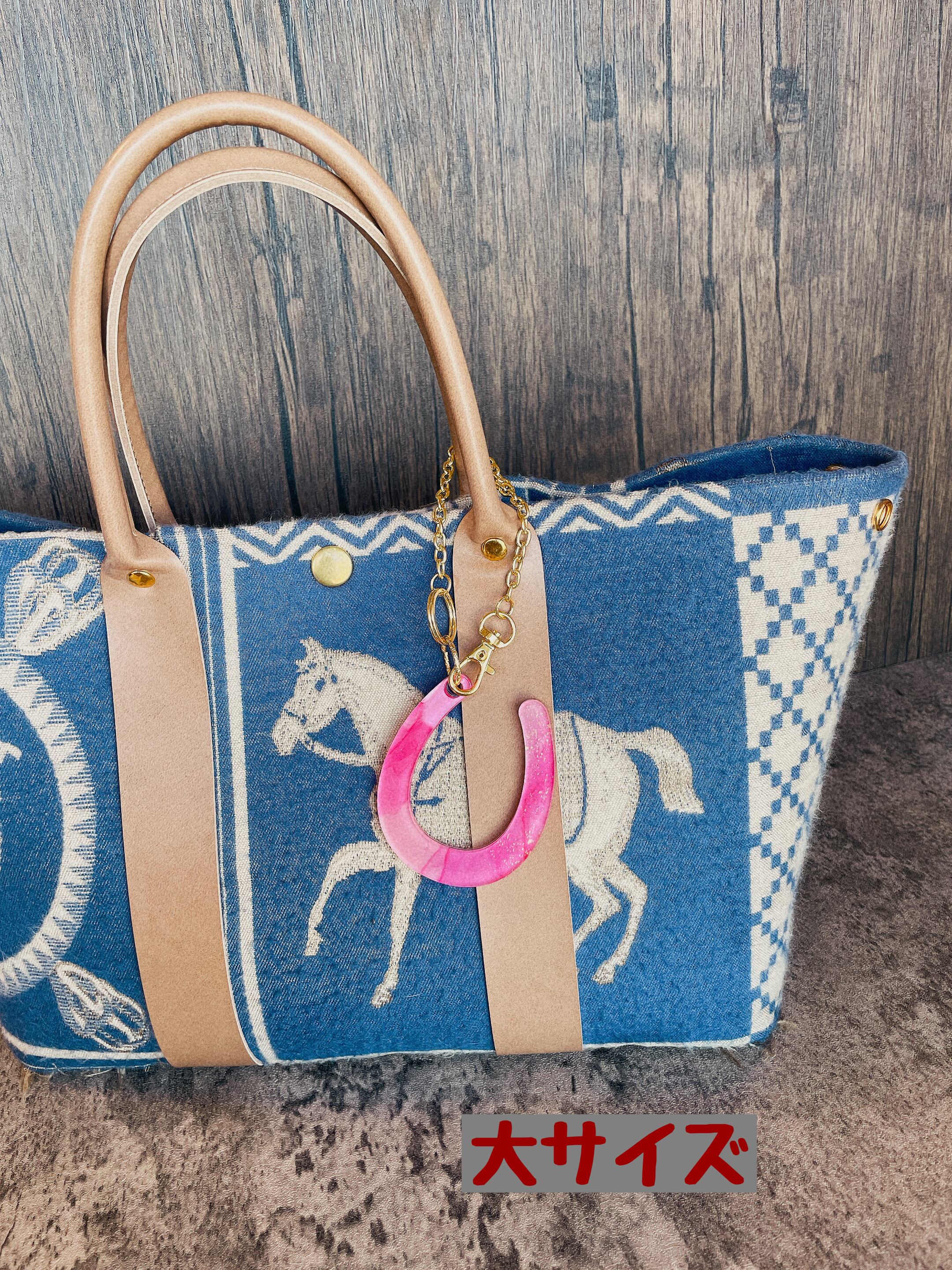 アルコールインクで専用紙に自由に描いたアートを、クリアなアクリルに転写した蹄鉄型バッグチャームです。