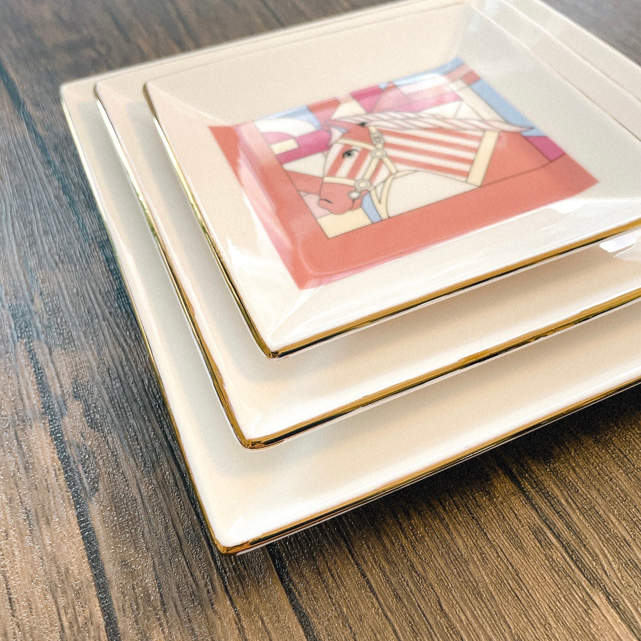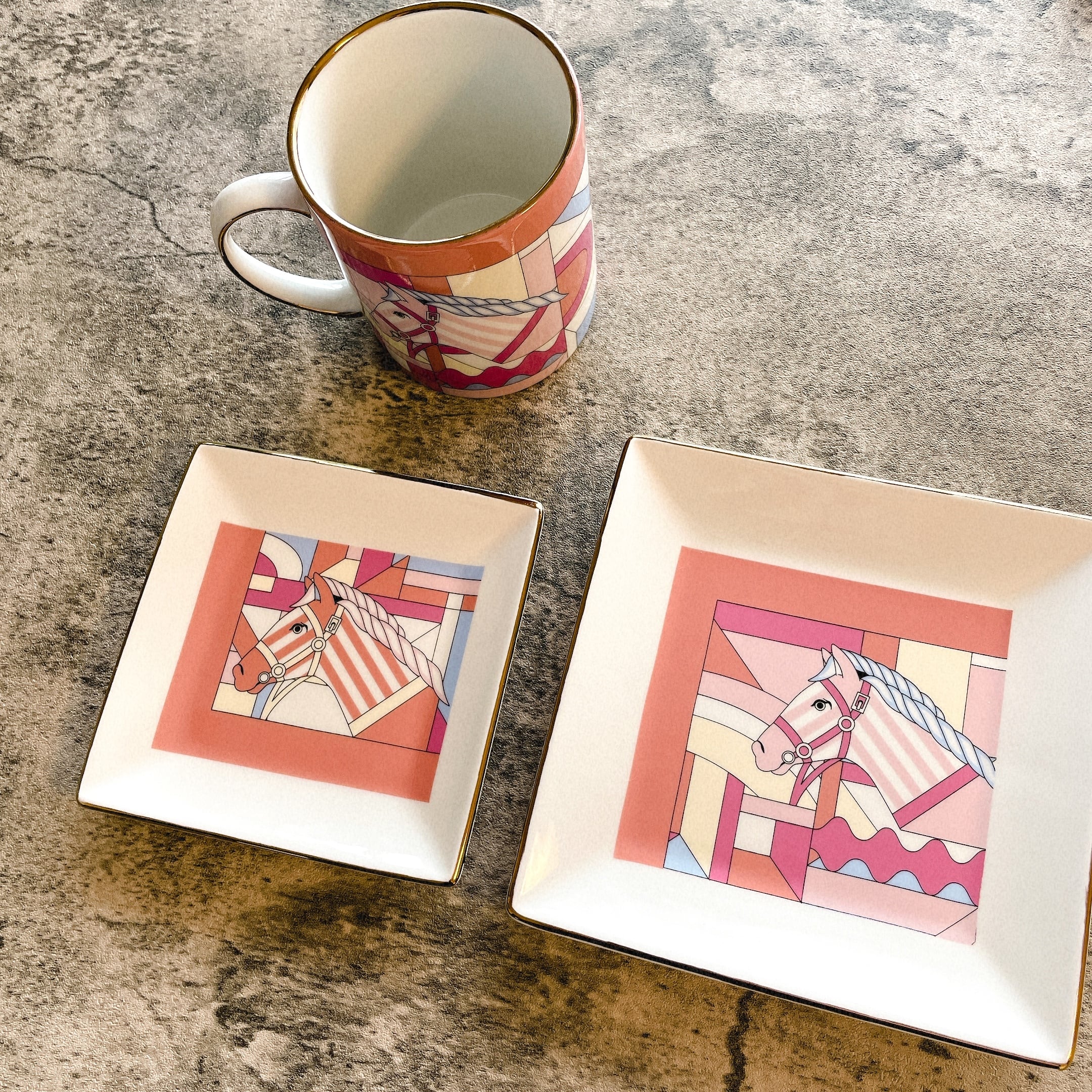 サーモンピンク基調のプッチ柄に可愛いお馬さんが大きめに描かれた正方形の平皿です。
