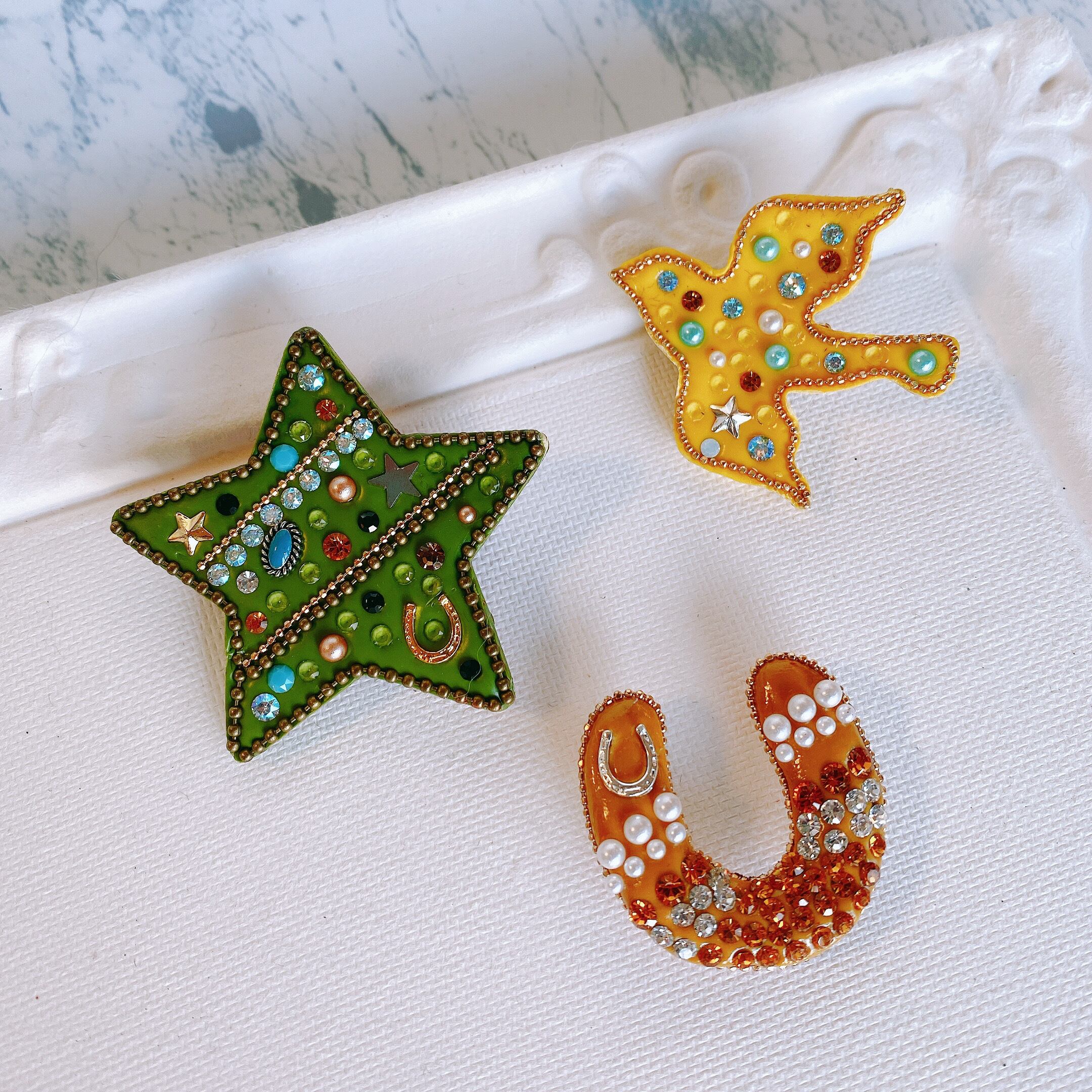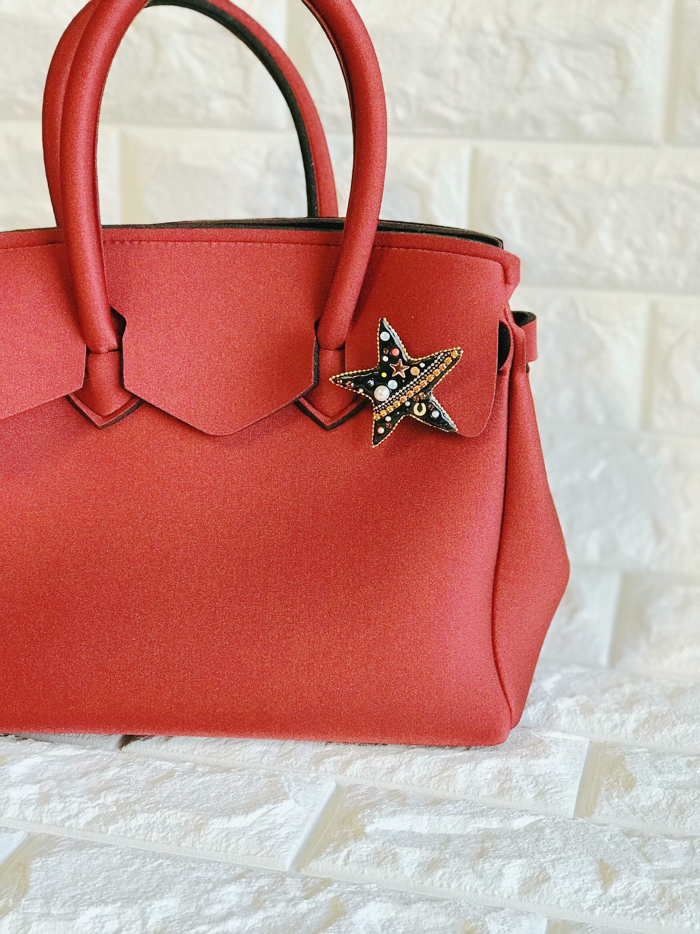 大きさ4cm四方の星型ブローチで、襟元や帽子には大きめデザインのブローチとして着けられて、カバンやポーチにはワンポイントになるサイズのブローチです。