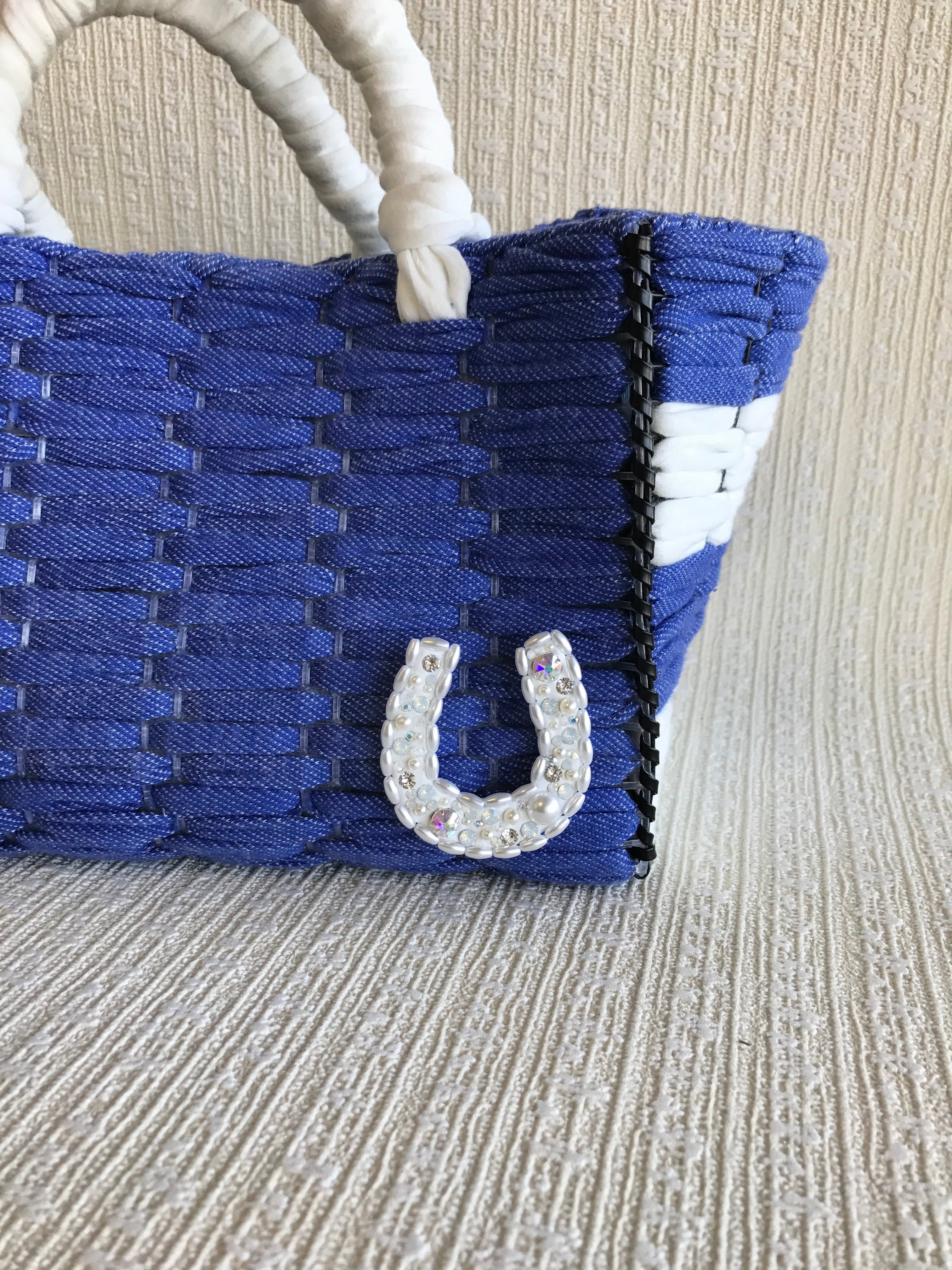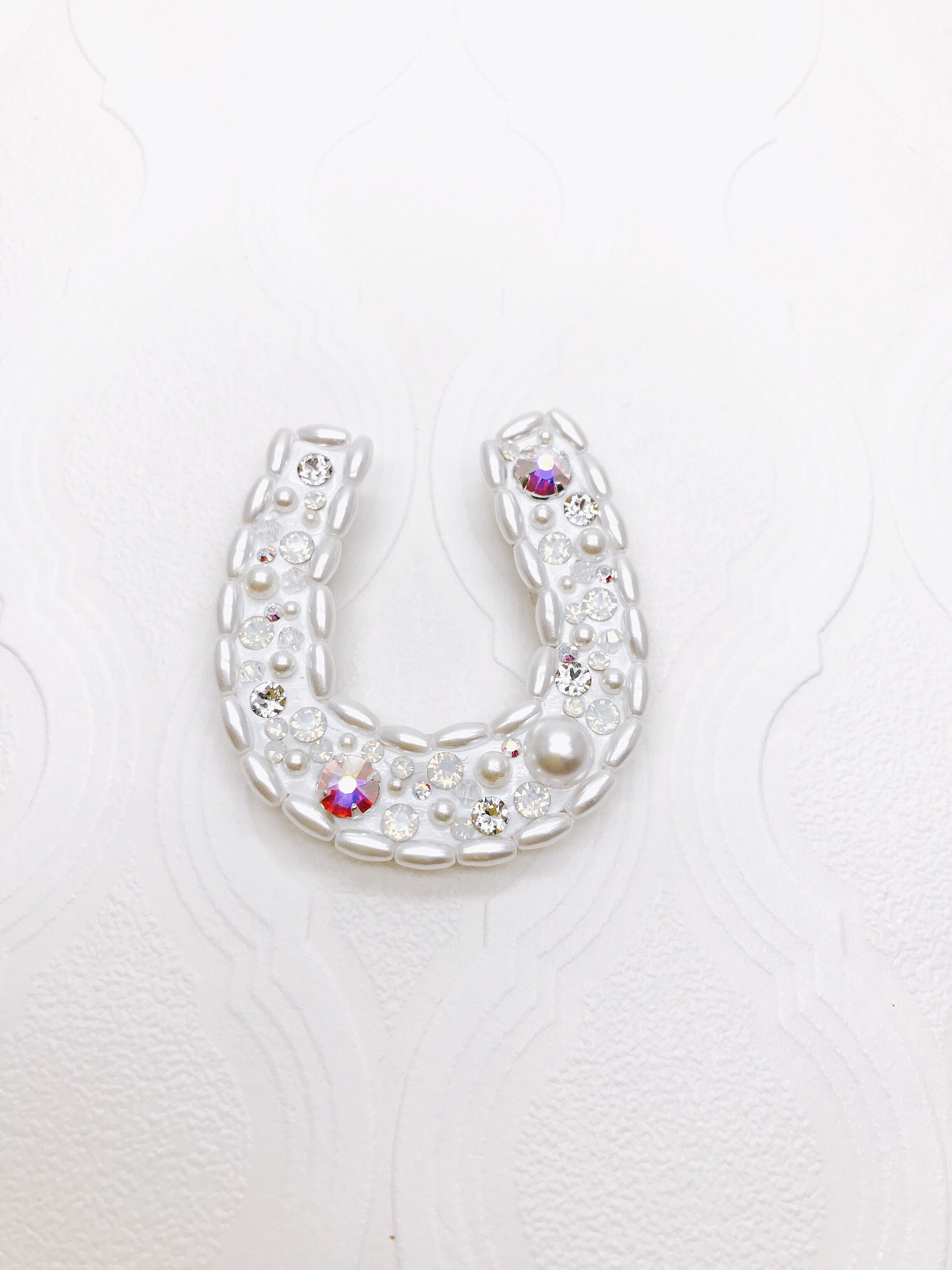 パールで型どった蹄鉄マークのホワイトベースに、ホワイトオパール、クリスタルオーロラなどのホワイト系純正スワロフスキーをたくさん散りばめましたので、ホワイト単色でも上品に美しく輝きます。