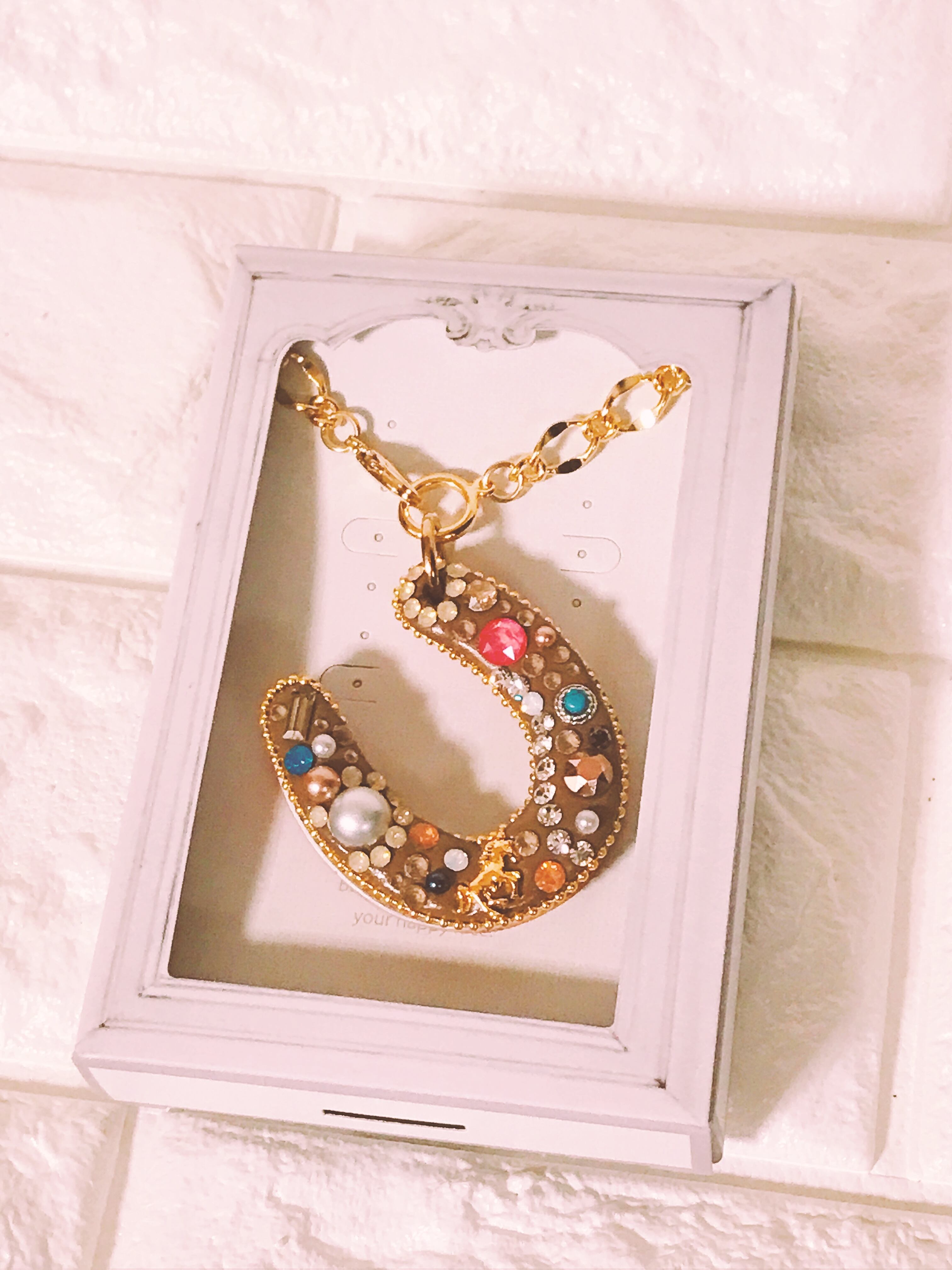 蹄鉄型バッグチャームはおもて面にオリエンタルをイメージした配色のスワロフスキーを散りばめました。