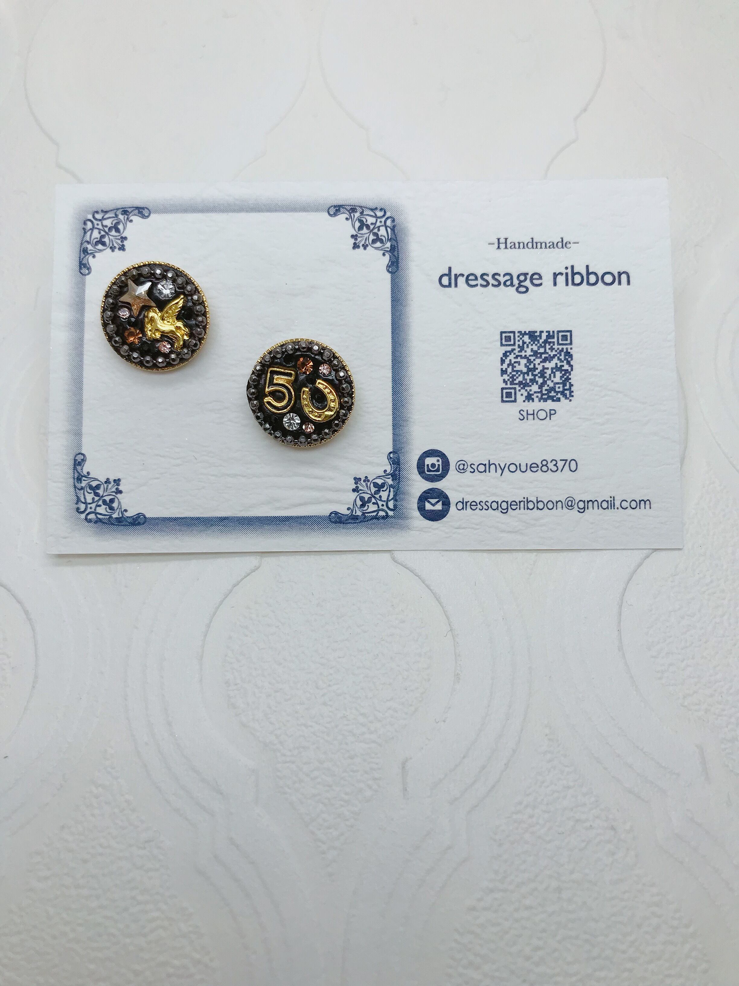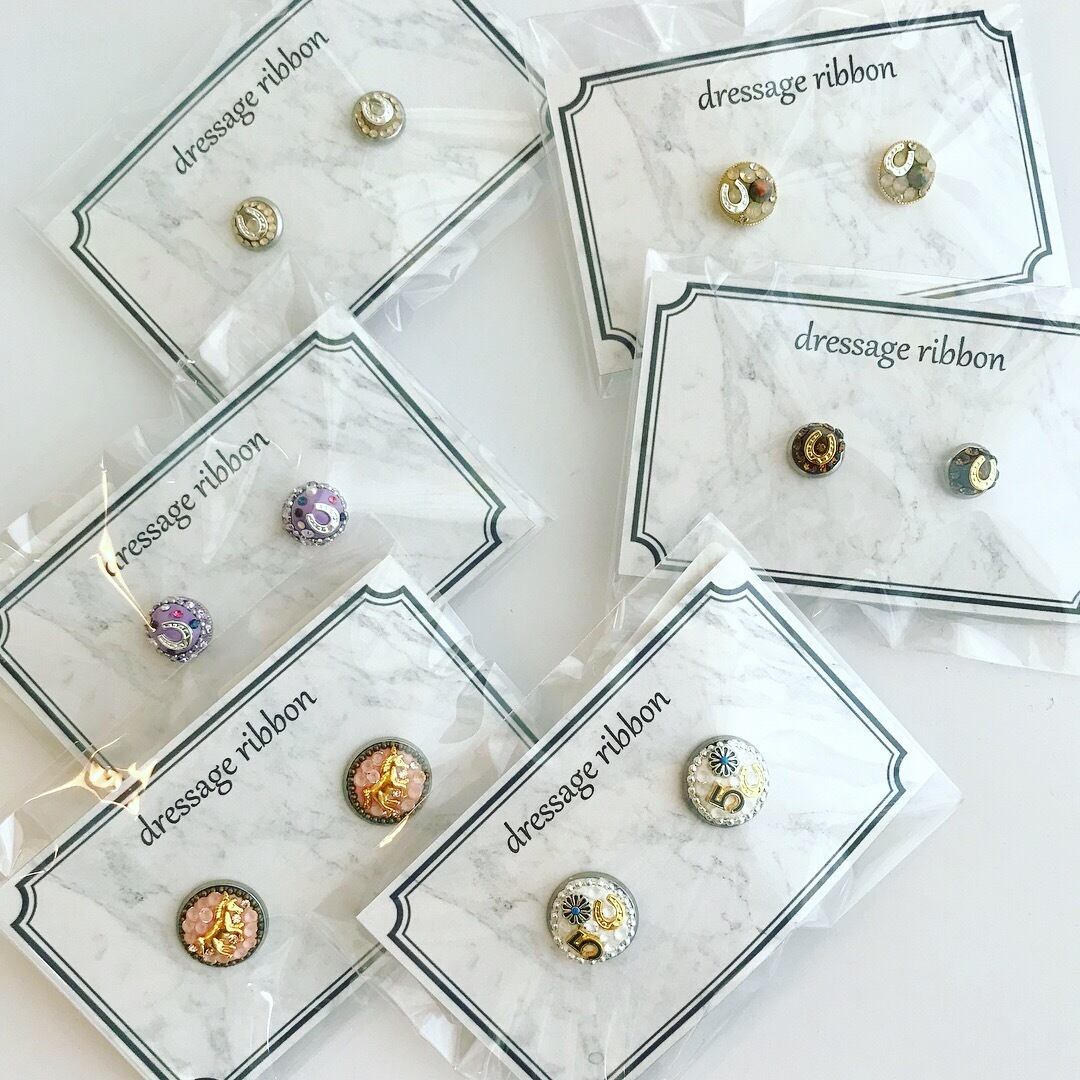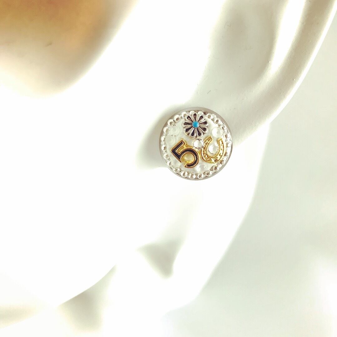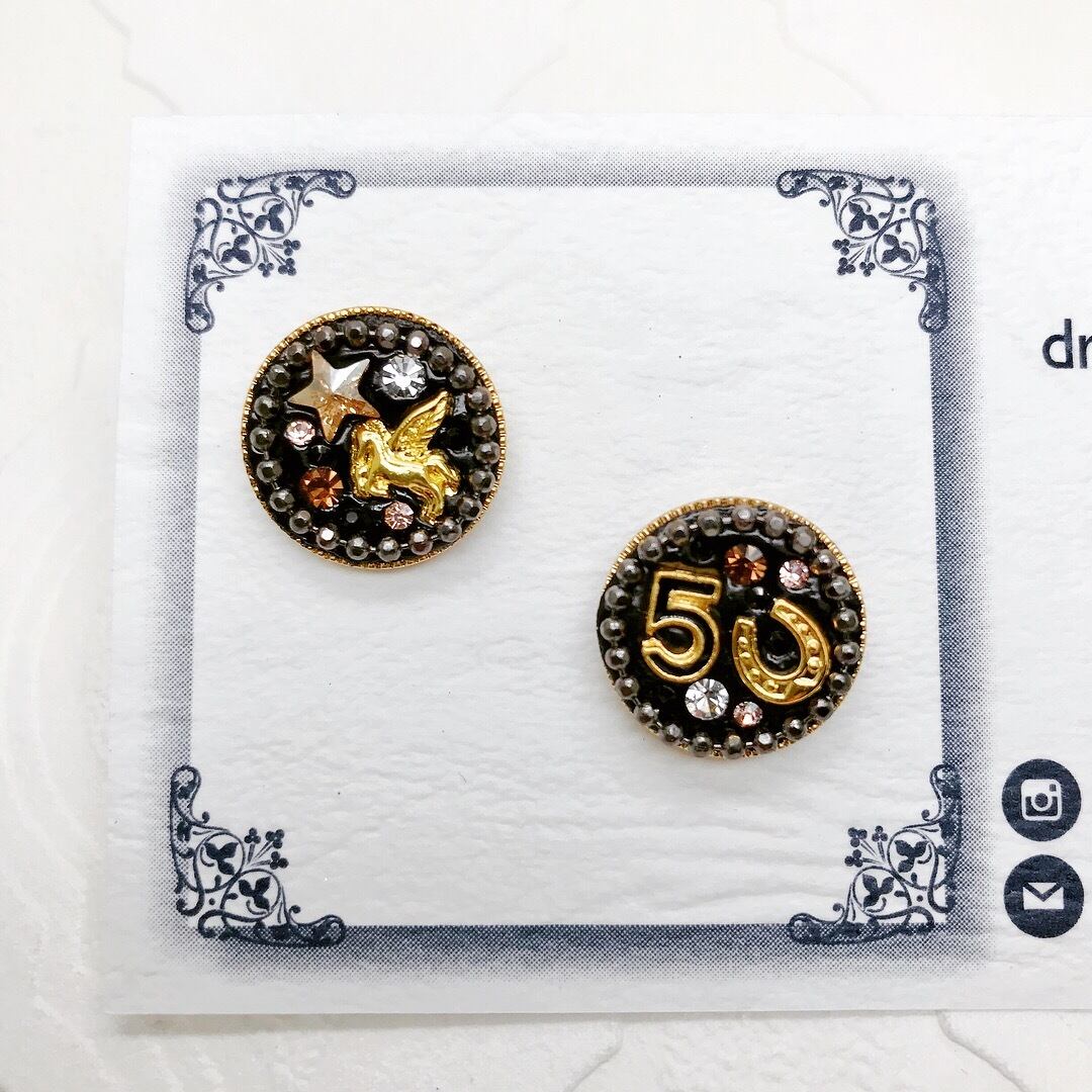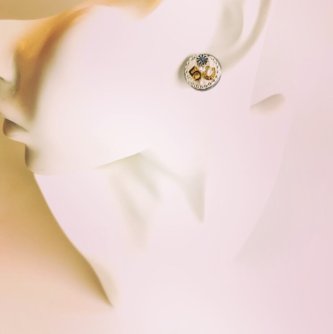 直径14mmサークルピアスに、ホワイトは馬蹄、NO.5、ターコイズ(トルコ石)、ブラックは馬蹄、スター、ペガサスのパーツをあしらったデザインです。