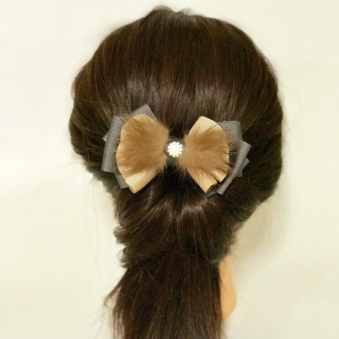 横幅10cm×縦5cmのコンパクトサイズリボンですので、バレッタをそのままハーフアップに使用したり、髪全体をゴムでまとめた上にバレッタをお使いいただけます。