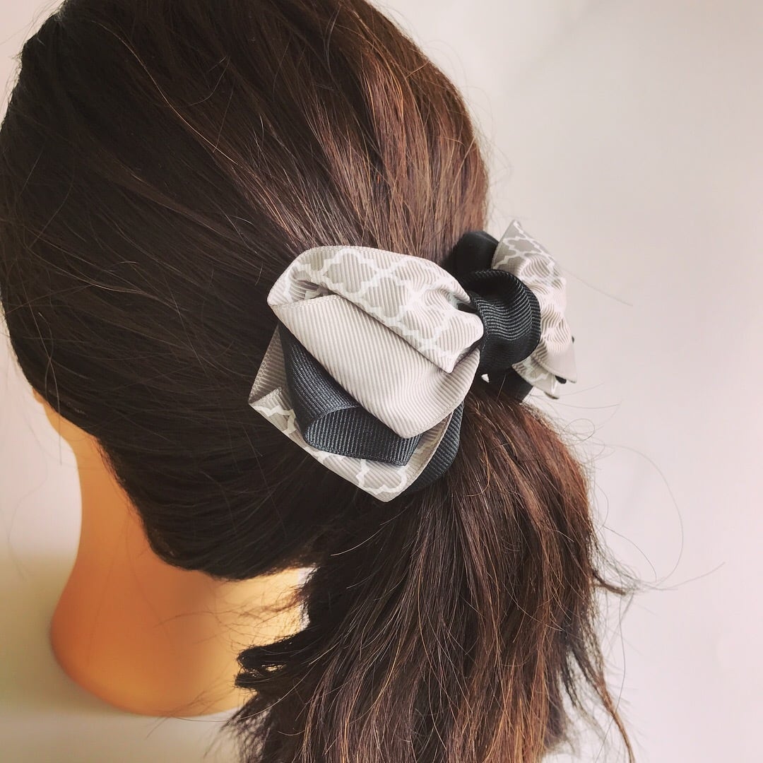 グレーモロッカン柄×ブラックリボンのヘアゴム