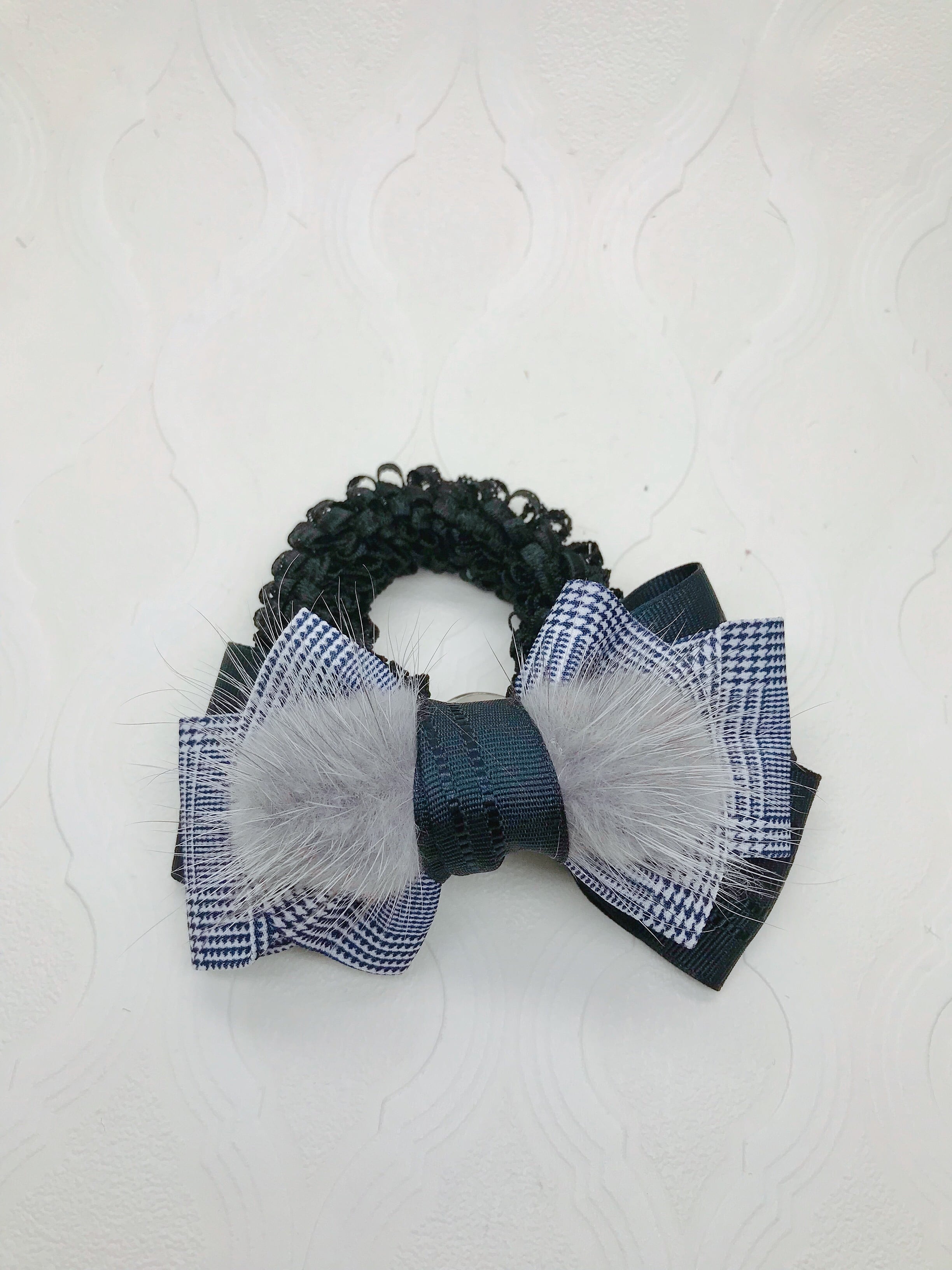 ネイビーチェックとミンクファーリボンのウーリーヘアゴム